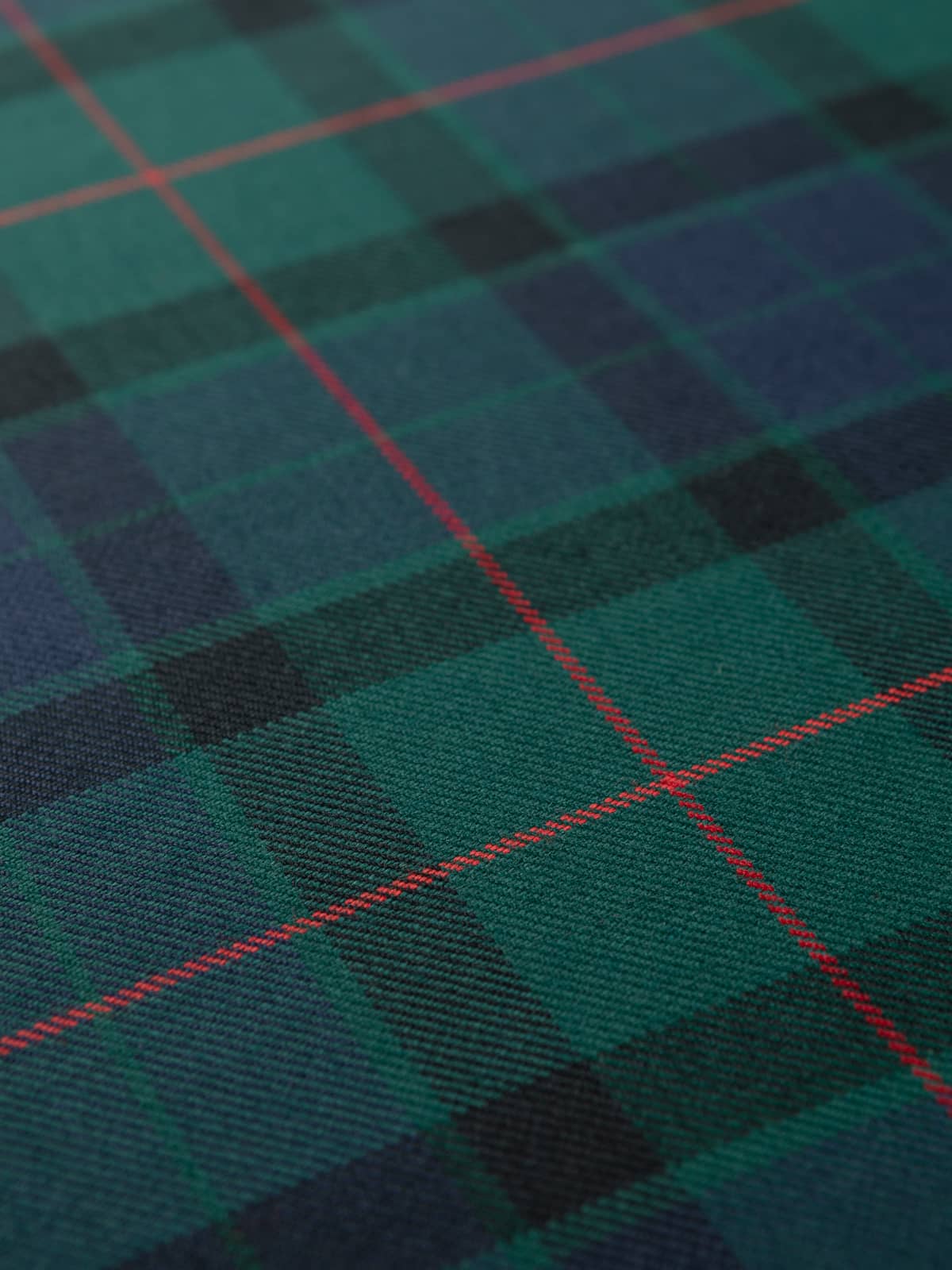A modern rendering of the traditional Gunn sett, built around alternating green and navy blocks framed by black bars. The distinctive red overstripe, a hallmark of the Gunn tartan, cuts cleanly through the pattern, adding contrast and historic identity. Modern dyes intensify the colours, giving the sett enhanced clarity and definition while maintaining its long-established structure.