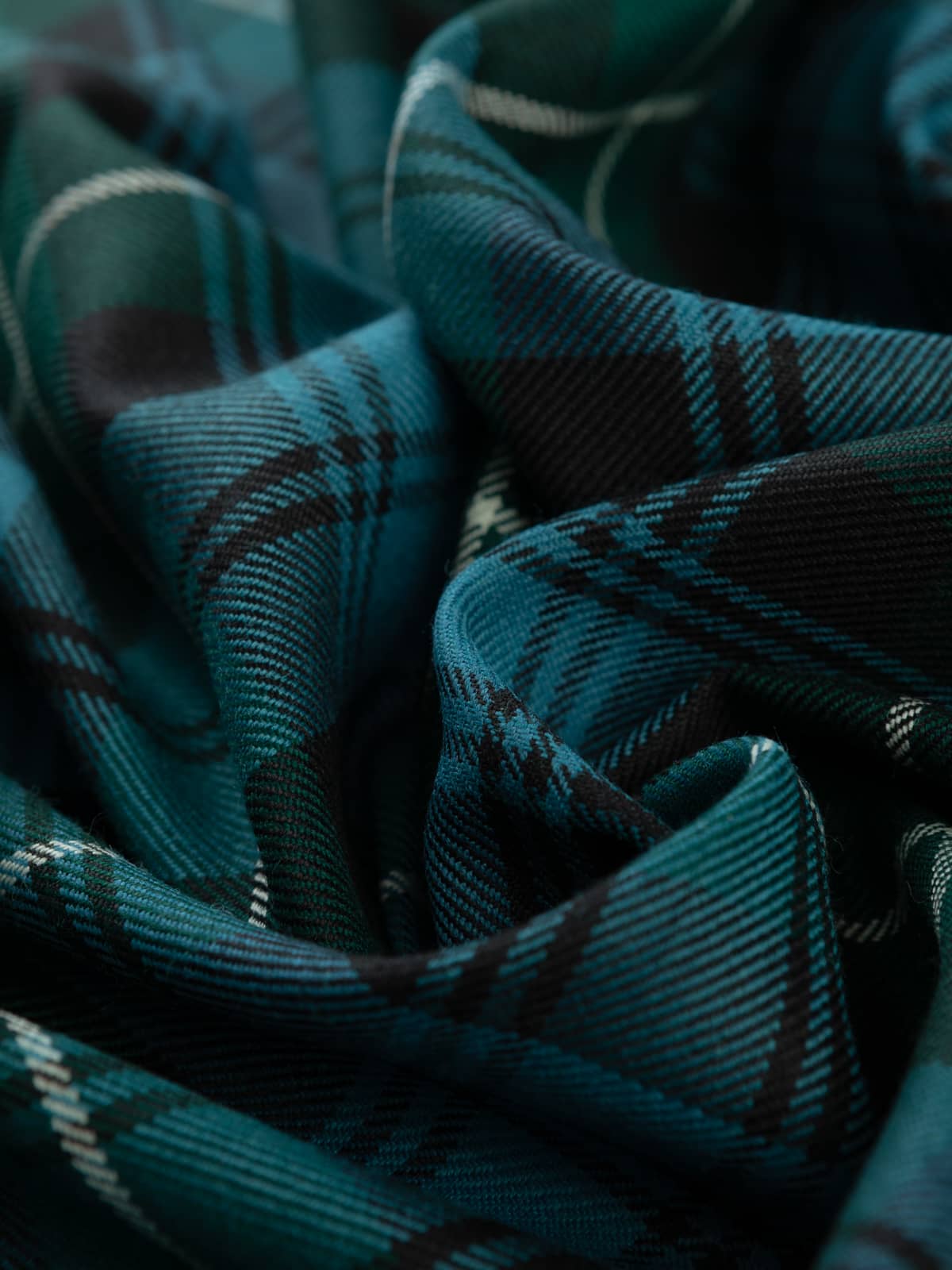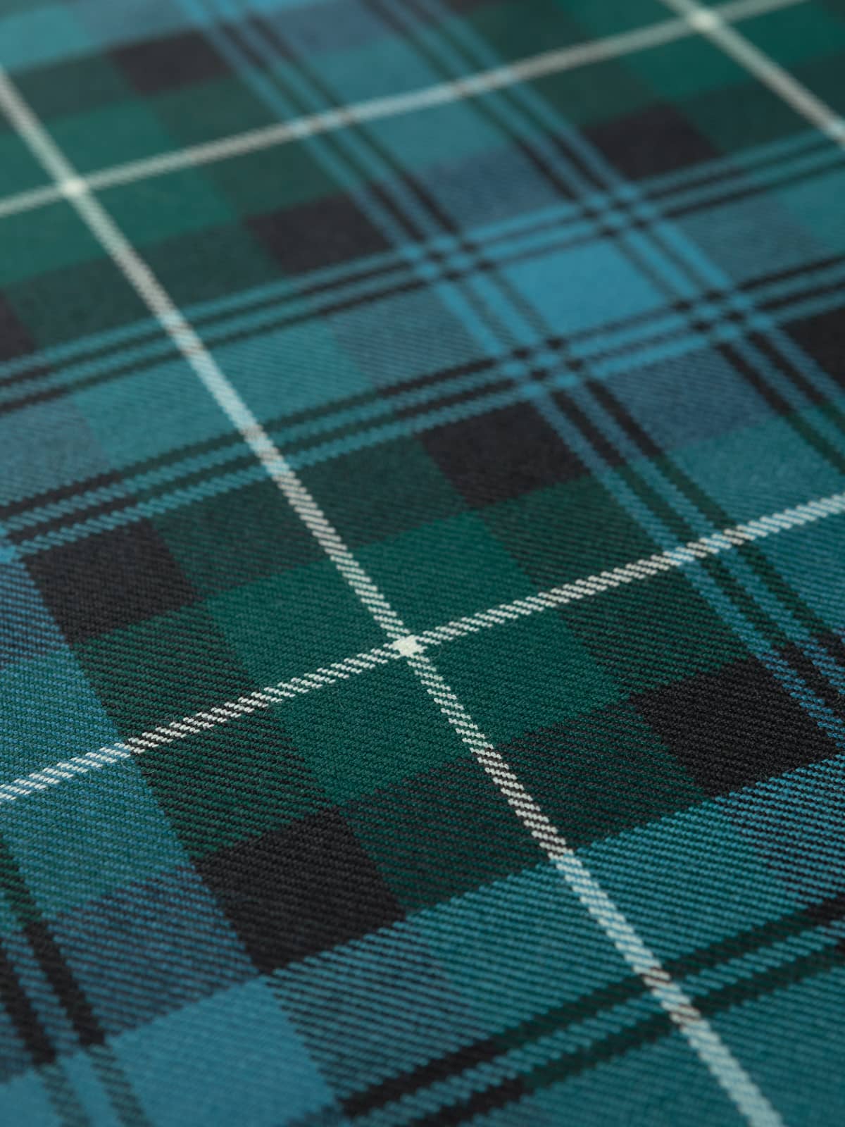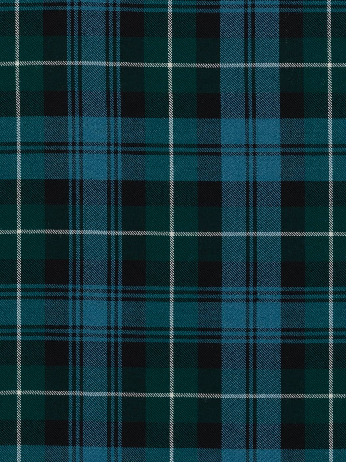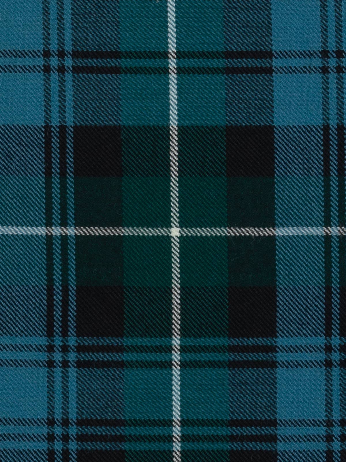 Shades: A softened traditional palette featuring sea‑blue and emerald green as the main tones, joined by charcoal black and pale stone grey highlights. The colours are gently desaturated in keeping with the Ancient dye style, giving the tartan a cool, weathered appearance that feels natural and understated.