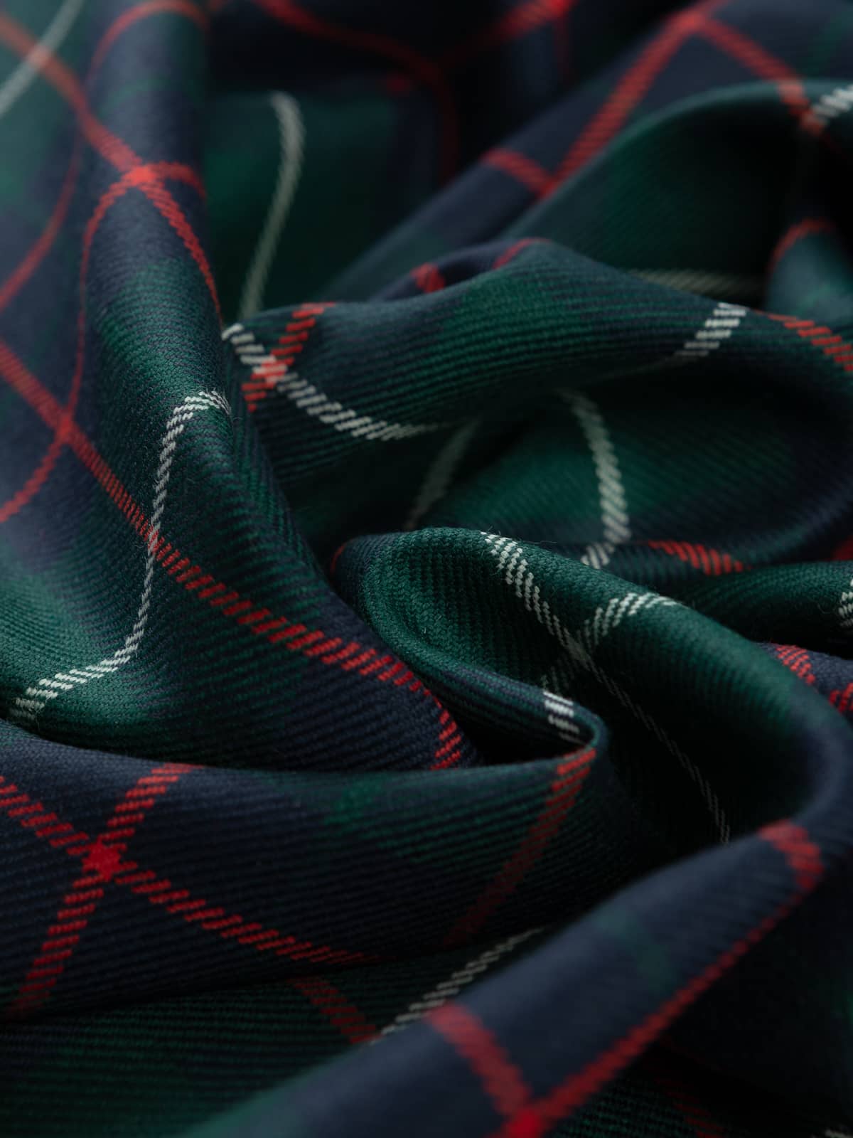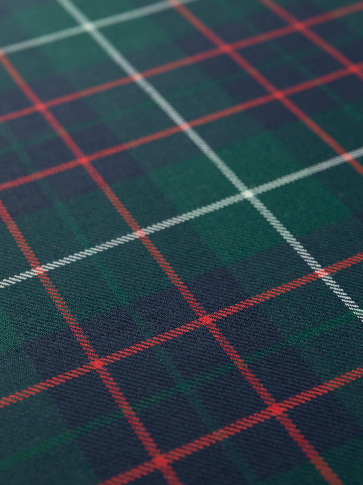 Design: A modern rendering of the MacIntyre Hunting sett, structured around alternating green and navy blocks typical of Highland hunting tartans. The pattern preserves the distinctive red grid, historically associated with the clan’s hunting variants, while the grey overlines sharpen the layout. Modern dyes intensify the depth of the base colours, producing a crisp, well‑defined sett.