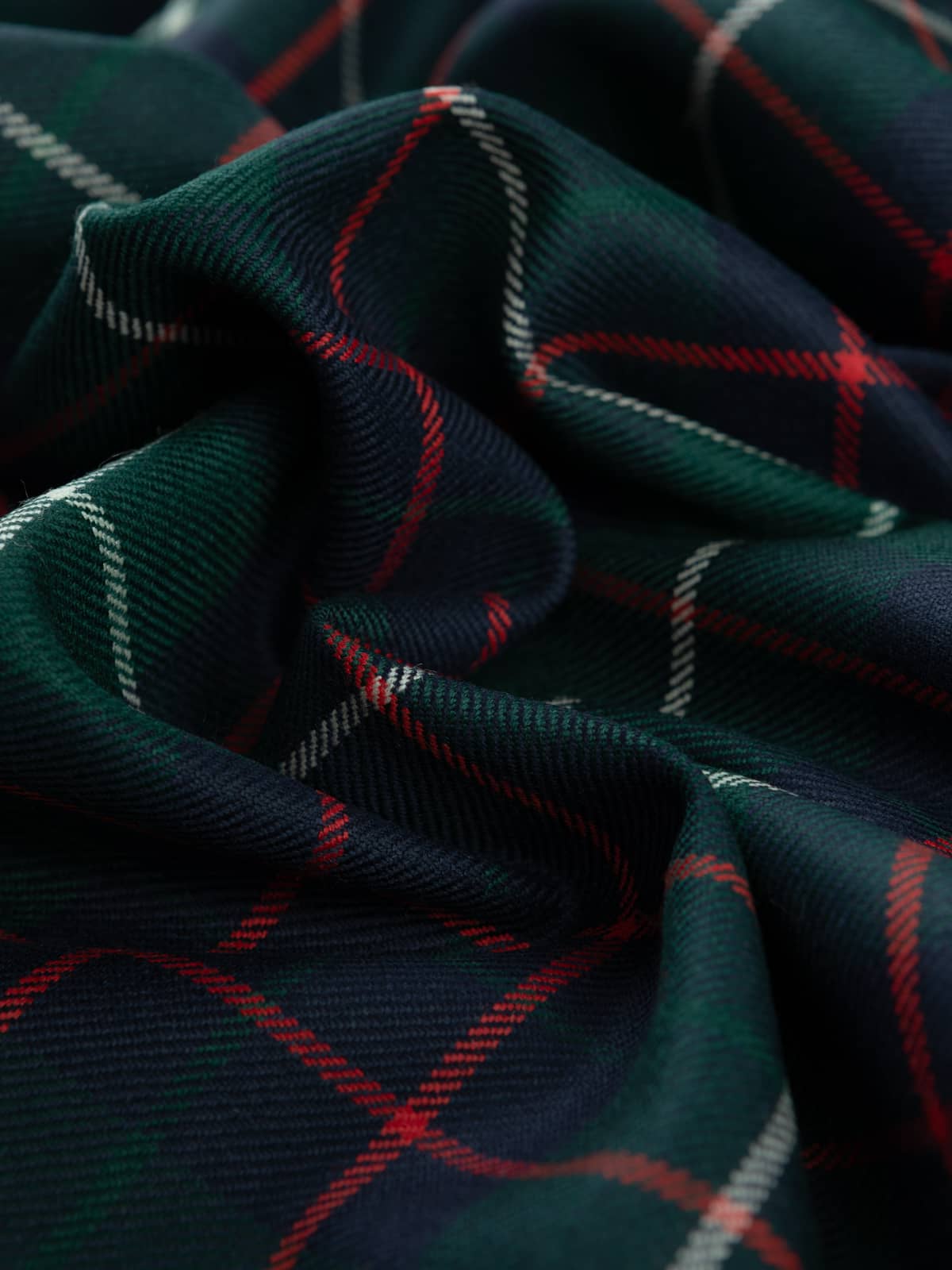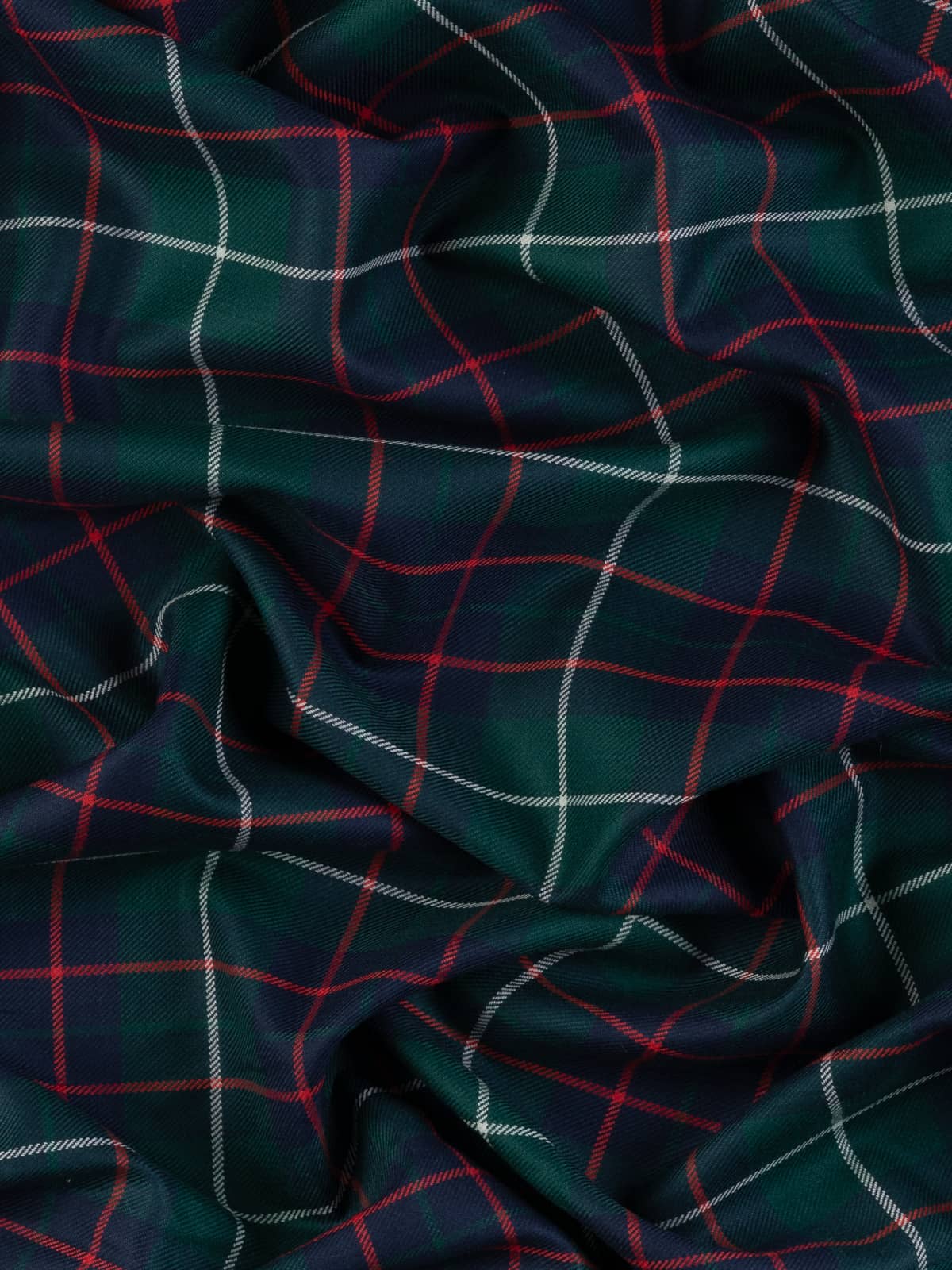 Shades: A rich modern hunting palette of deep forest green and dark navy, forming a cool, saturated base. These tones are accented with bright scarlet red overstripes and clean light‑grey framing lines. The colours are bold yet balanced, giving the tartan clear definition and a strong outdoor character.