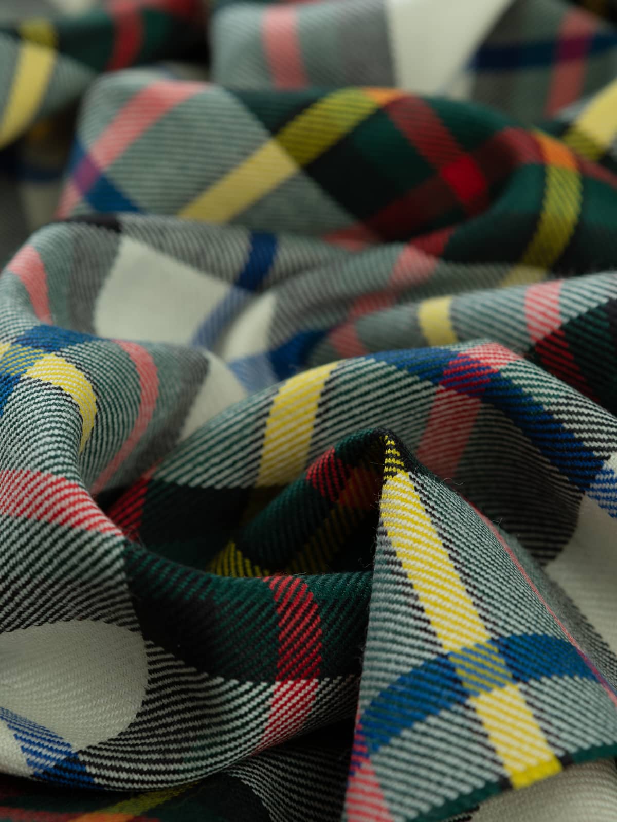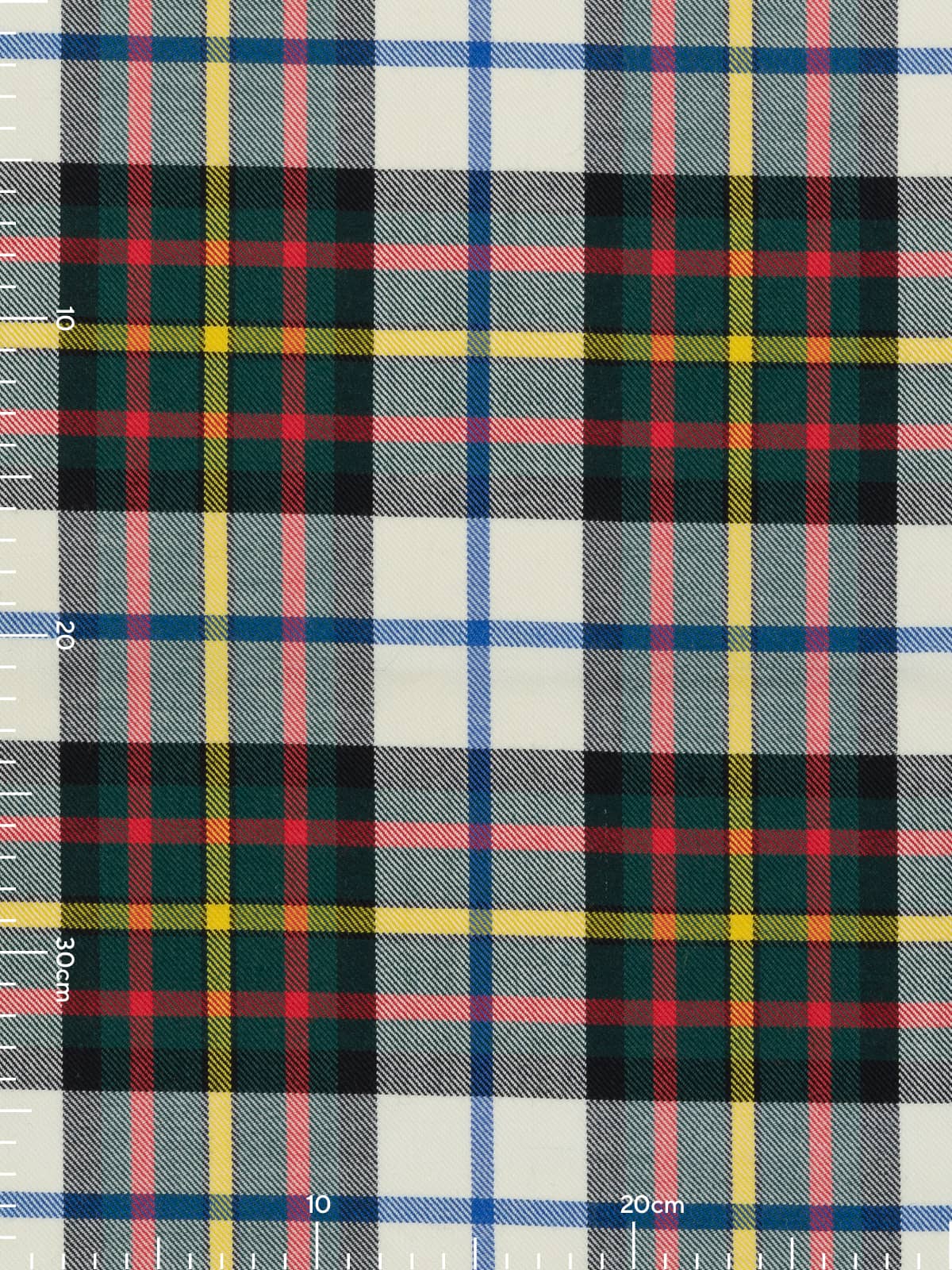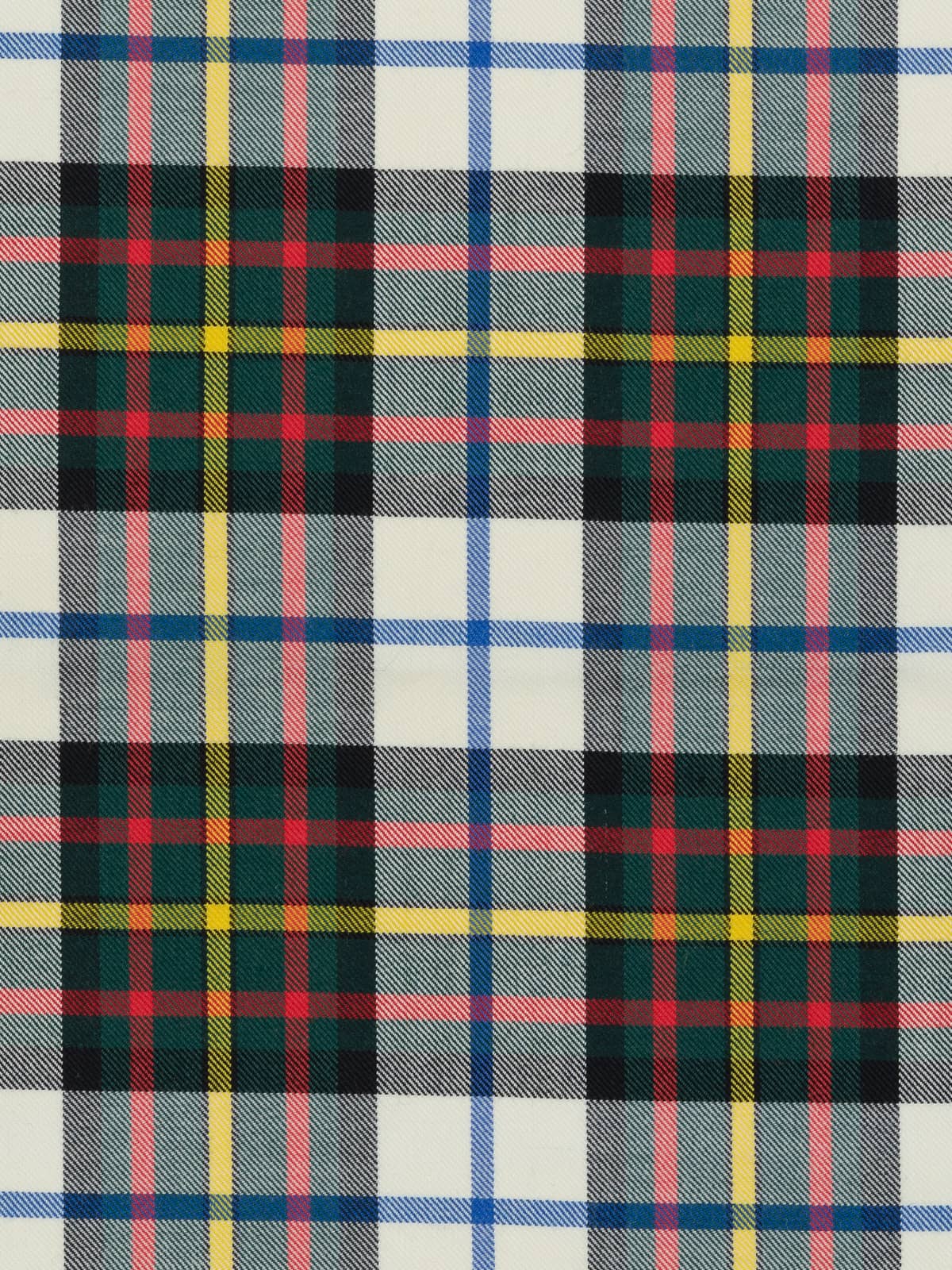 Design: A Dress adaptation of the classic MacLaren sett, created in 1981 by modifying the original pattern: the usual blue ground is replaced with white, while the core geometry, including the green, black and red blocks, is retained. Fine yellow and blue overstrips intersect the white ground, maintaining the rhythm and structure of the original MacLaren layout.