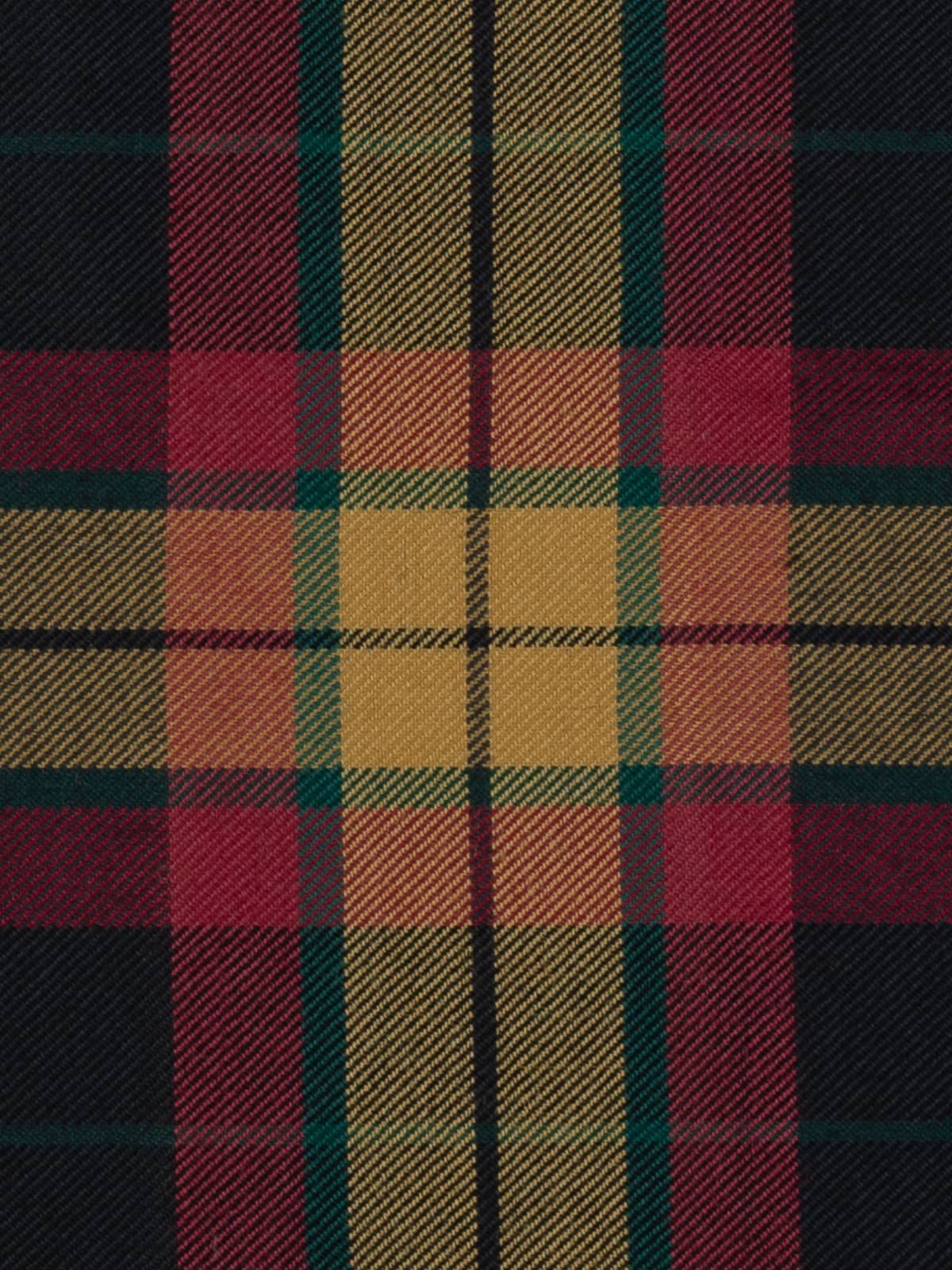 Design: A muted version of the MacMillan Hunting sett, traditionally built on red and green blocks crossed by gold and black lines. In the muted palette, these colours are softened into woodland tones while retaining the clan’s hallmark structure. The olive‑gold stripe remains central to the design, reflecting the long association of Hunting setts with outdoor wear and subdued natural hues.