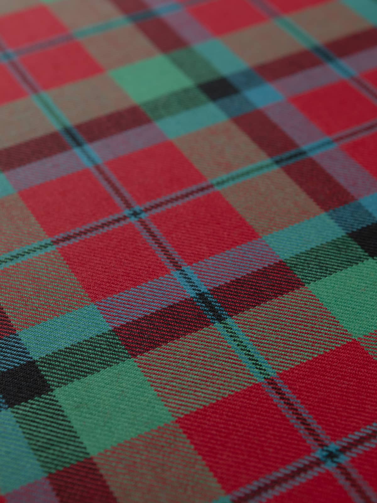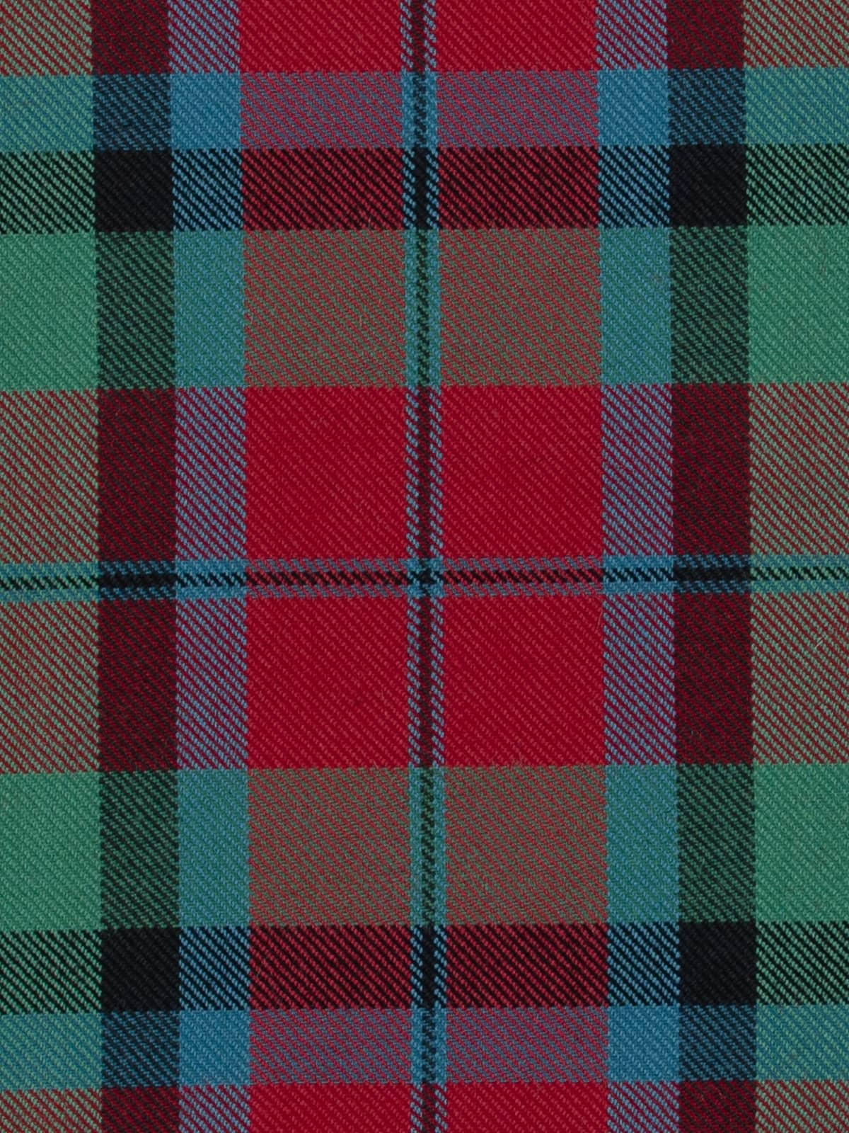 Design: A traditional MacNaughton sett composed of balanced red blocks intersected with green and blue checks, framed by decisive black lines. The muted palette maintains fidelity to the original pattern while presenting it in a softer, more heritage‑toned form.