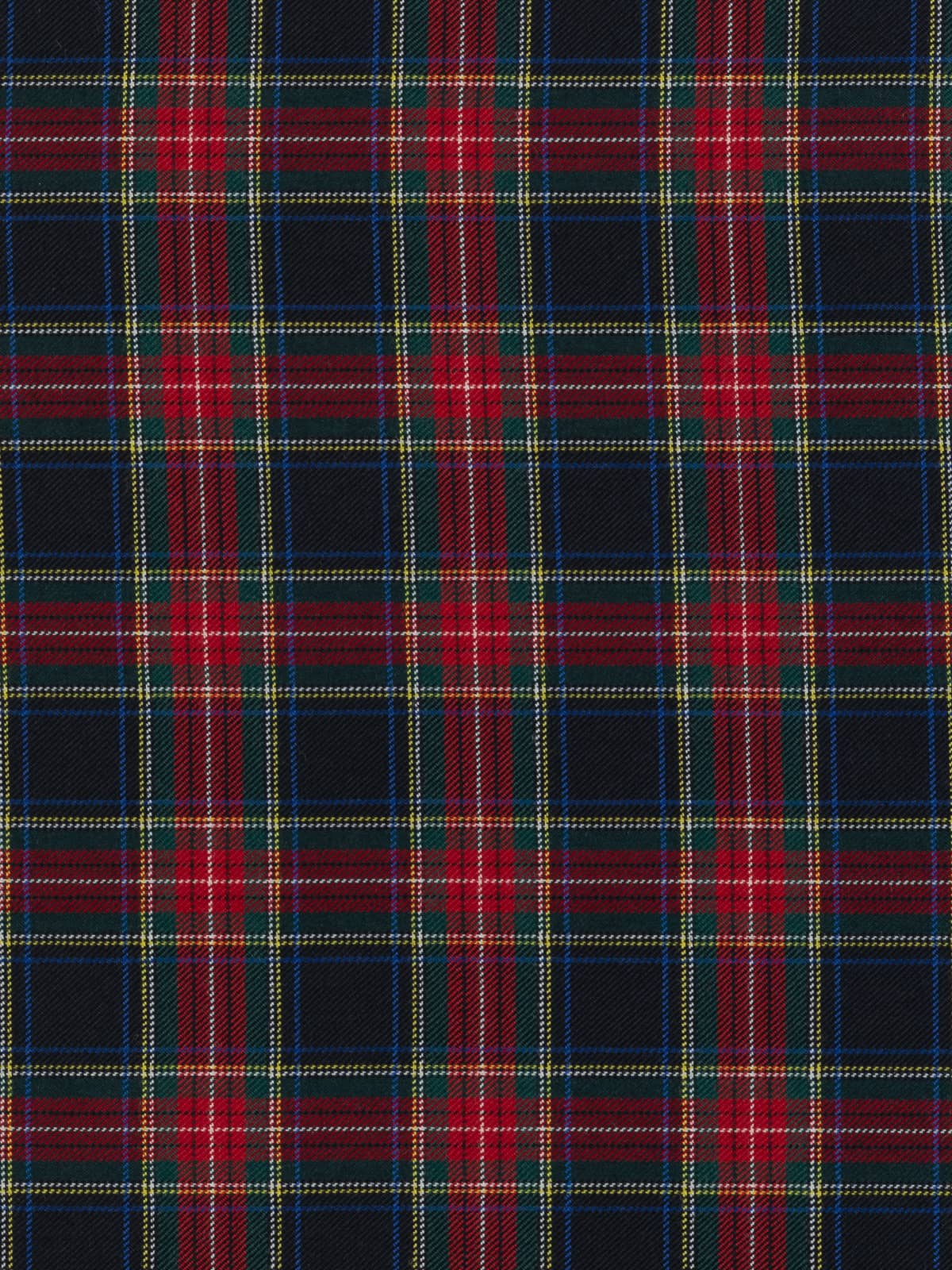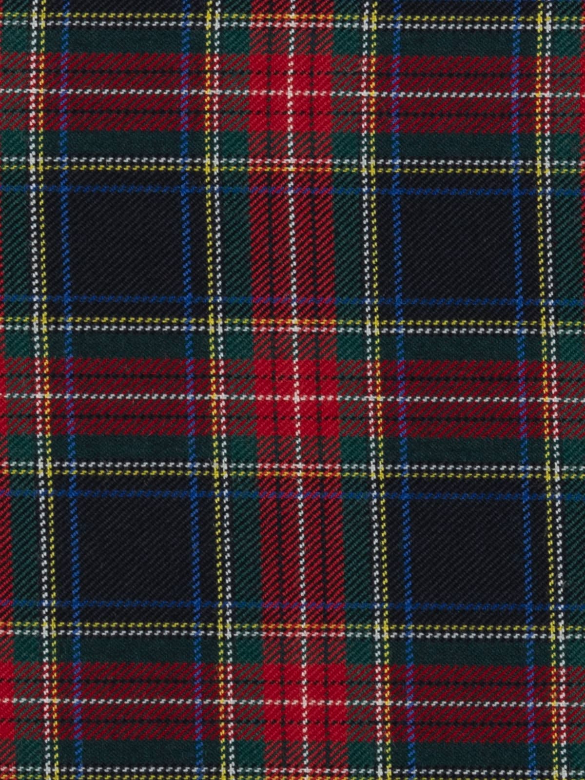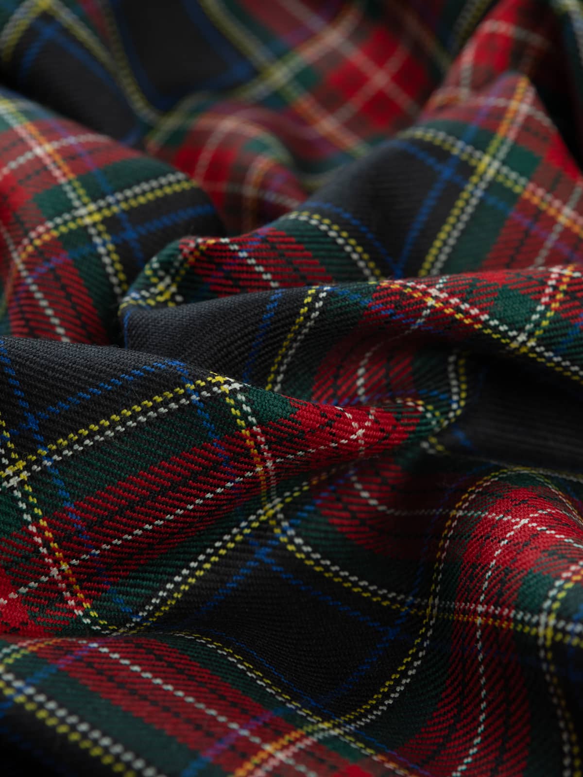Design: A compact version of the Stewart Black Modern sett, historically derived from the Stewart red patterns but grounded in black for a more formal, versatile look. In miniature form, the grid becomes tighter and more intricate, with red and green stripes repeating frequently across the dark base. The classic Stewart overstripes, yellow, white and blue, remain, preserving the lineage while adapting it for small‑scale use in accessories and fine tailoring.