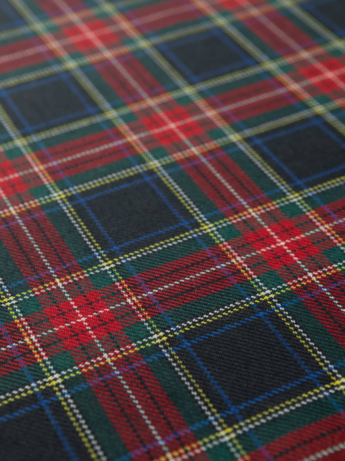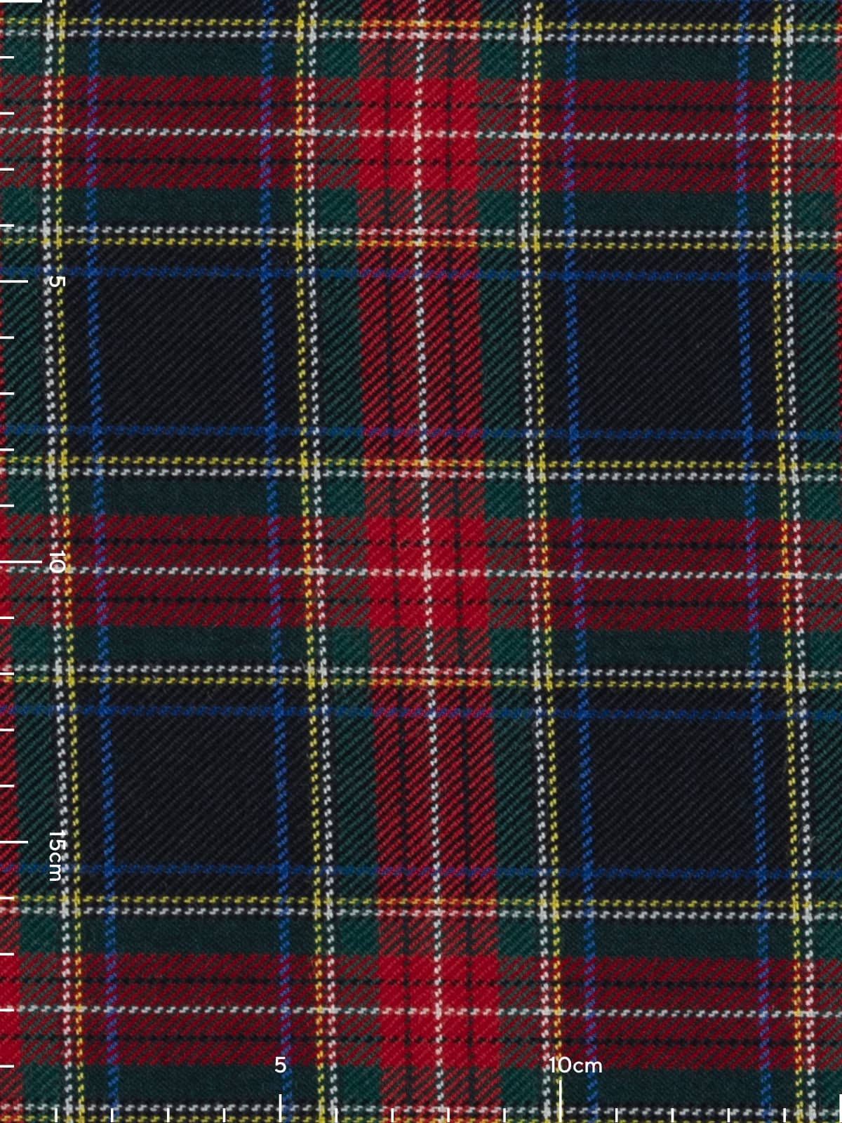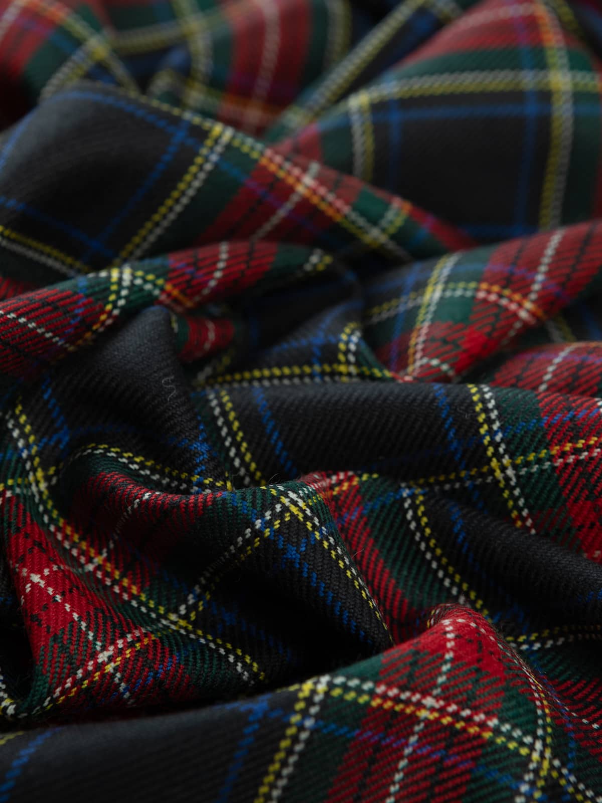 Design: A compact version of the Stewart Black Modern sett, historically derived from the Stewart red patterns but grounded in black for a more formal, versatile look. In miniature form, the grid becomes tighter and more intricate, with red and green stripes repeating frequently across the dark base. The classic Stewart overstripes, yellow, white and blue, remain, preserving the lineage while adapting it for small‑scale use in accessories and fine tailoring.