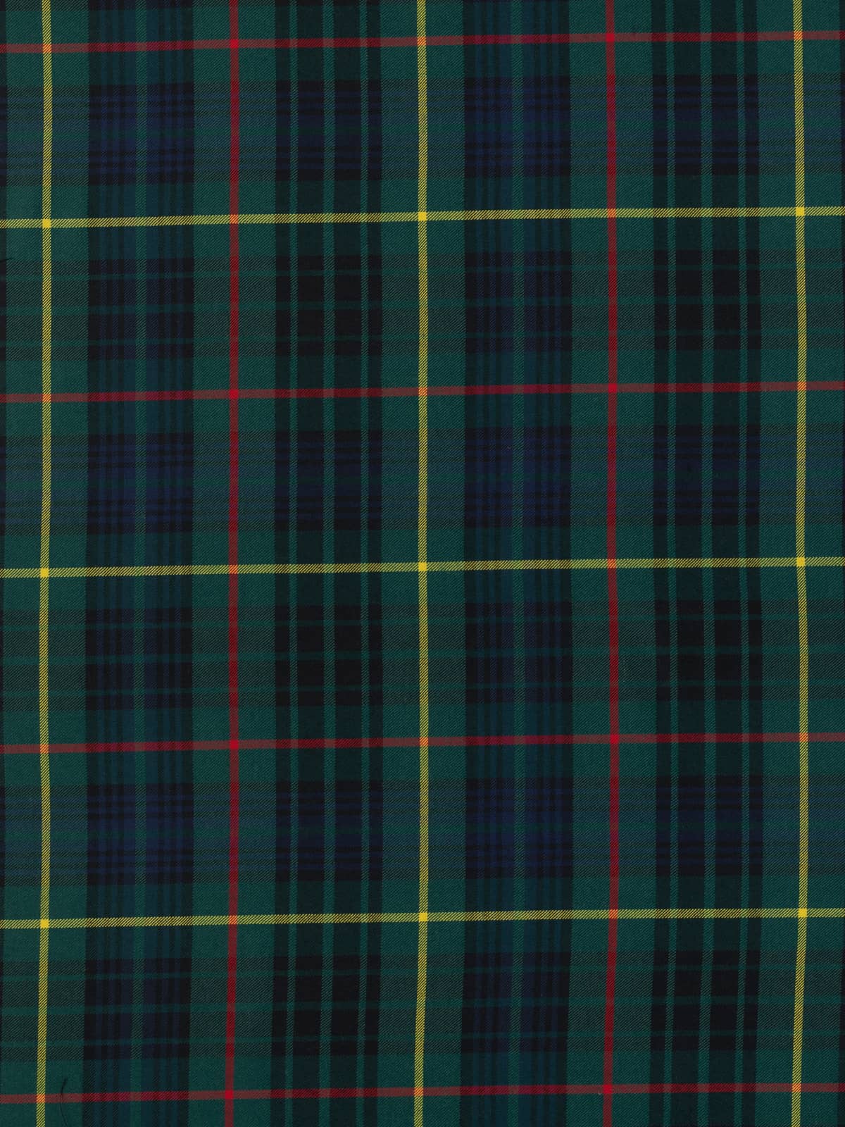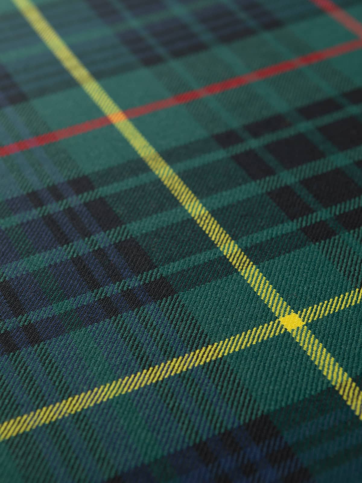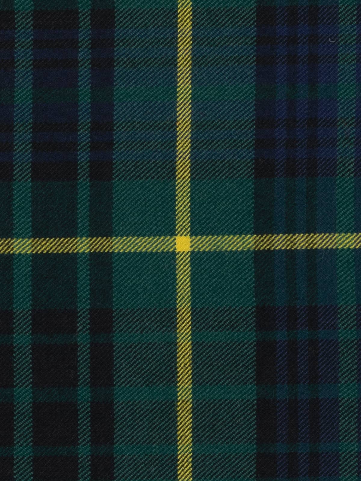 Design: A modern rendering of the Stewart Hunting sett, traditionally developed for outdoor wear. The structure retains the classic Stewart grid, with broad green and navy blocks intersected by red stripes and overlaid with prominent yellow lines. The dark, saturated colours reflect the modern practice of intensifying hunting tartans while preserving historic clan layouts.