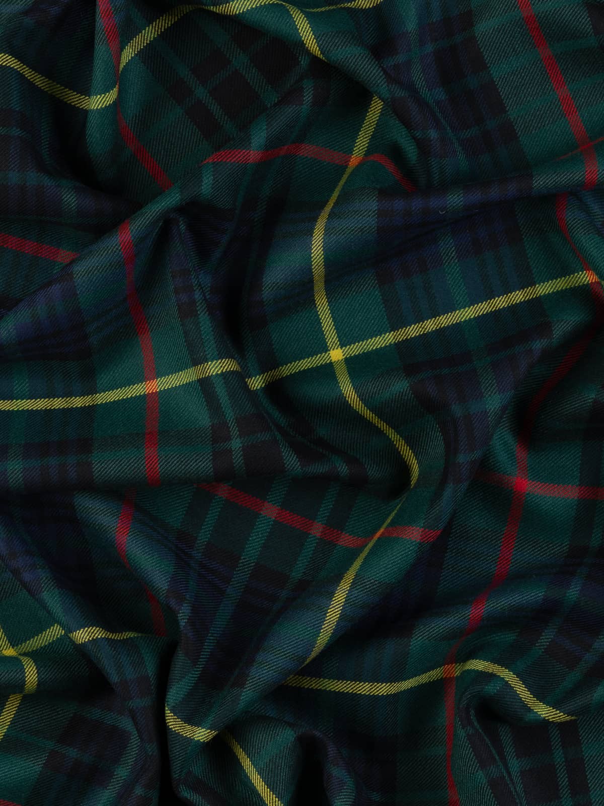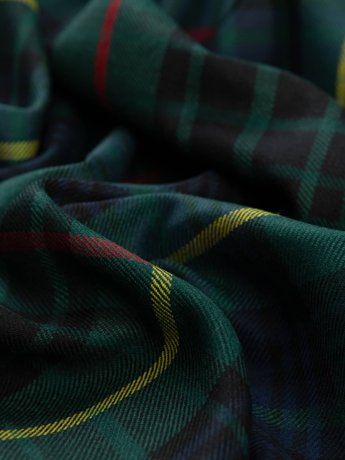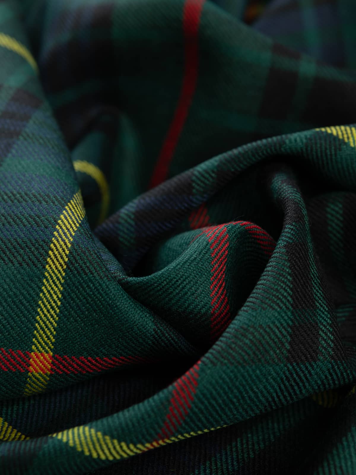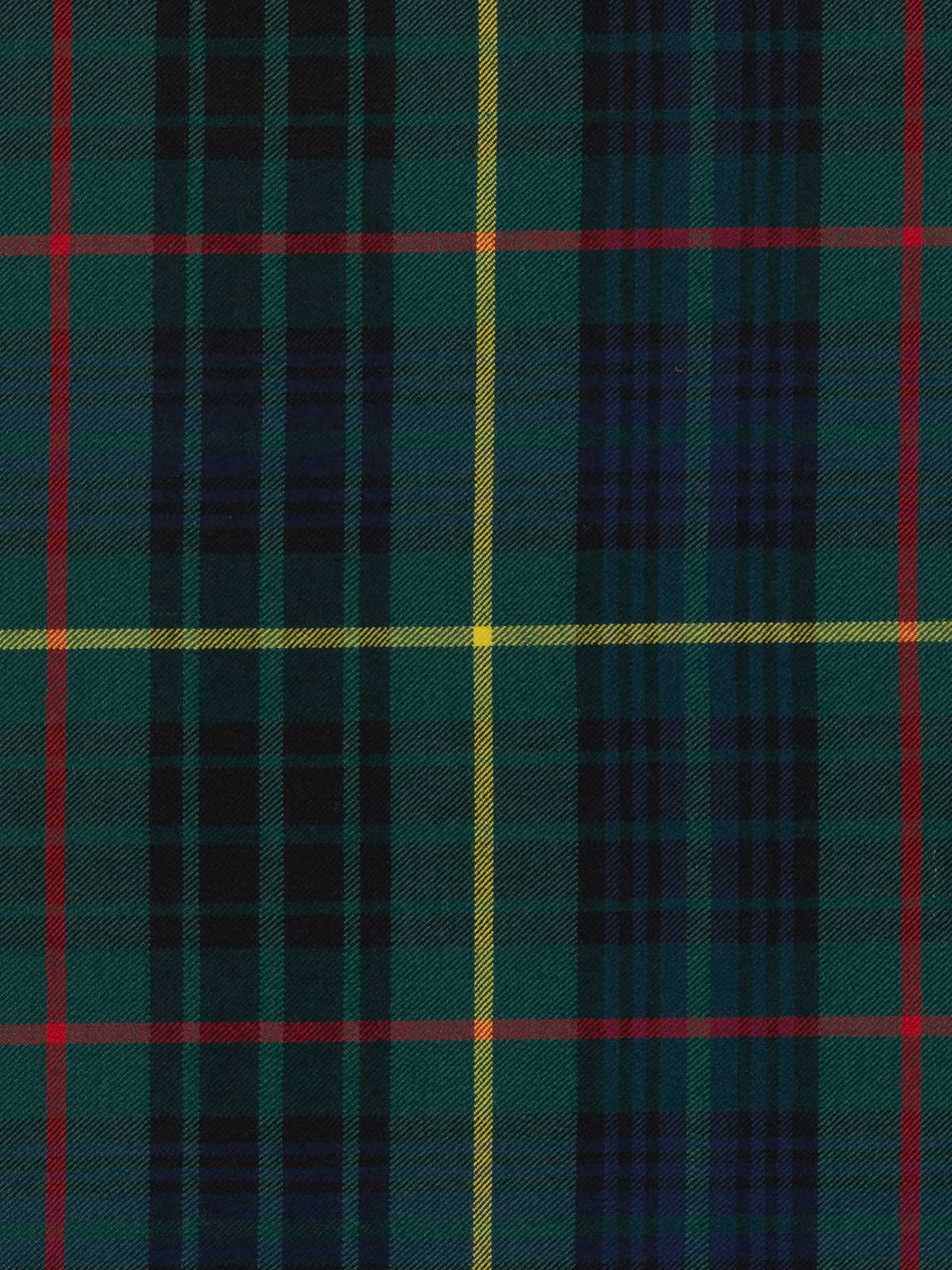 Design: A modern rendering of the Stewart Hunting sett, traditionally developed for outdoor wear. The structure retains the classic Stewart grid, with broad green and navy blocks intersected by red stripes and overlaid with prominent yellow lines. The dark, saturated colours reflect the modern practice of intensifying hunting tartans while preserving historic clan layouts.