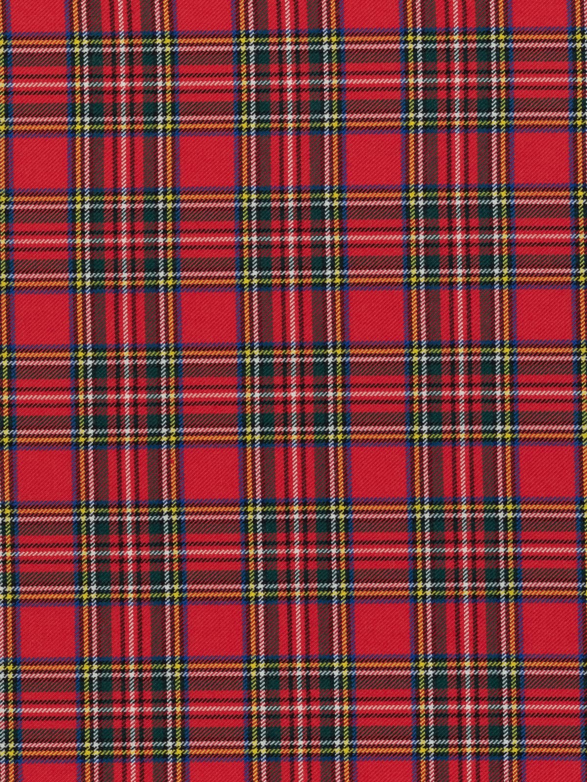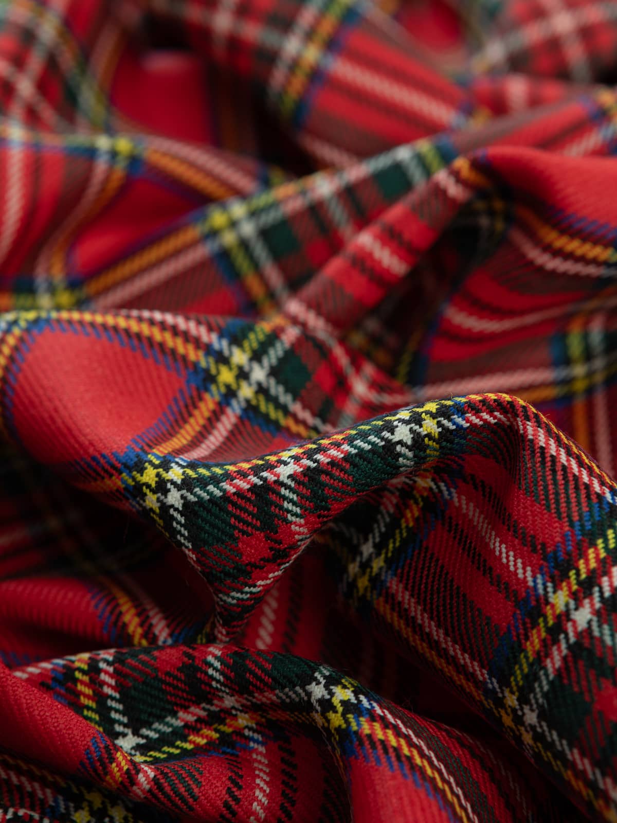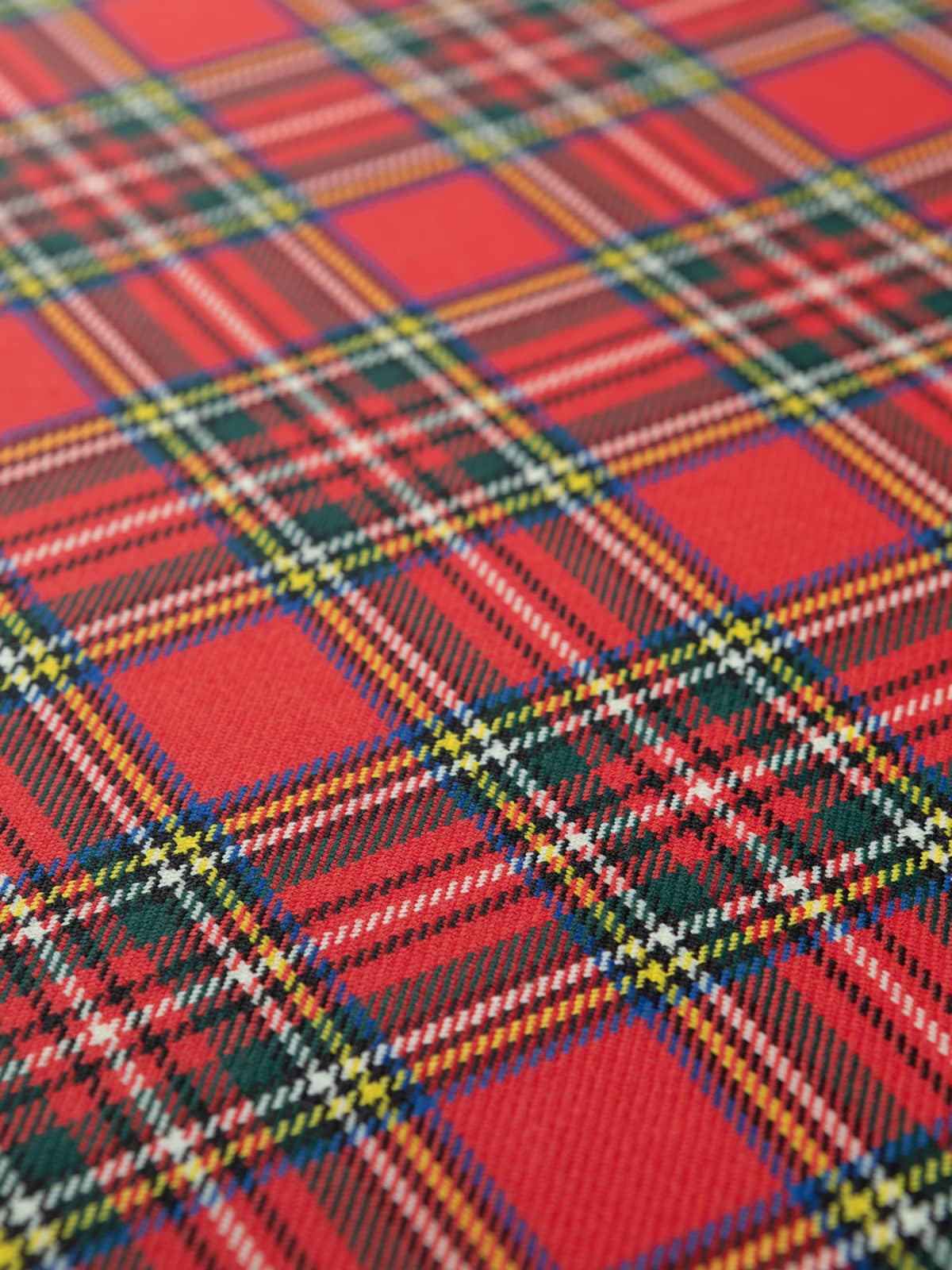 Design: A reduced‑scale version of the classic Stewart Red sett, traditionally associated with royal and ceremonial use. The miniature format tightens the grid, creating a dense, finely detailed pattern while preserving the Stewart hallmarks of red ground, green and navy blocks, and yellow overstripes. This scaled design reflects a long tradition of using miniature setts for accessories and finer garments.