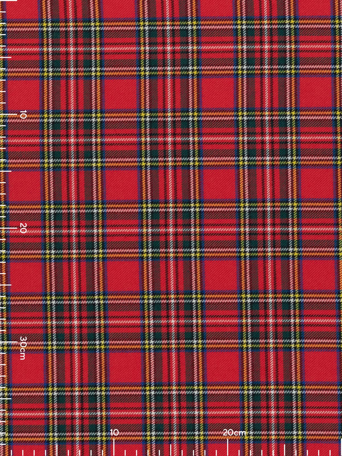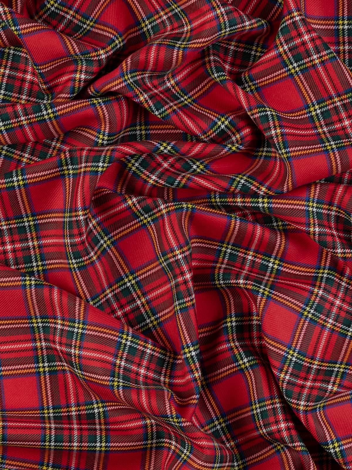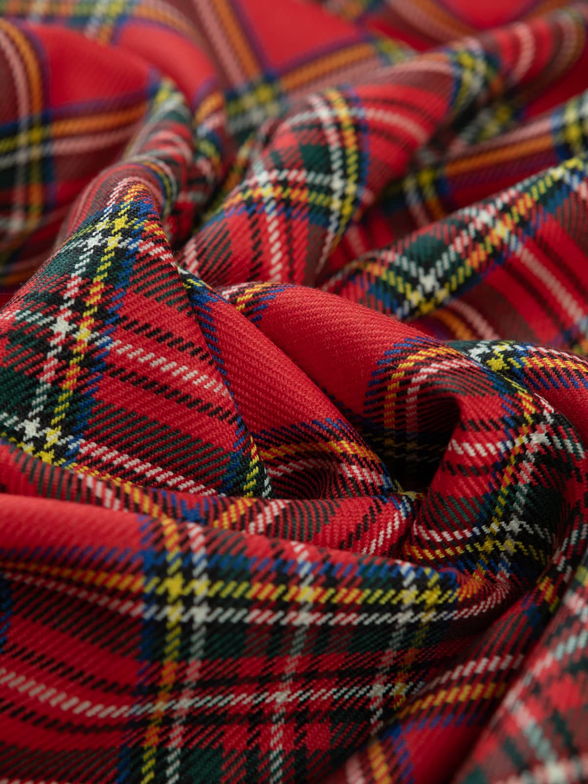 Design: A reduced‑scale version of the classic Stewart Red sett, traditionally associated with royal and ceremonial use. The miniature format tightens the grid, creating a dense, finely detailed pattern while preserving the Stewart hallmarks of red ground, green and navy blocks, and yellow overstripes. This scaled design reflects a long tradition of using miniature setts for accessories and finer garments.