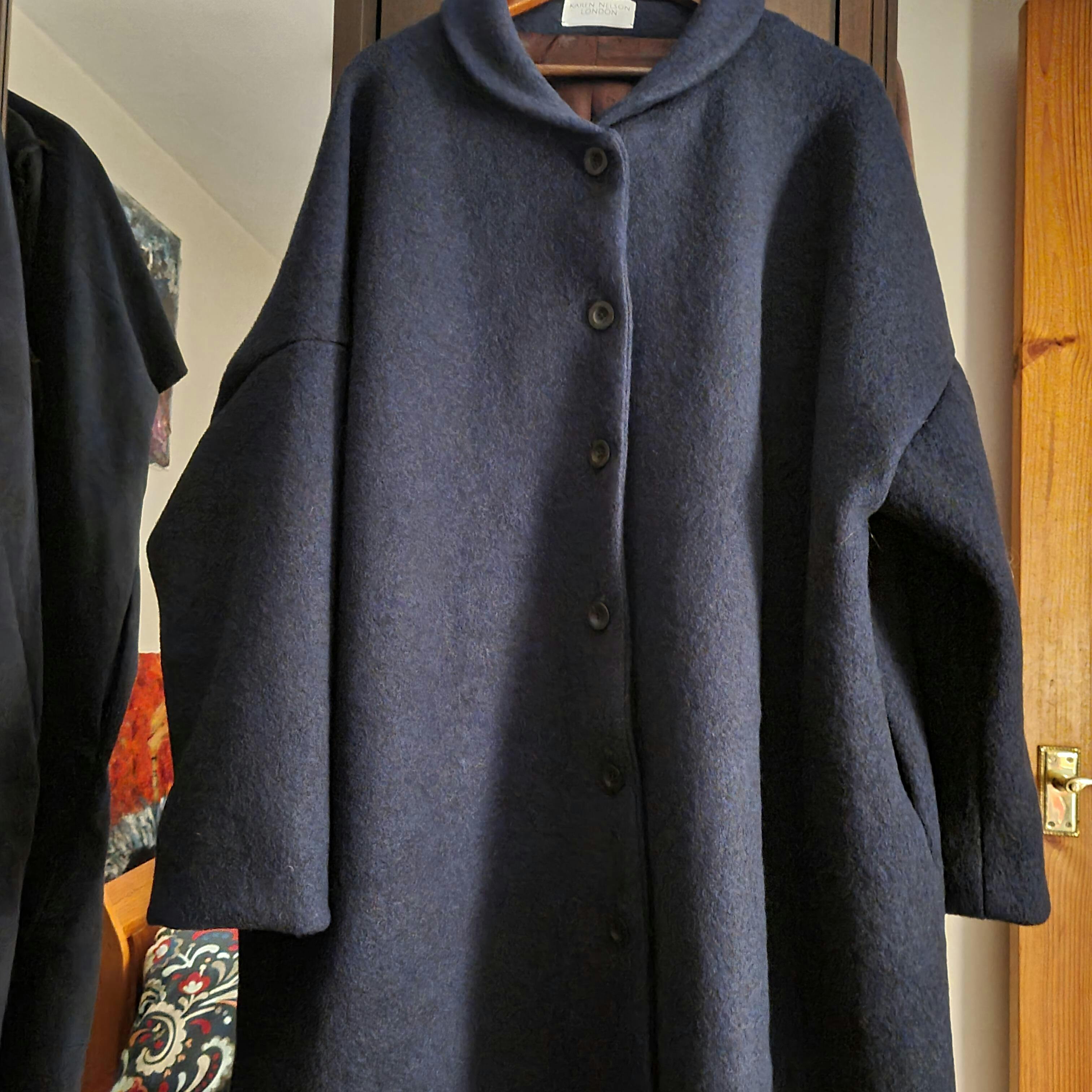 What does Boiled Wool feel like? If you own a big cosy pullover or thick warm cardigan, they are probably made using boiled wool fabrics. The texture is definitely woolly, but not itchy like wool tweed can be. Its nobbly & bobbly finish is created as the fabric is washed and shrunk during manufacture, creating a dense, cosy finish. The nobbliness and bobbliness adds depth to plain colours and makes a clean and smart style that suits unstructured garments, as well as being warm and naturally insulating