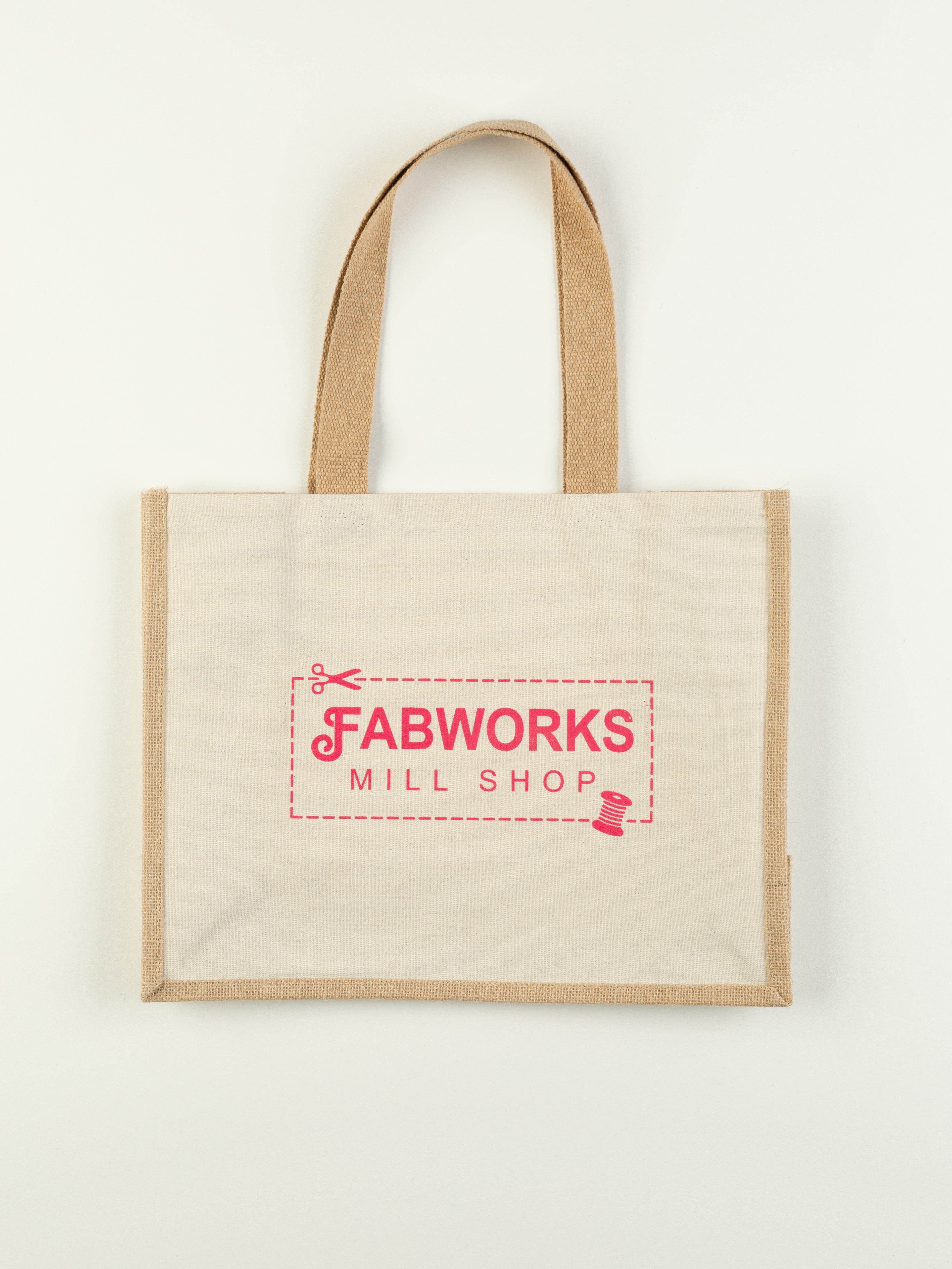 Introducing the Fabworks Mill Shop Tote Bag, thoughtfully designed for makers who appreciate quality, practicality, and a touch of everyday charm. Crafted from a premium blend of cotton canvas and jute, this sturdy and spacious bag is made to support you through every stage of your creative life.
