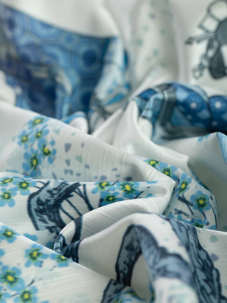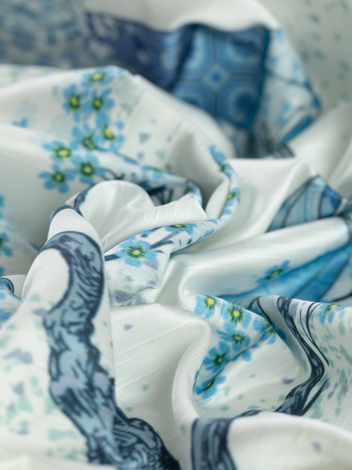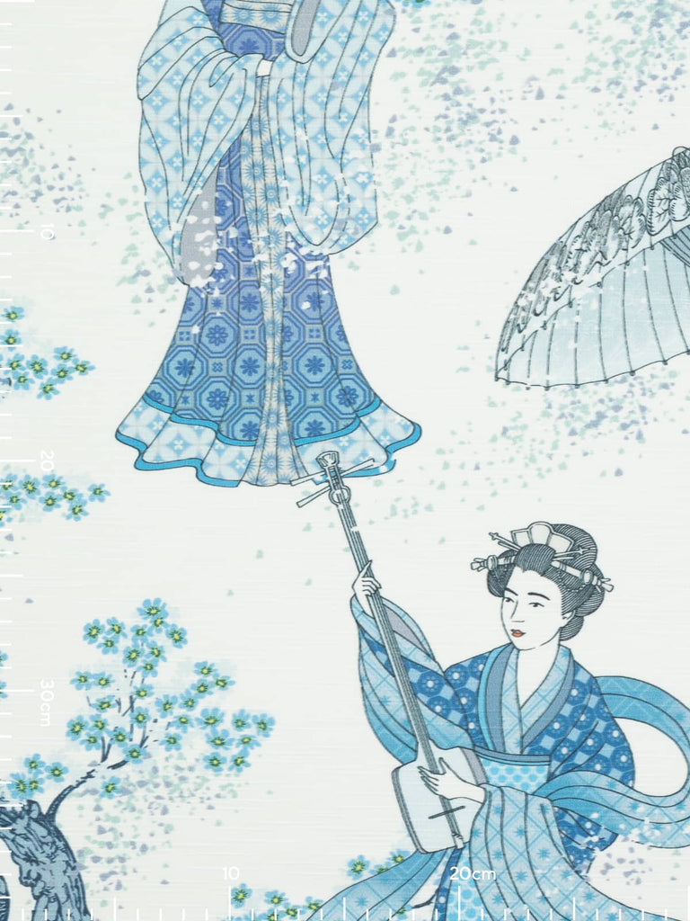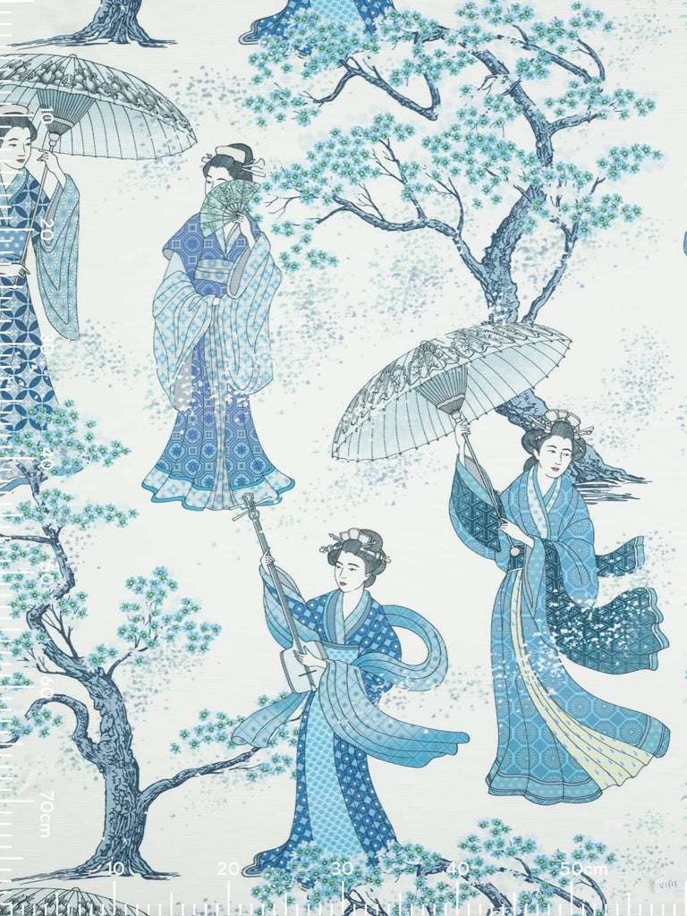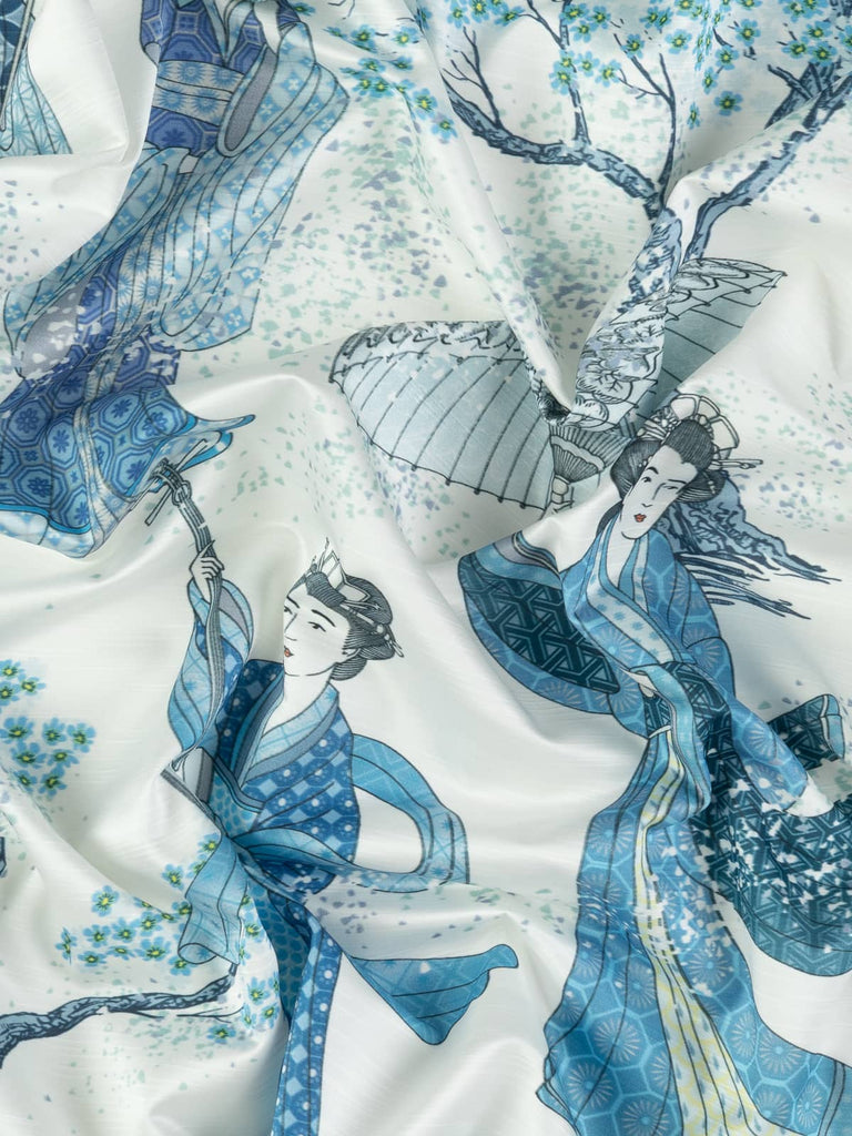 Shade: Geisha China Blue is printed with a classic porcelain blue palette onto a silken, gleaming white base. These timeless ceramic blue tones form a cool and elegant style-perfect for classic interiors, whether you choose to create curtains or clothing.
