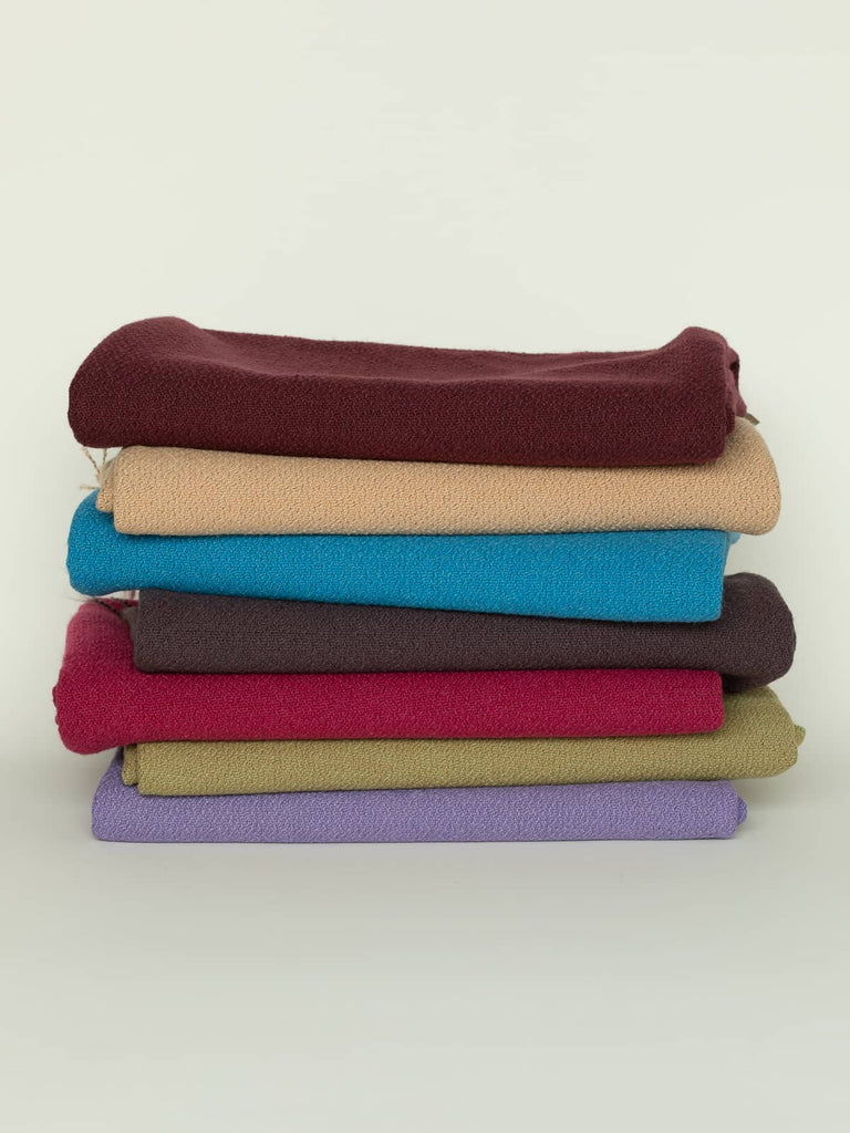 Design: A solid-hued, versatile, characteristically crinkled combination of fine and heavier gauge crepe yarns produces interesting all-over visual textural appeal, almost finely pebbled, with a staggered twill detailing that appears akin to a fine diamond weave (on the reverse) and a raised chevron-like design on the more textured face.