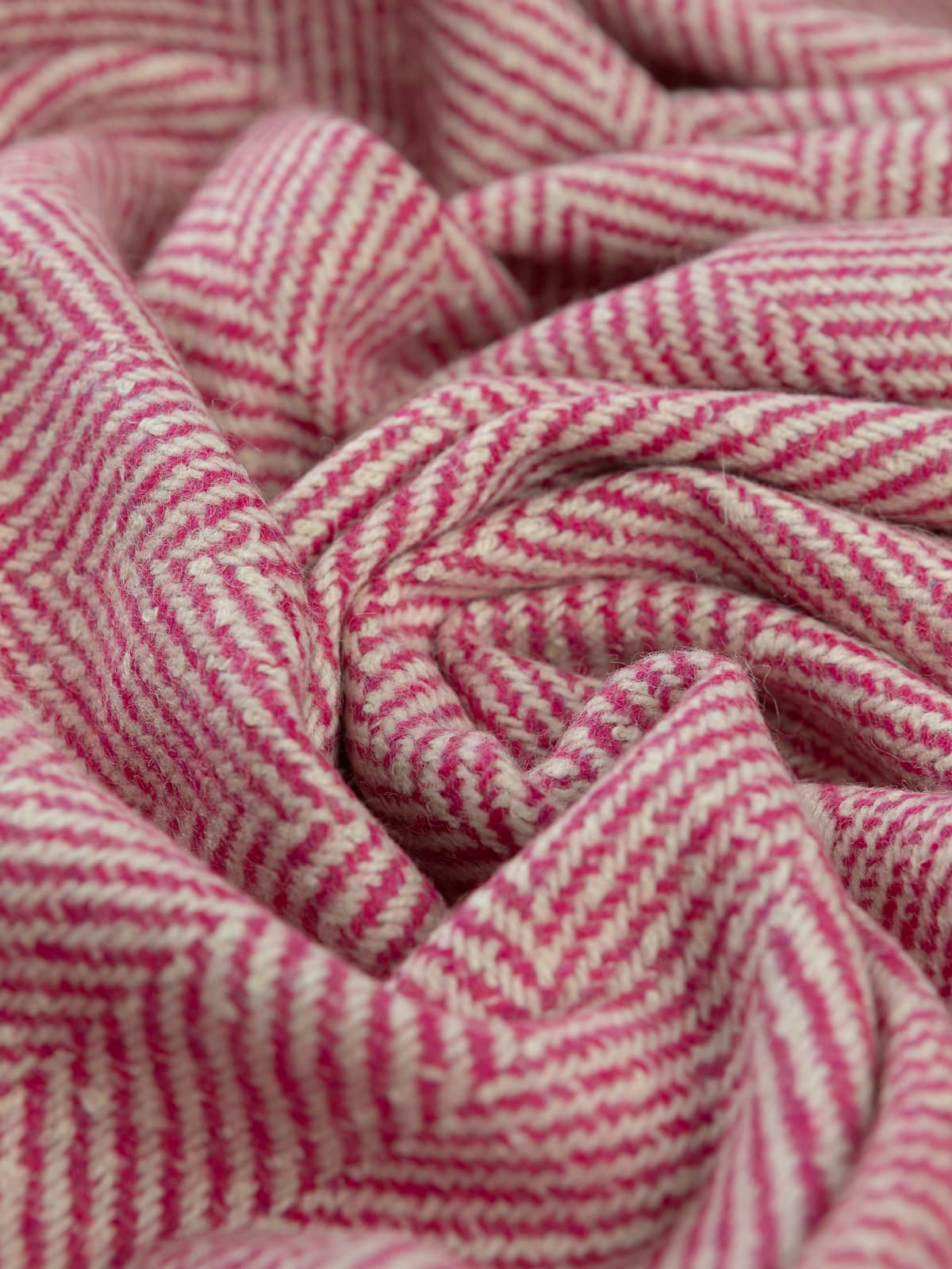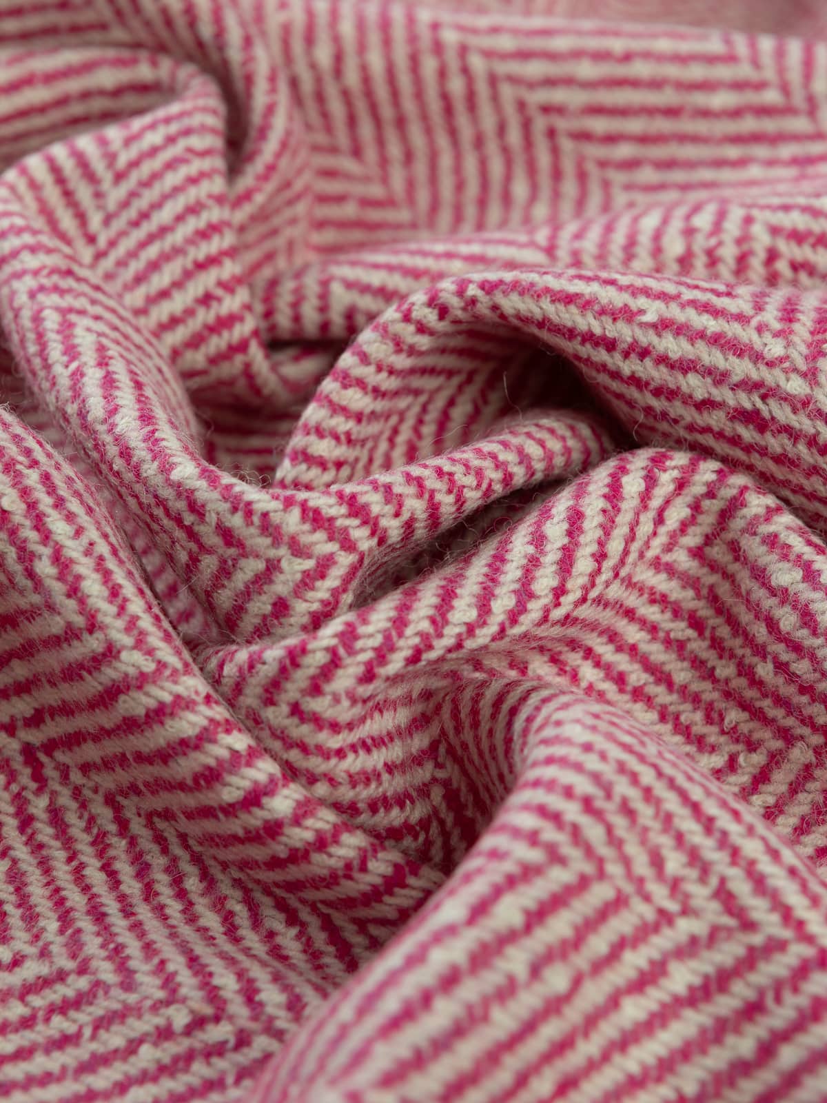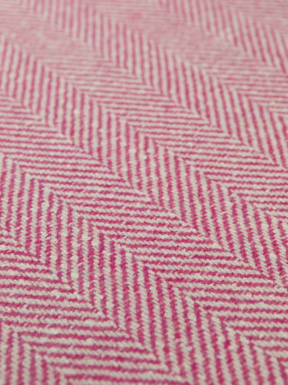 Shades: This classic jumbo herringbone, heavy wool tweed features a palette of contrasting natural winter white chunky yarns across the warp and sweet Fuchsia pink (purple-based pink) pulsing across the weft like life beneath the snow. This winning combination celebrates bold femininity, warmth, and texture.