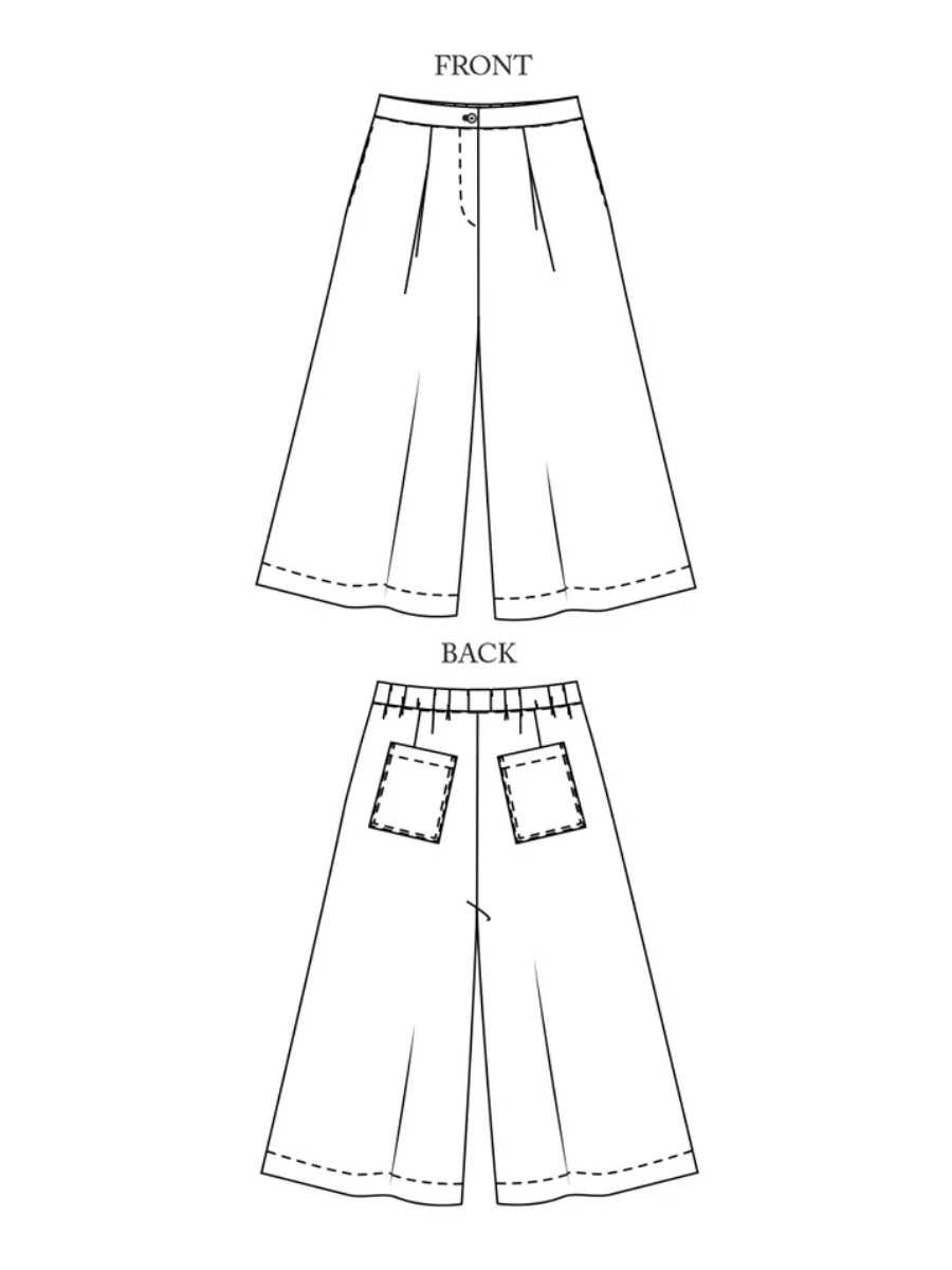 A pair of culotte trousers featuring a fly front, front pleats, in-seam pockets and an elasticated back waistband.