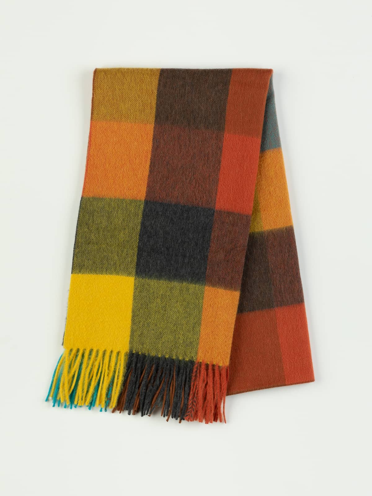 This colourful cashmere stole is a dream for colour lovers, ready to steal your heart. Highland Mosaic features a block check in a vibrant palette of kingfisher blue, warm russet and tan with pumpkin undertones, golden yellow for autumnal warmth, soft green for natural balance, and stabilising charcoal grey.