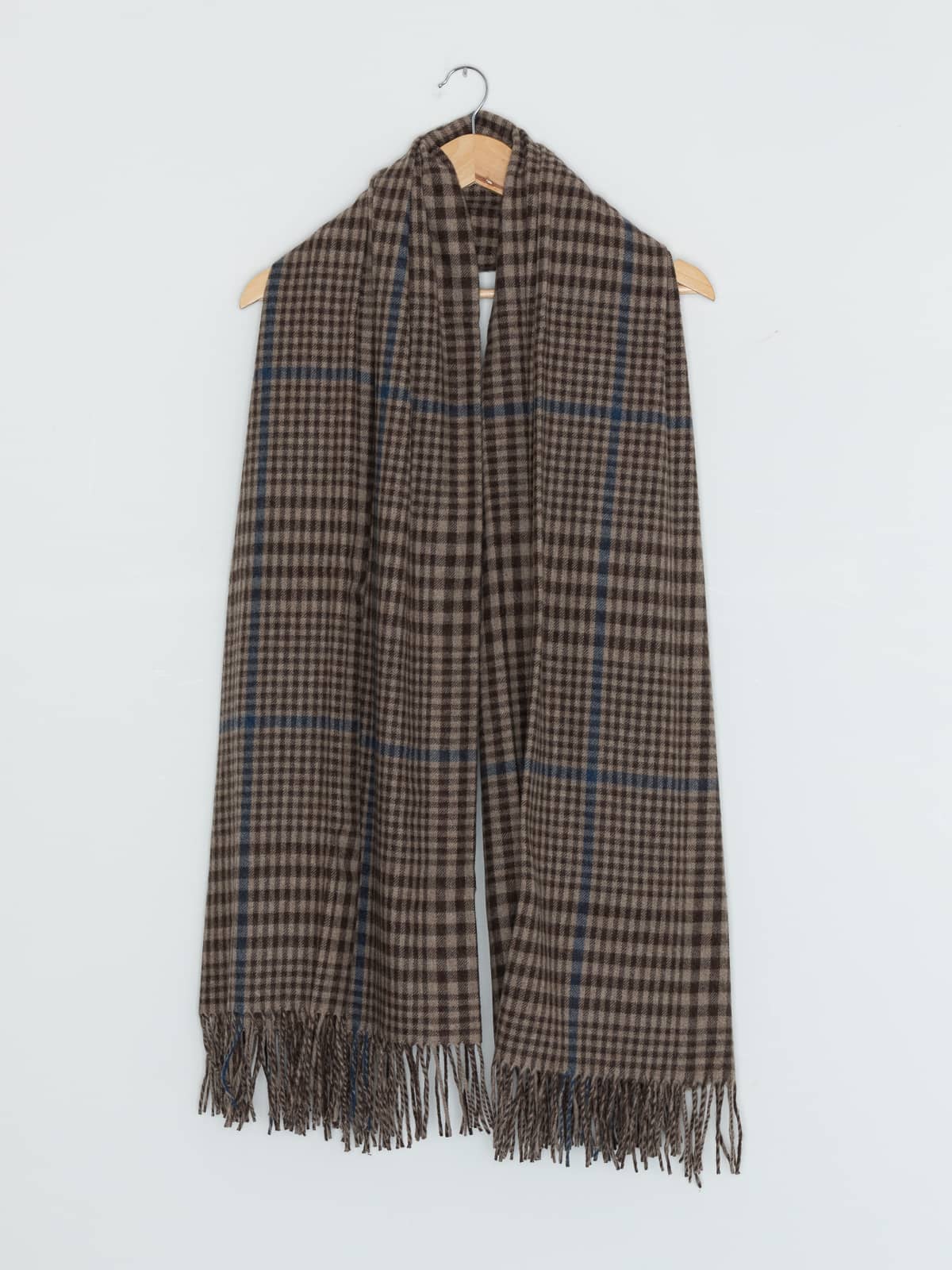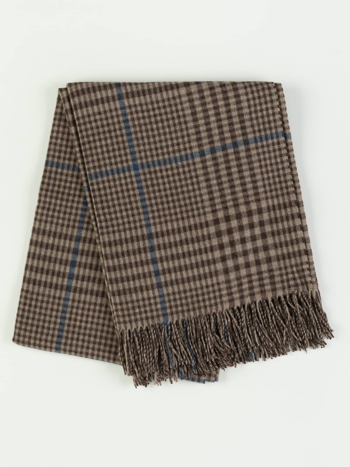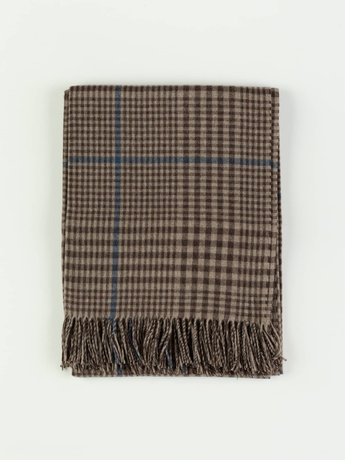 A gentle blend of sandy taupe and loamy brown gives this check stole the warmth of a sun-dried riverbank, crossed with a stream of clear river-blue for a fresh, uplifting accent. Soft, airy and wonderfully warm, it brings a relaxed countryside charm to any coat or knit.
