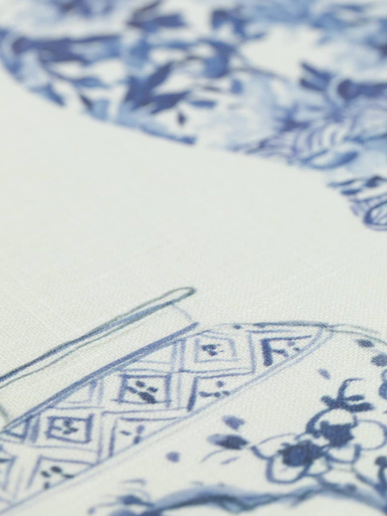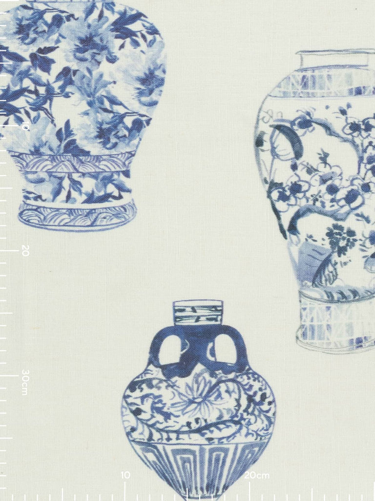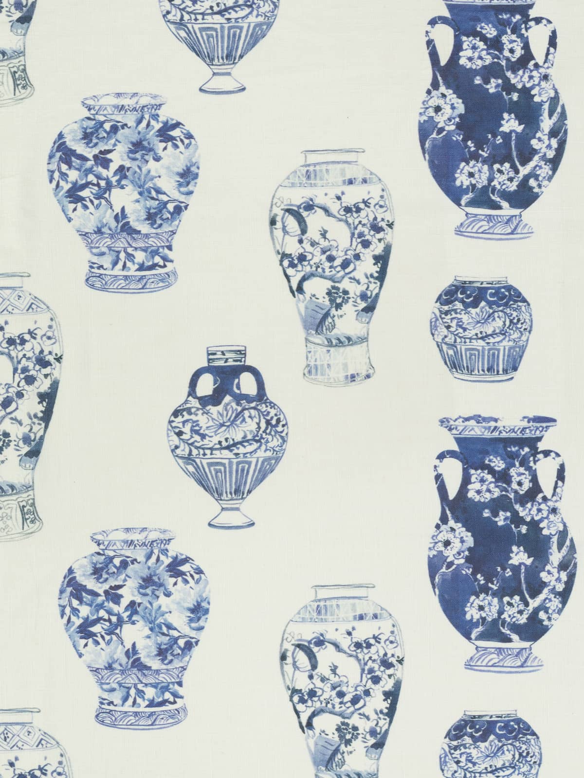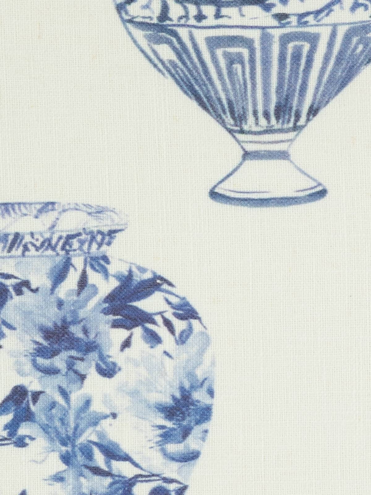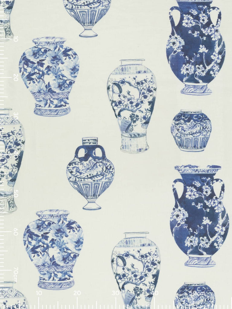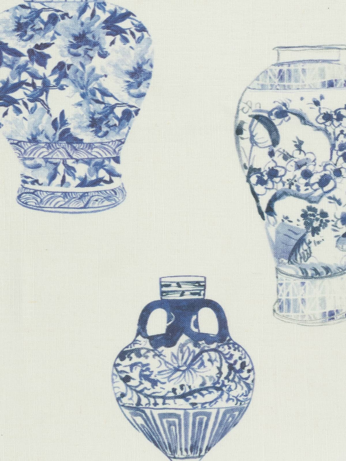 Shade: Summer Chinoiserie Jars is printed with a classic china blue palette onto a classic natural white linen and cotton base. These timeless ceramic blue tones form a cool and elegant style-perfect for the summer months.