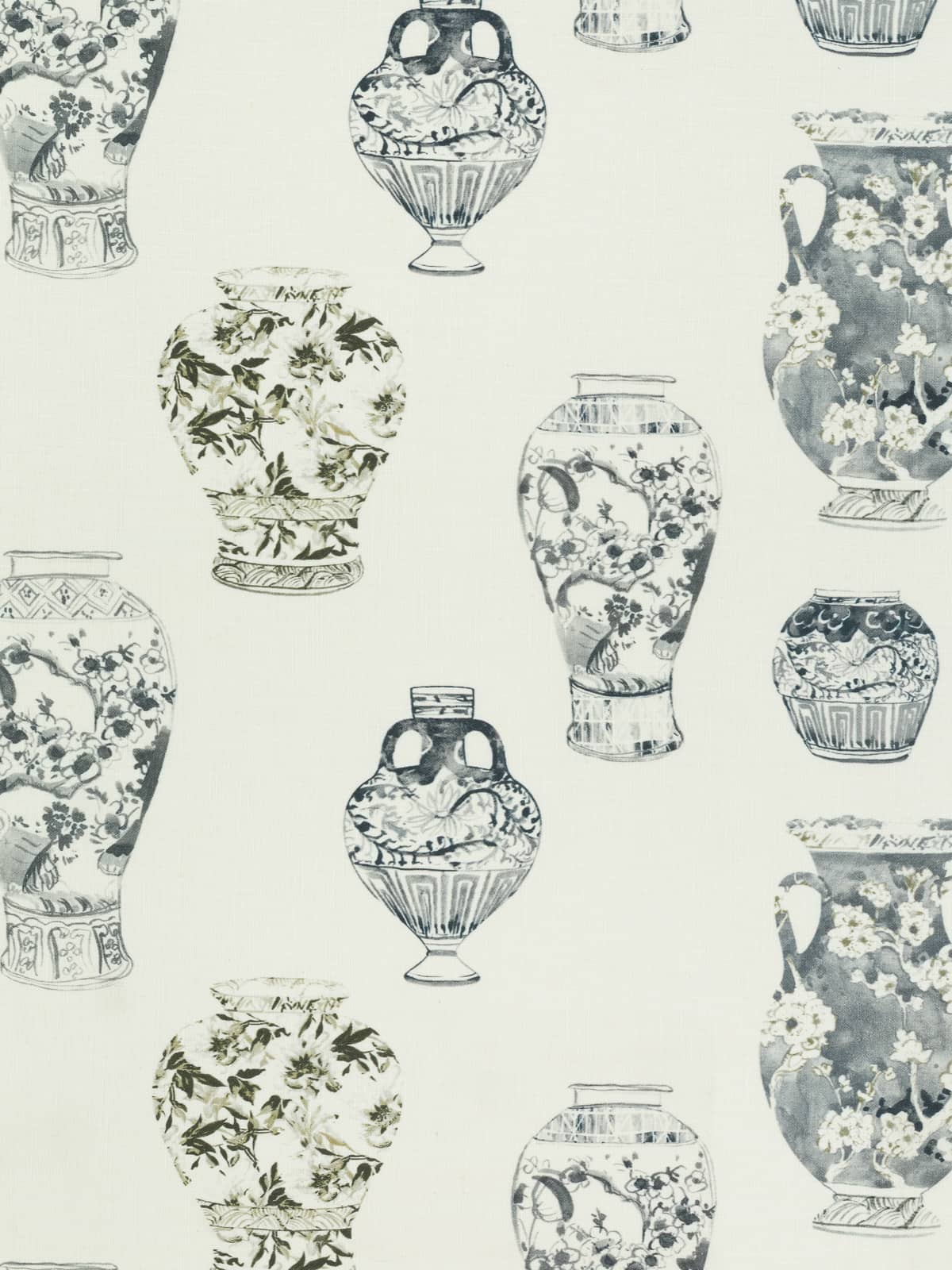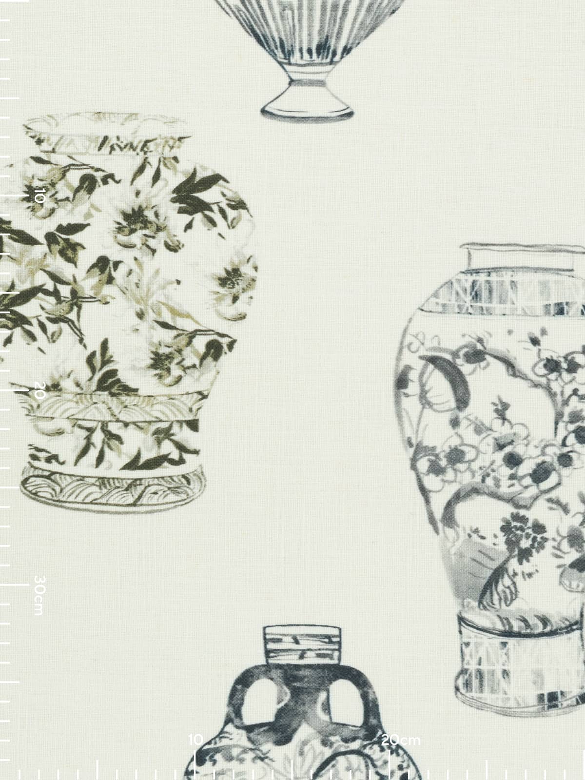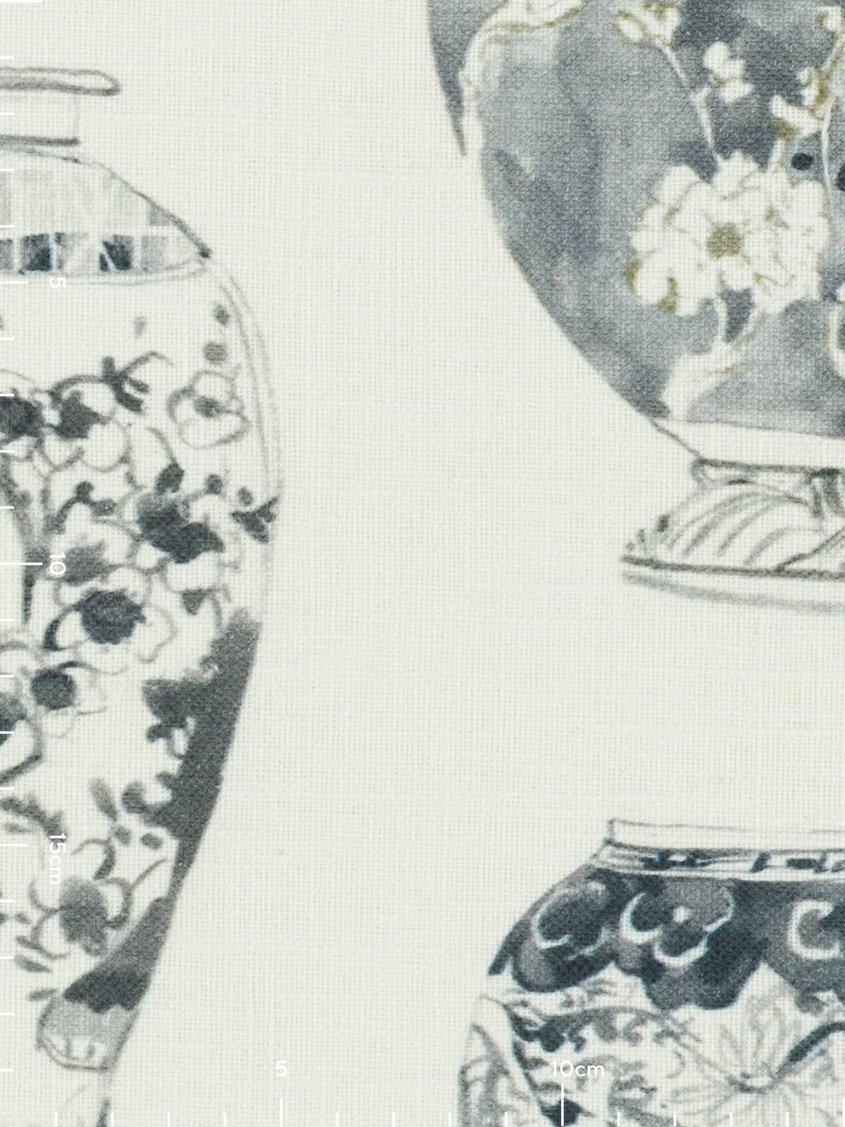 Shade: Winter Chinoiserie Jars is printed with a simple monotone palette onto a classic natural white linen and cotton base. Moody grey tones form a cool seriousness to this stylish palette. A perfect base for adding accent colours of your choosing.