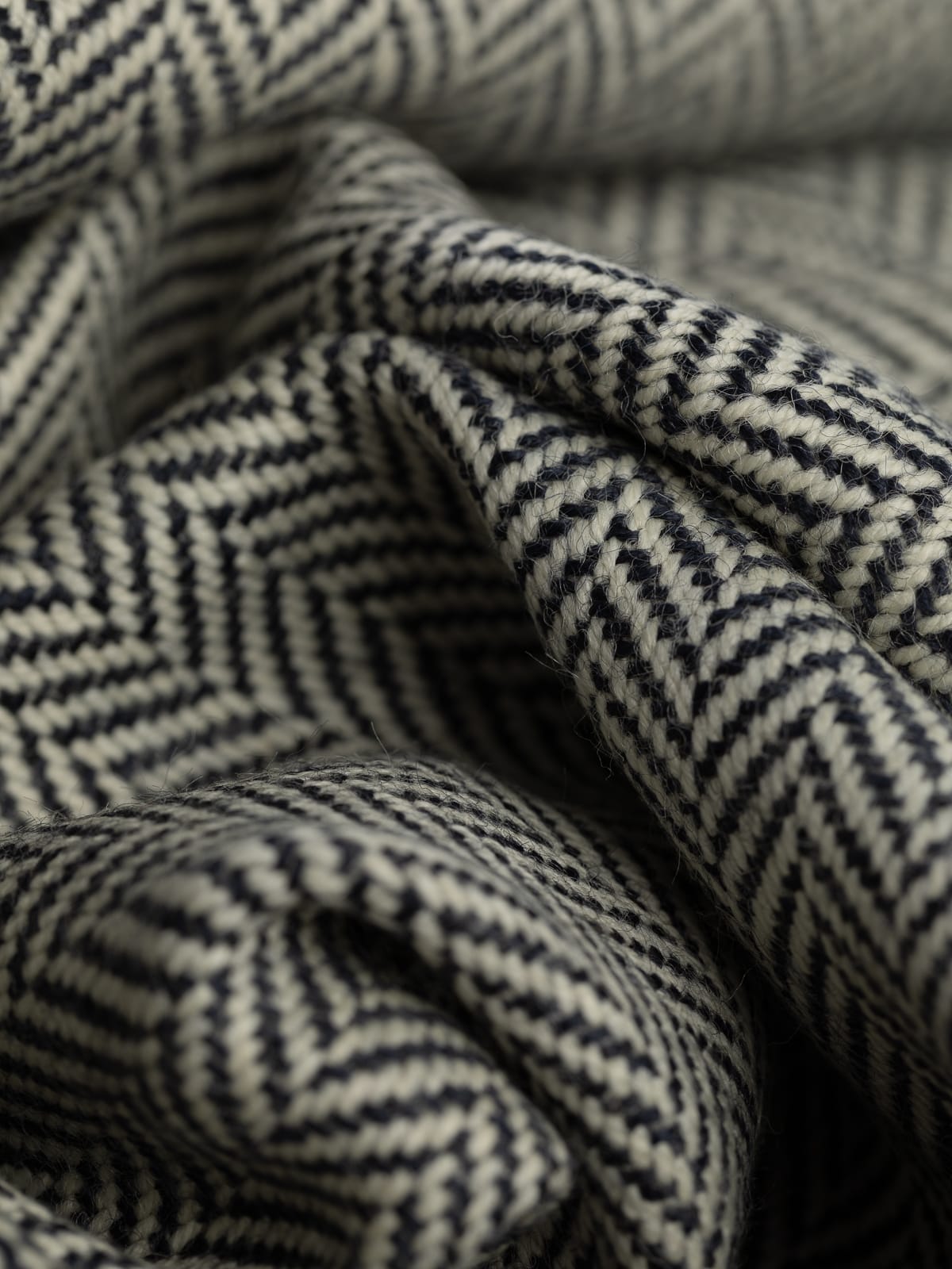 The classic 2cm wide chevrons of the herringbone weave create a smart contrast between the two yarns. Navy and white is a seriously chic and smart classic this darkest navy sitting alongside natural white is as strikingly beautiful as the plumage of an inquisitive magpie with its blue-black sheen.