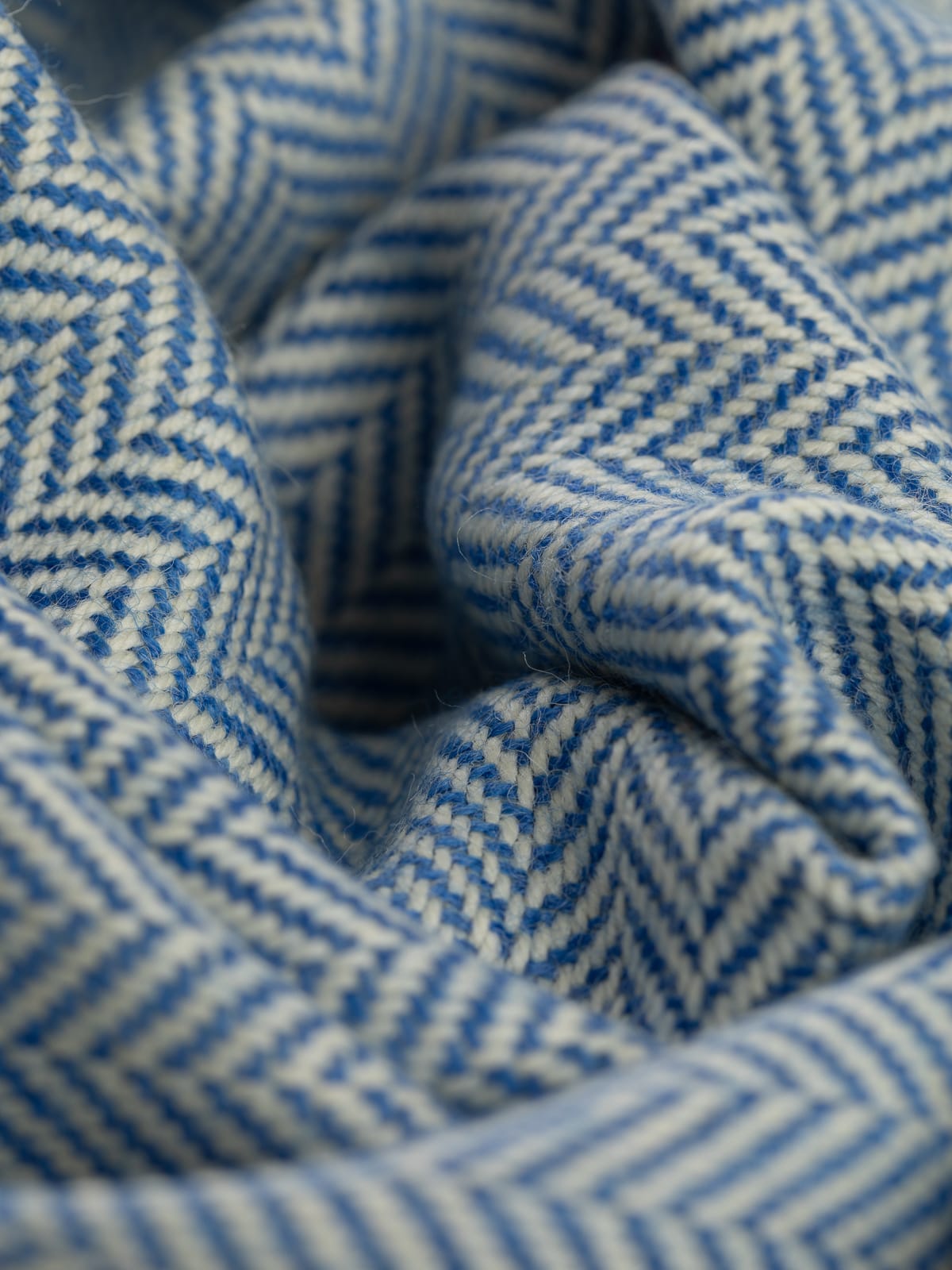 Woven from an uplifting combination of 100% wool yarns, this fresh-as-a-summer breeze-hued combination has a beautifully simple natural white warp of softly and artfully spun yarns and forms the base for the beautiful cornflower blue on the weft.