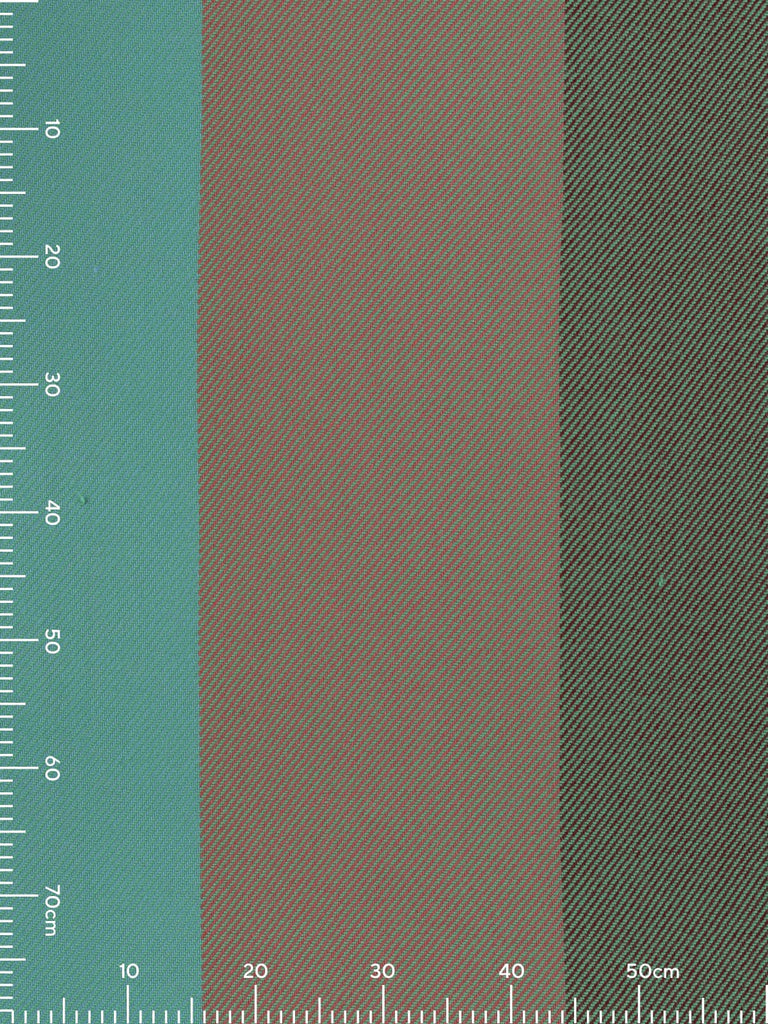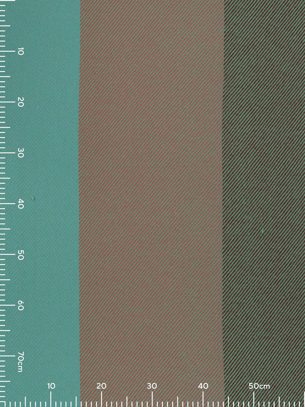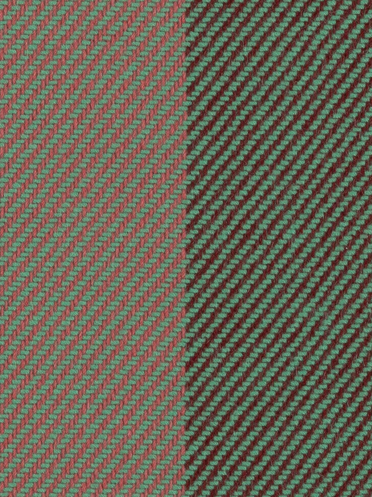 Shades: Coral Tide is a blanket-weight cashmere twill inspired by coastal reefs and tidal light. Vertical stripes in sea anemone red, sunset pink, cool sky blue, frosted green, silver grey, and soft sand beige are threaded with an aqua-green weft, creating a luminous, cohesive textile alive with soft shimmer and coastal energy.