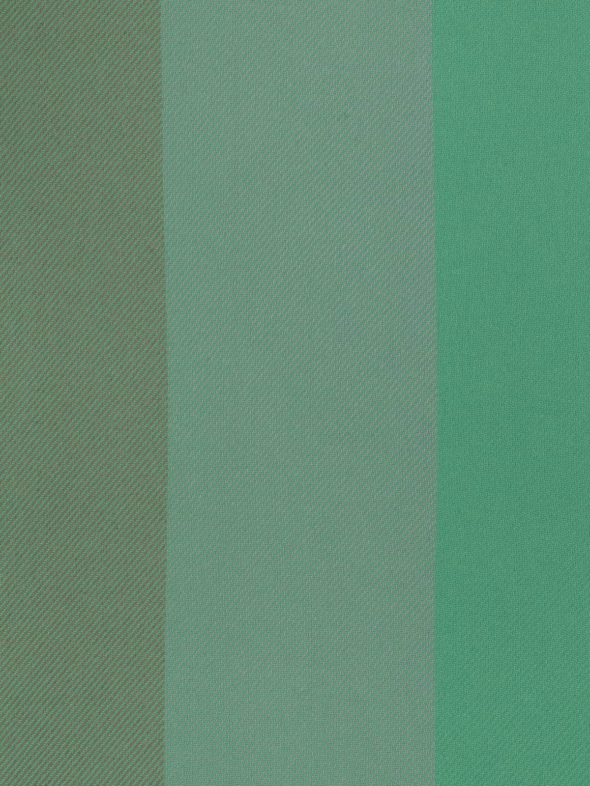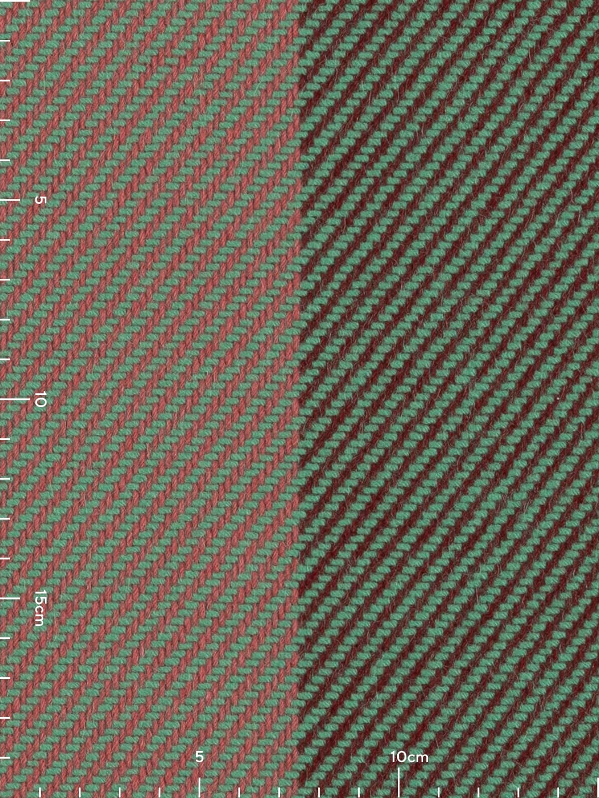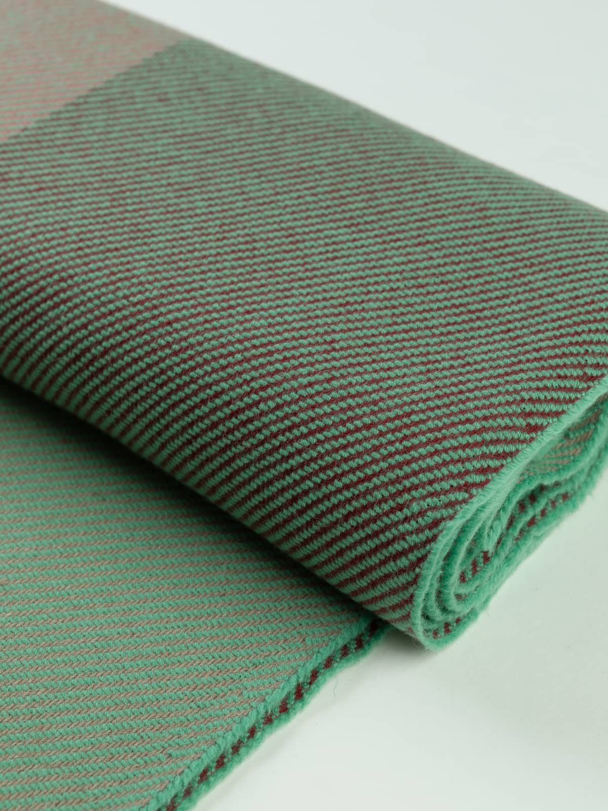Shades: Coral Tide is a blanket-weight cashmere twill inspired by coastal reefs and tidal light. Vertical stripes in sea anemone red, sunset pink, cool sky blue, frosted green, silver grey, and soft sand beige are threaded with an aqua-green weft, creating a luminous, cohesive textile alive with soft shimmer and coastal energy.