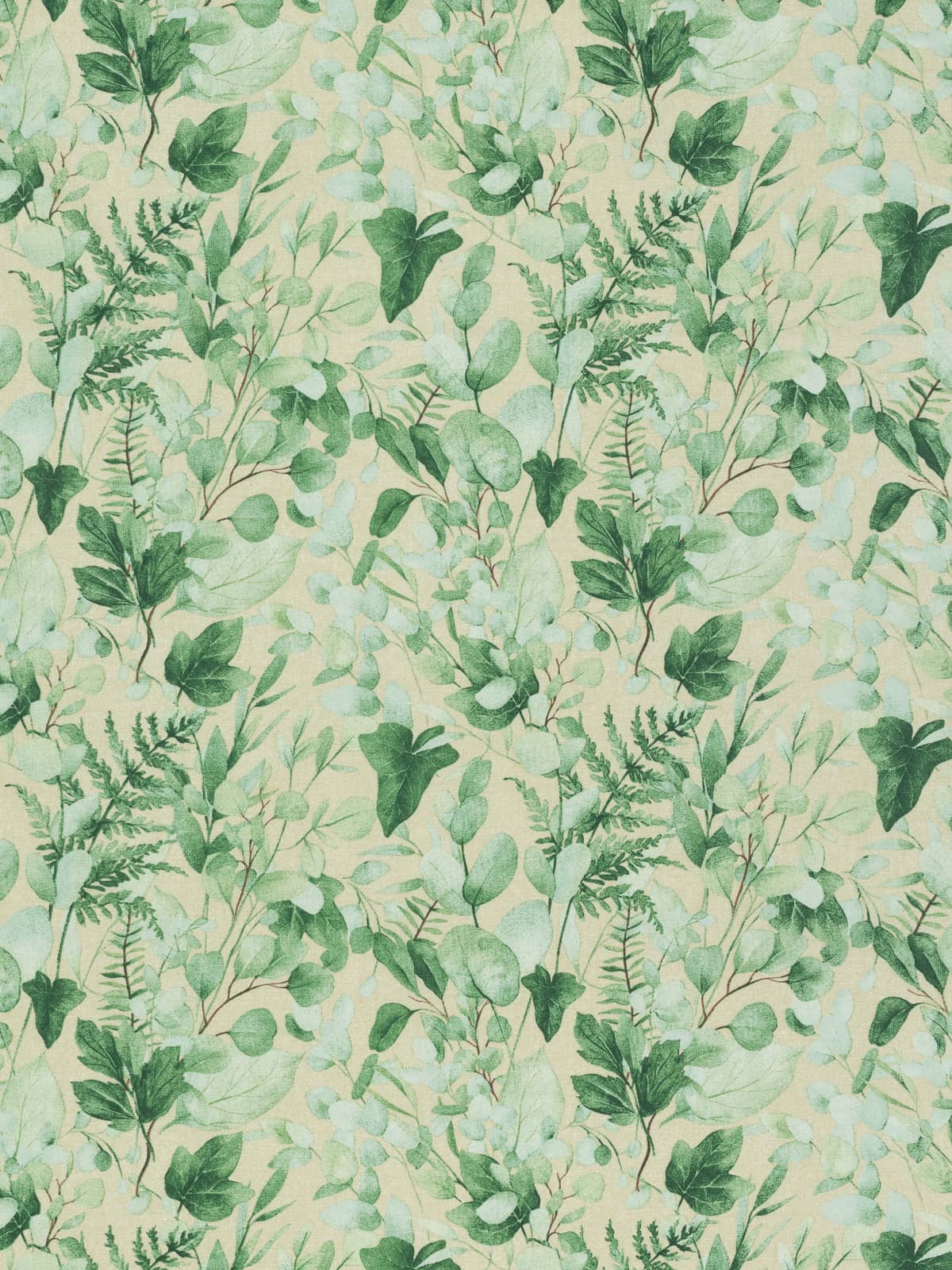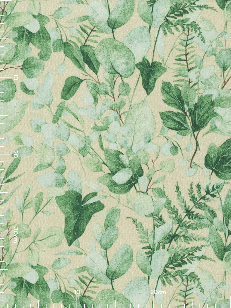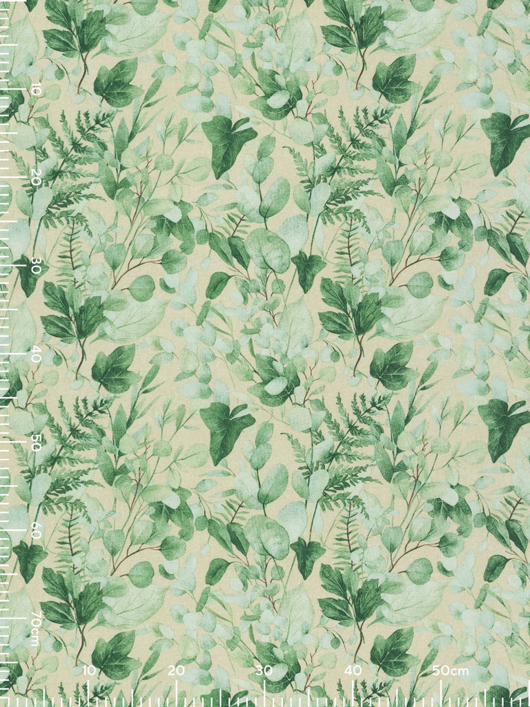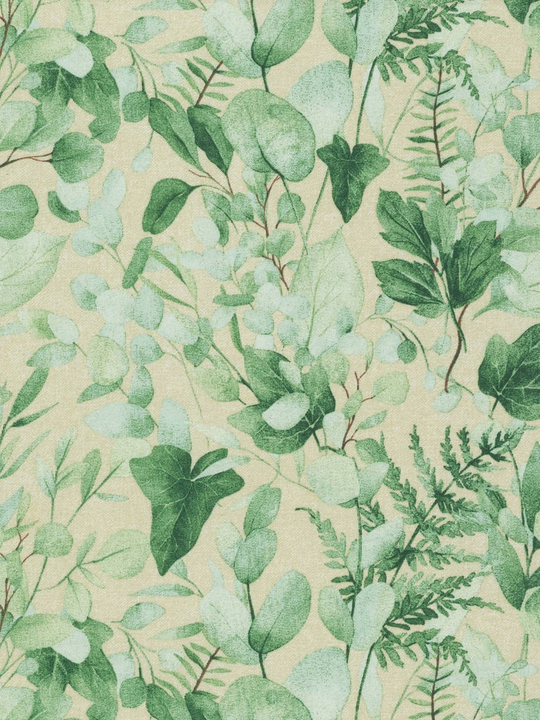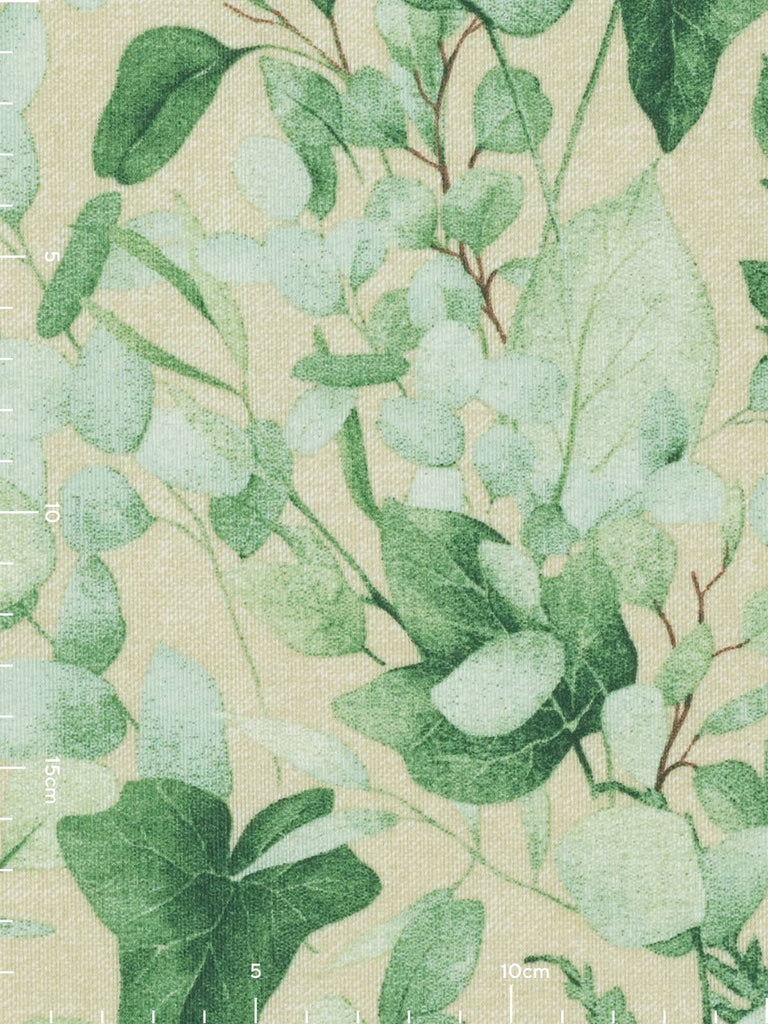 Cool Eucalyptus is a printed outdoor fabric sporting a lively design of fresh watercolour tinted hues of green and a complementary sand background. The calming green foliage of Eucalyptus leaves plus feathery ferns and glossy green ivy, will create a wonderfully relaxing and chic style.