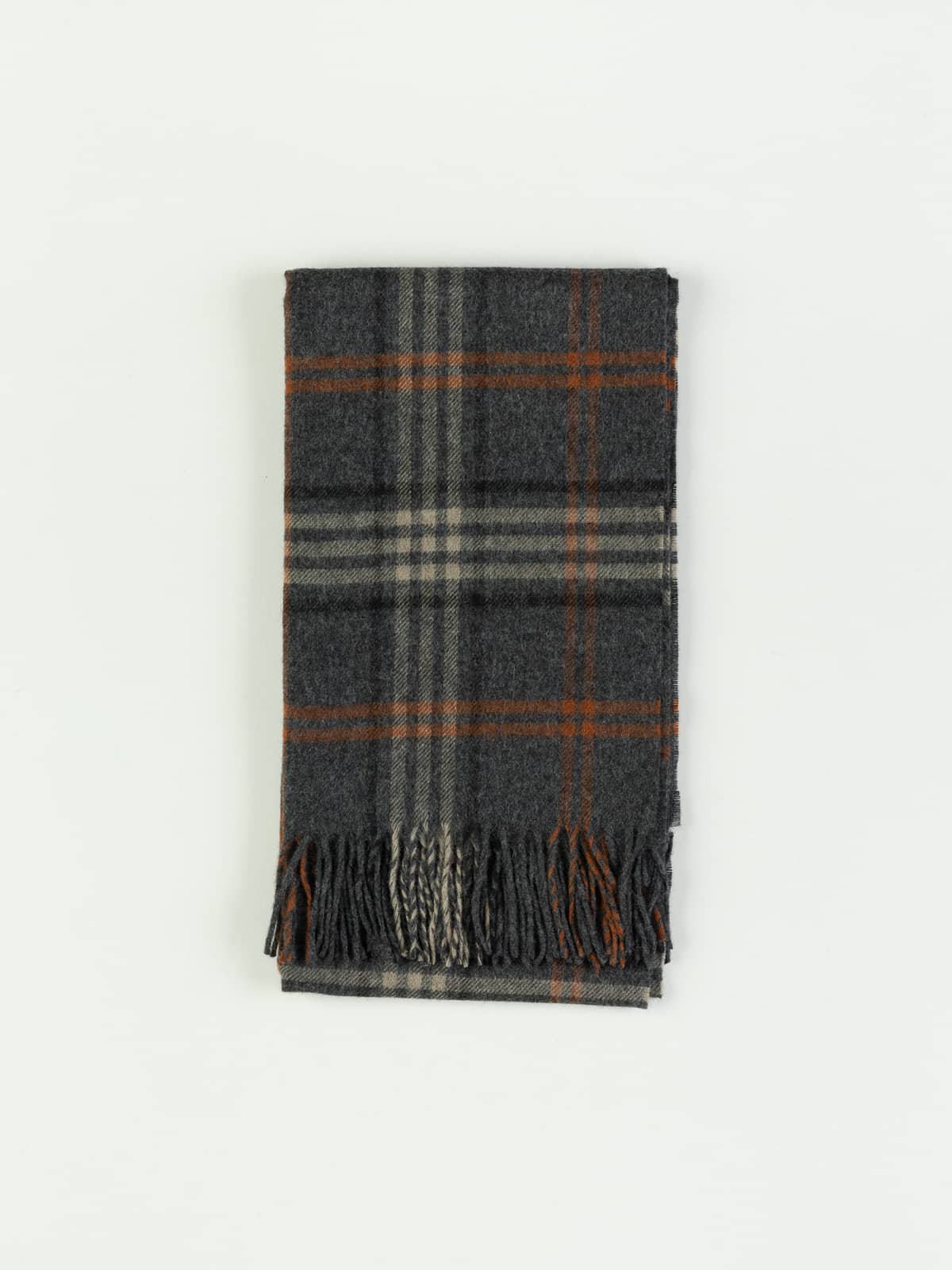 This scarf evokes the quiet strength of a windswept moor under a thunderstorm sky, with thunderstorm grey melange forming a soft, brooding backdrop. Spiced brown, straw beige, and coal black accents add warmth and grounding, reminiscent of rugged earth and storm-darkened fields. Its smooth Merino wool weave offers cozy comfort with a timeless, natural elegance.