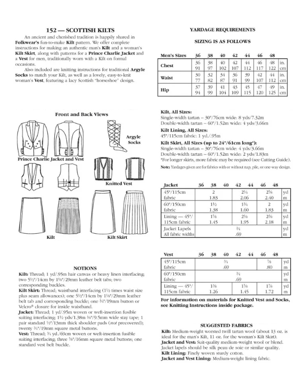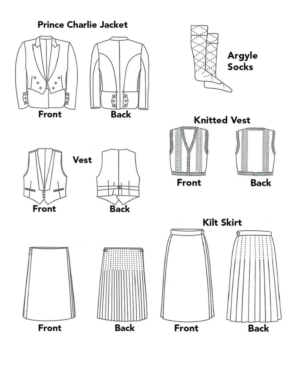 Included in the pattern: Instructions for measuring, pleating, and constructing the Traditional Kilt and Kilt Skirt (pattern pieces are unnecessary for the kilt and kilt skirt), pattern pieces and instructions for sewing the Jacket and Vest, plus knitting instructions for argyle socks and an easy-to-knit vest.