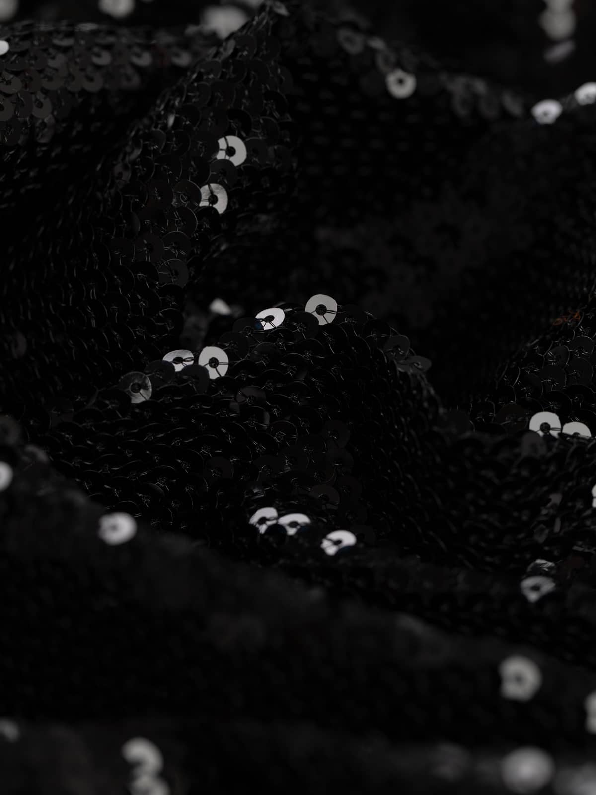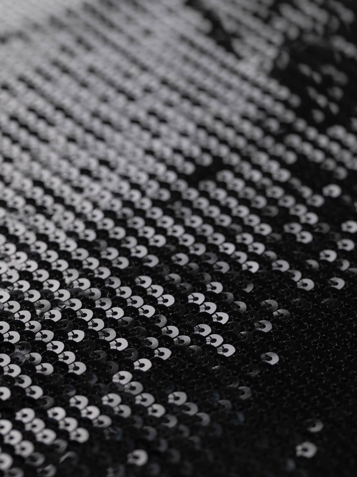 Design: The 3mm circular black sequins are stitched in vertical, slightly overlapping rows to form an opulent, encrusted, shimmering surface.