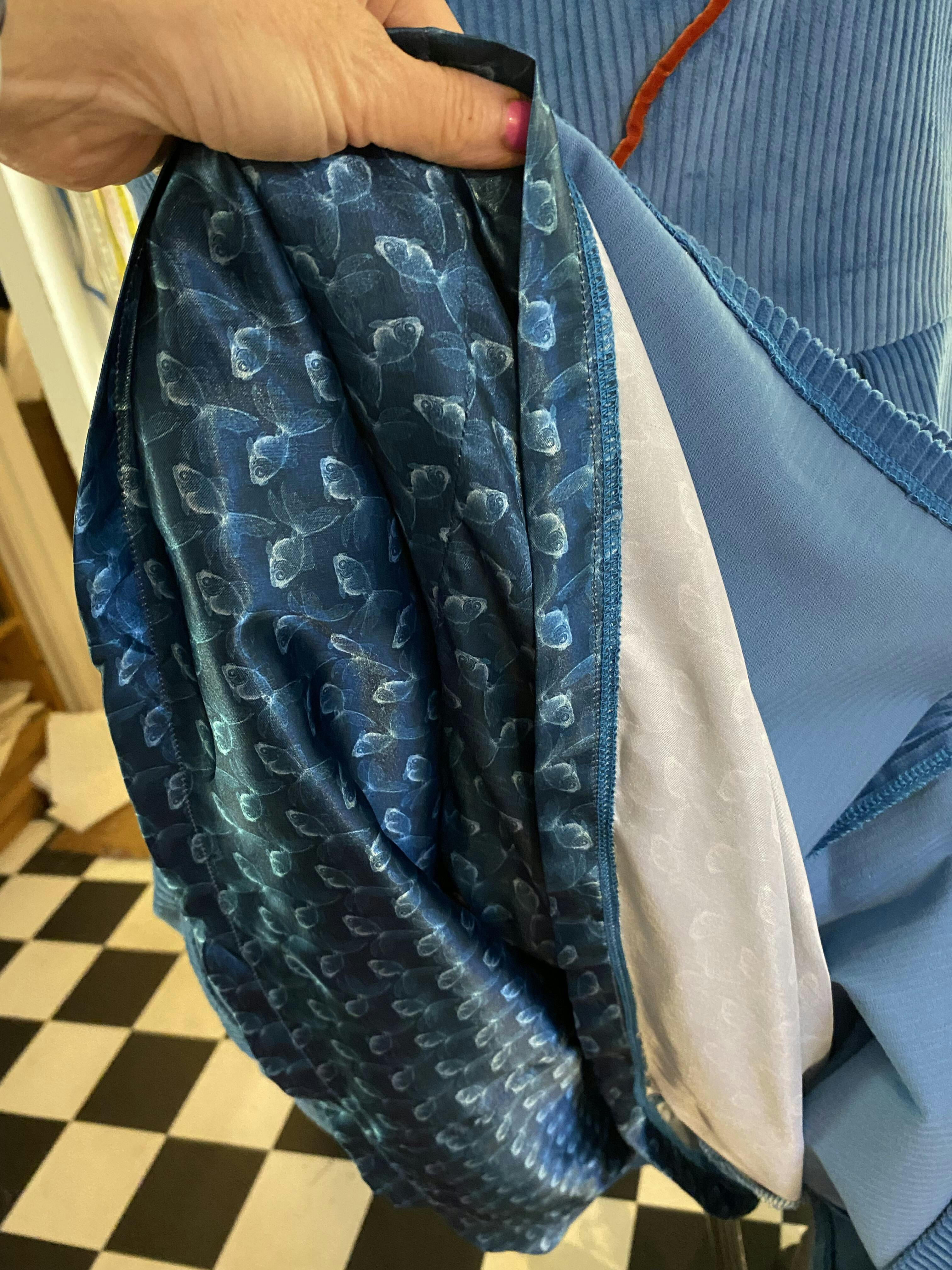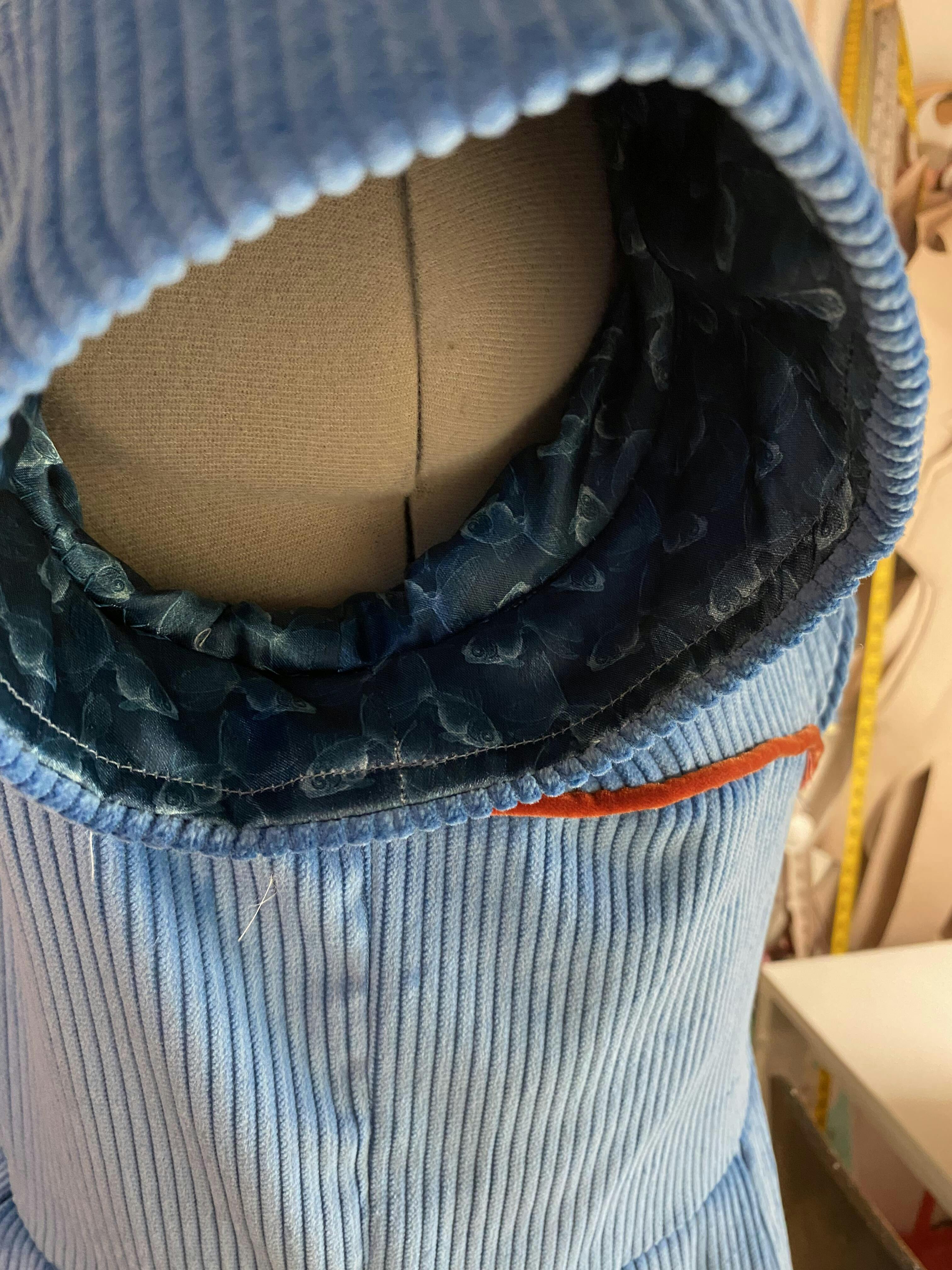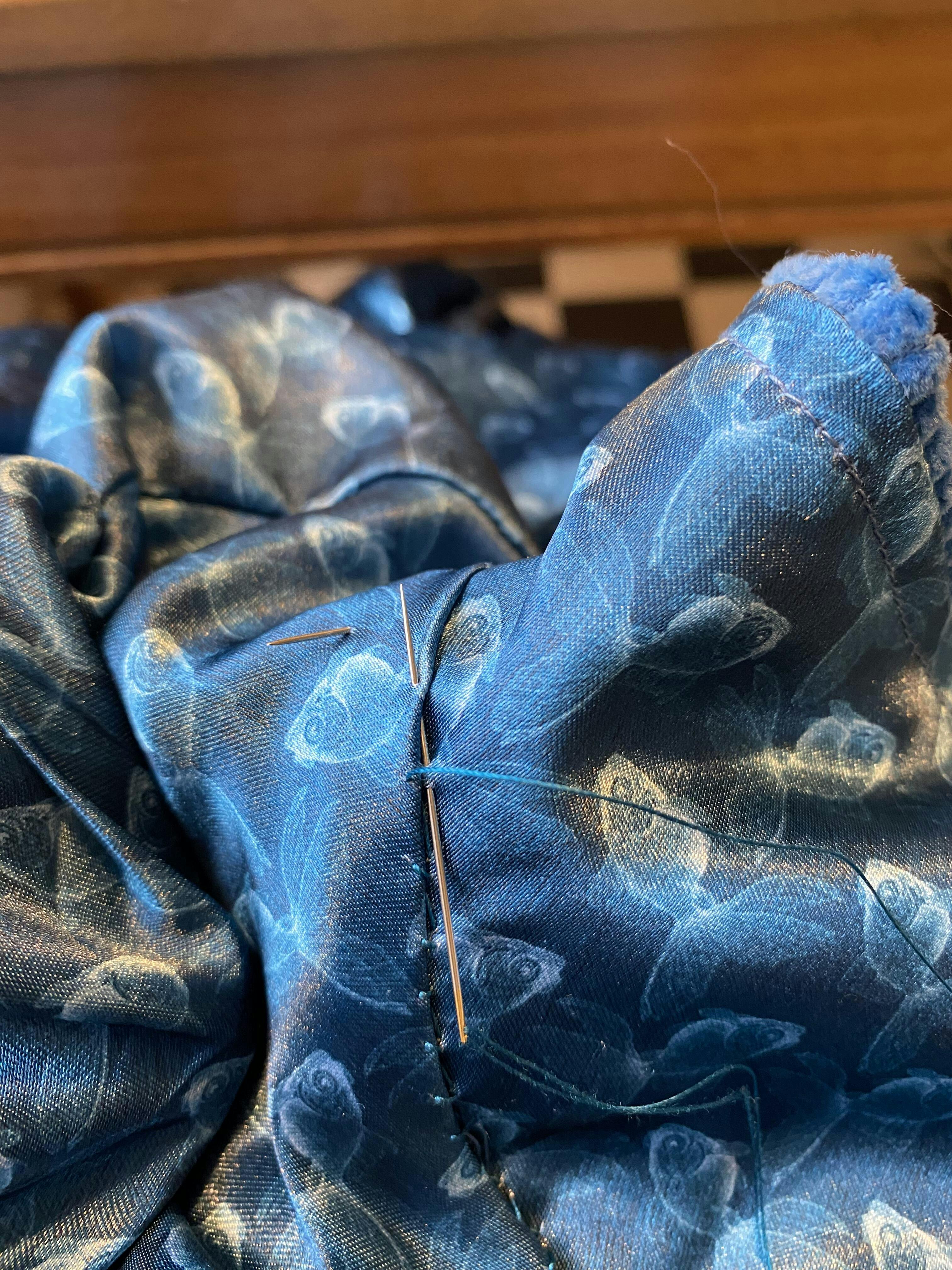 Glint of Goldfish will also make a statement lining for your bespoke woollen jackets, waistcoats (with statement backs) and coats. You won’t be able to resist showing people your wonderful lining! Create simple cravats, scarves, headbands and luxe accessories to match.