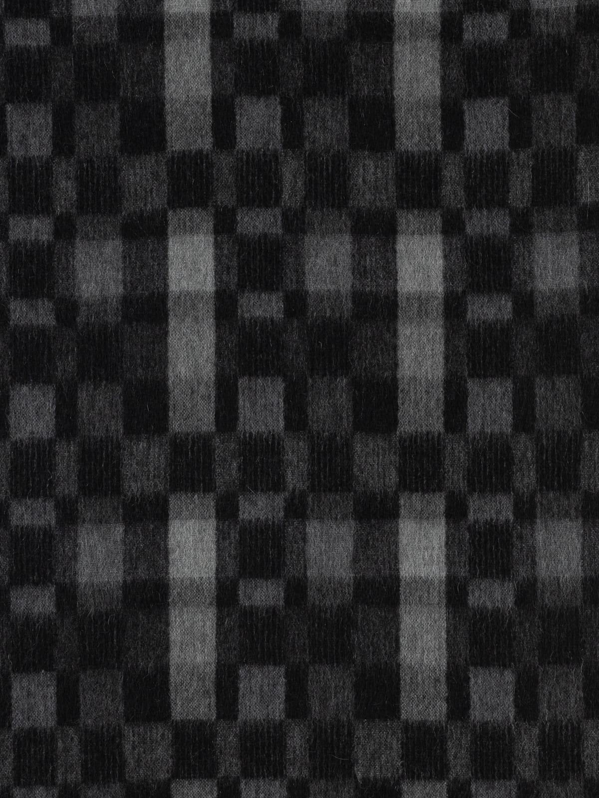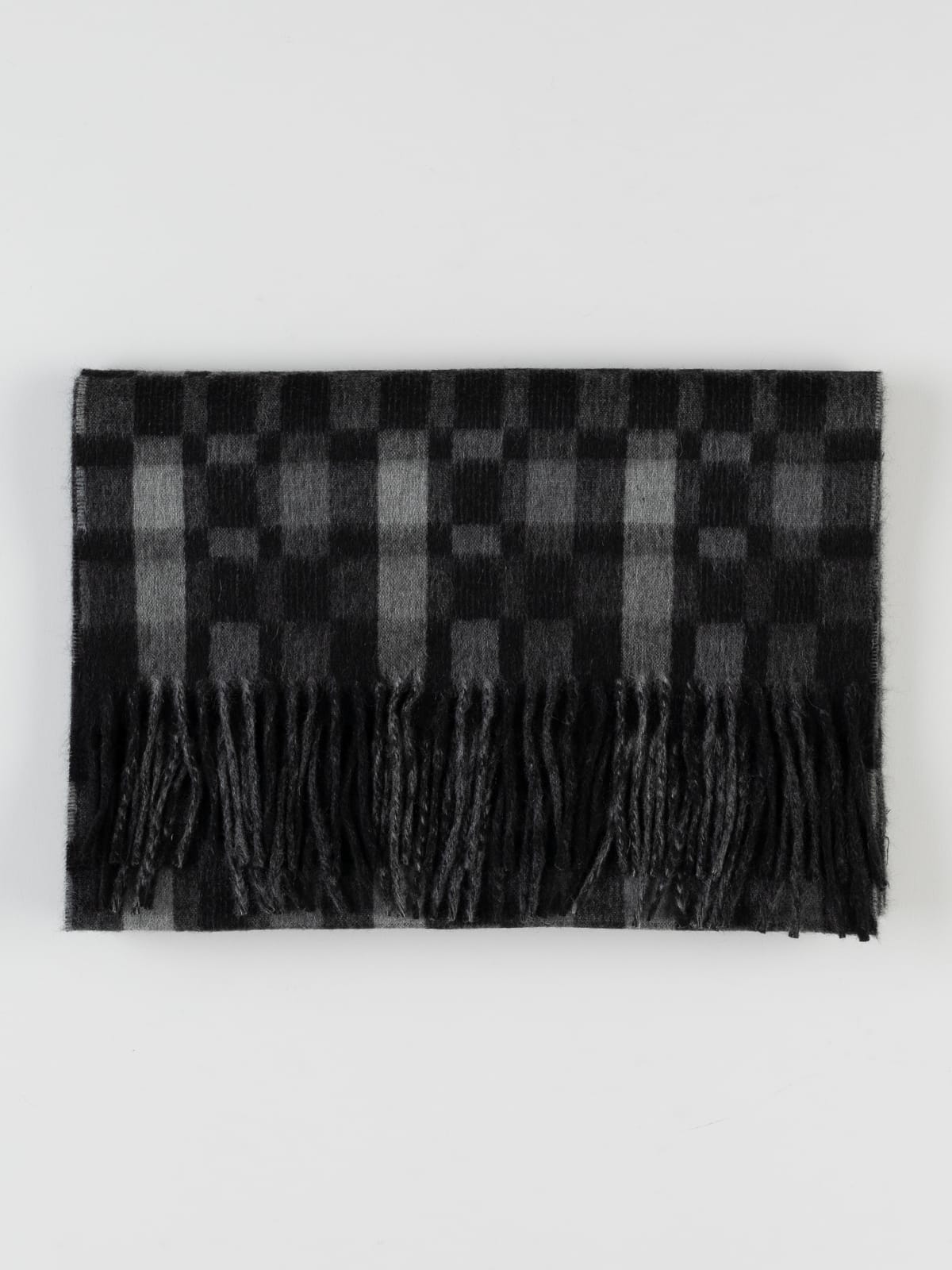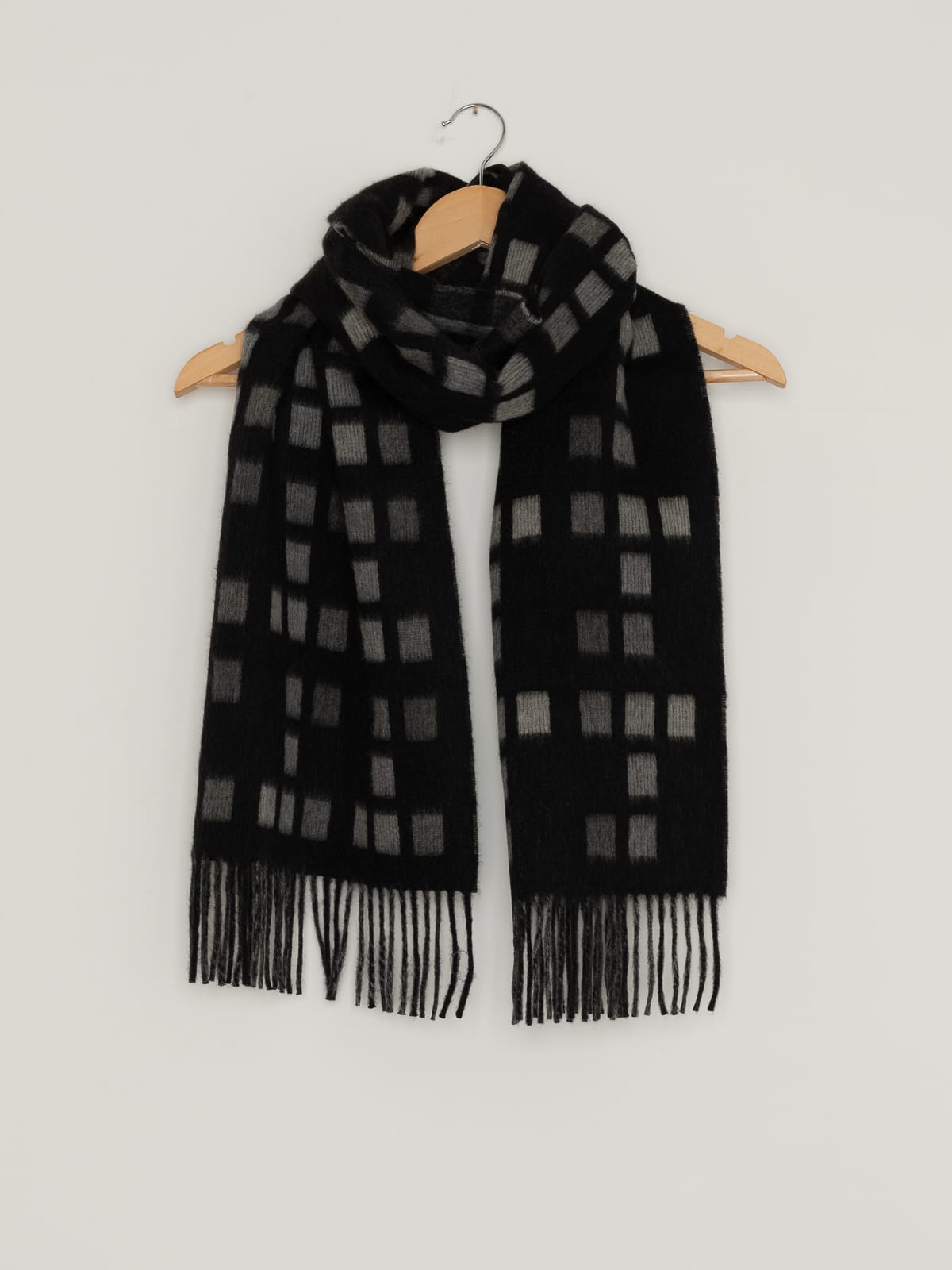 Baby soft brushed yarns of subtle multi-hued grey toned blocks (like a secret code or computer game) sit against classic black, giving a super chic and stylish cosy look to this versatile scarf.