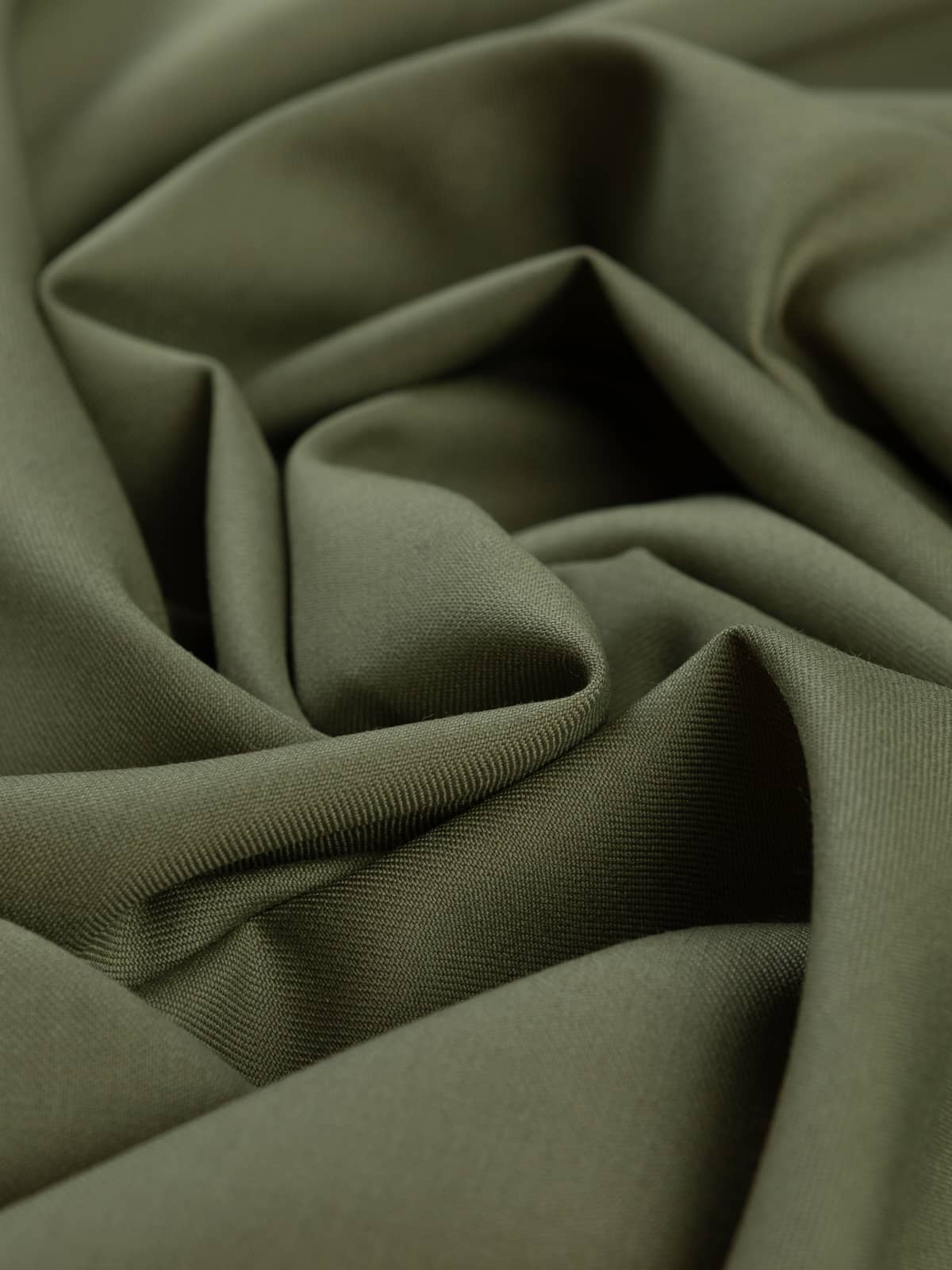 Shades: This flawless uniform twill wool fabric stands proud in a solid Khaki-Sage green hue. Soft grey undertones give depth and sophistication, reminiscent of the silvery-green leaves of its herbal namesake.