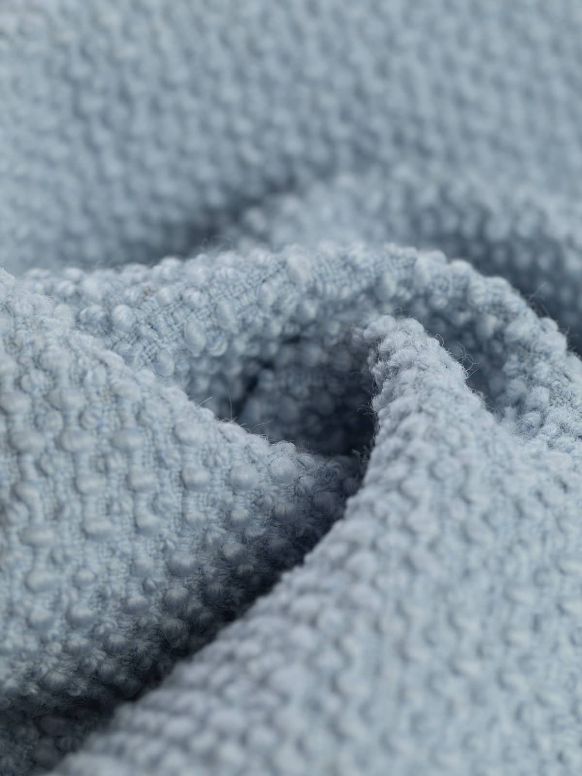 Texture: A richly textured wool and mohair blend offers a structured yet soft finish, characterised by rhythmic, raised bouclé detailing across the face. The reverse side is flatter, with a smoother hand. The reverse is less textured as the bouclé bobbles only show on the face side.