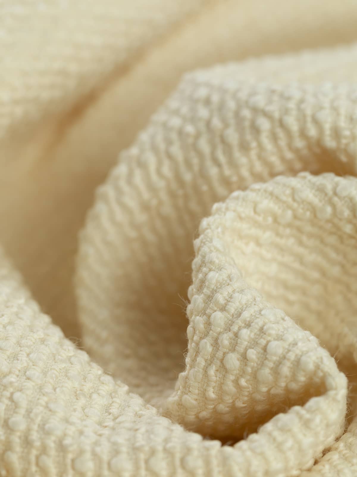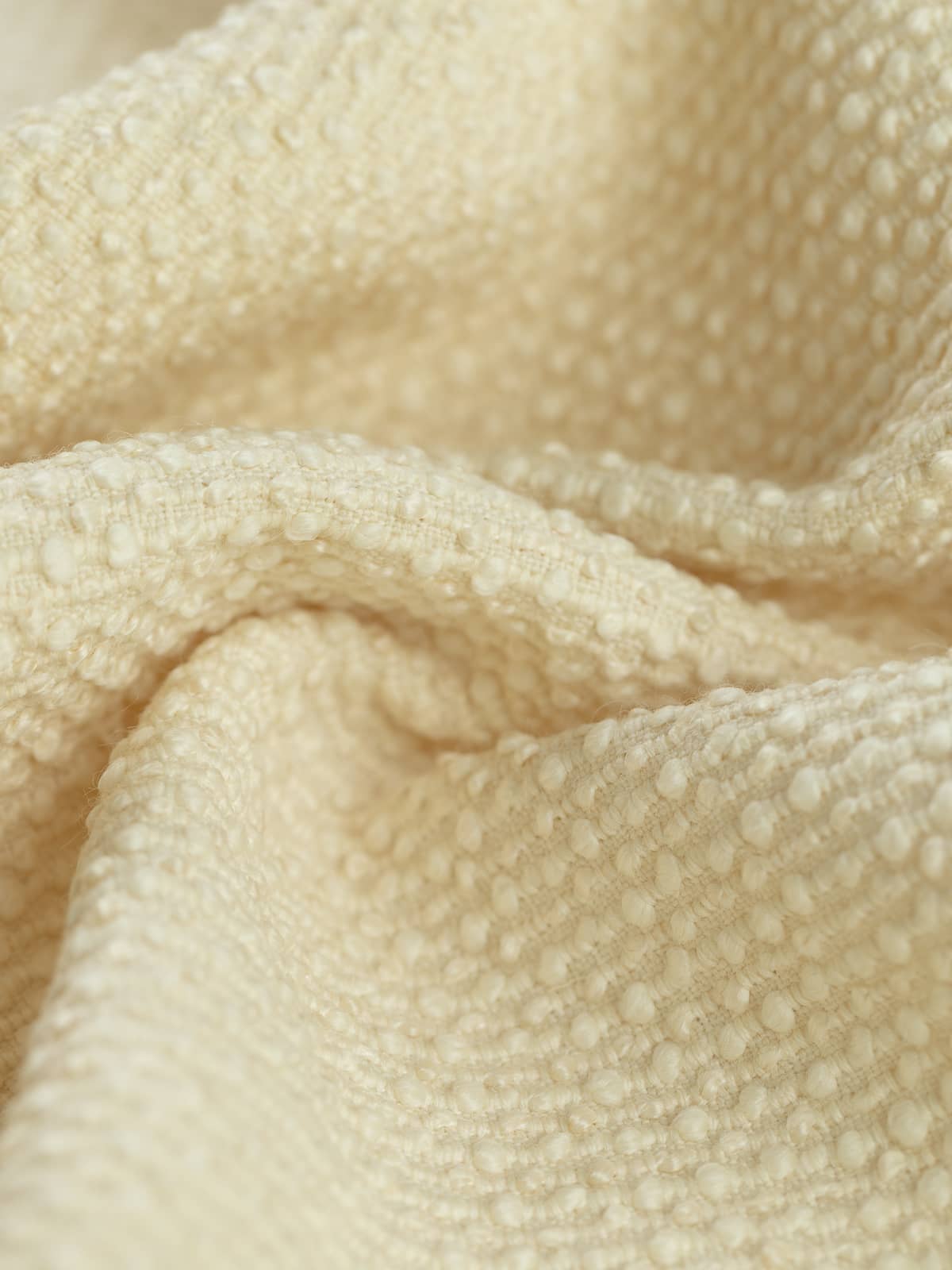 Texture: A richly textured wool and mohair blend offers a structured yet soft finish, characterised by rhythmic, raised bouclé detailing across the face. The reverse side is flatter, with a smoother hand. The reverse is less textured as the bouclé bobbles only show on the face side.