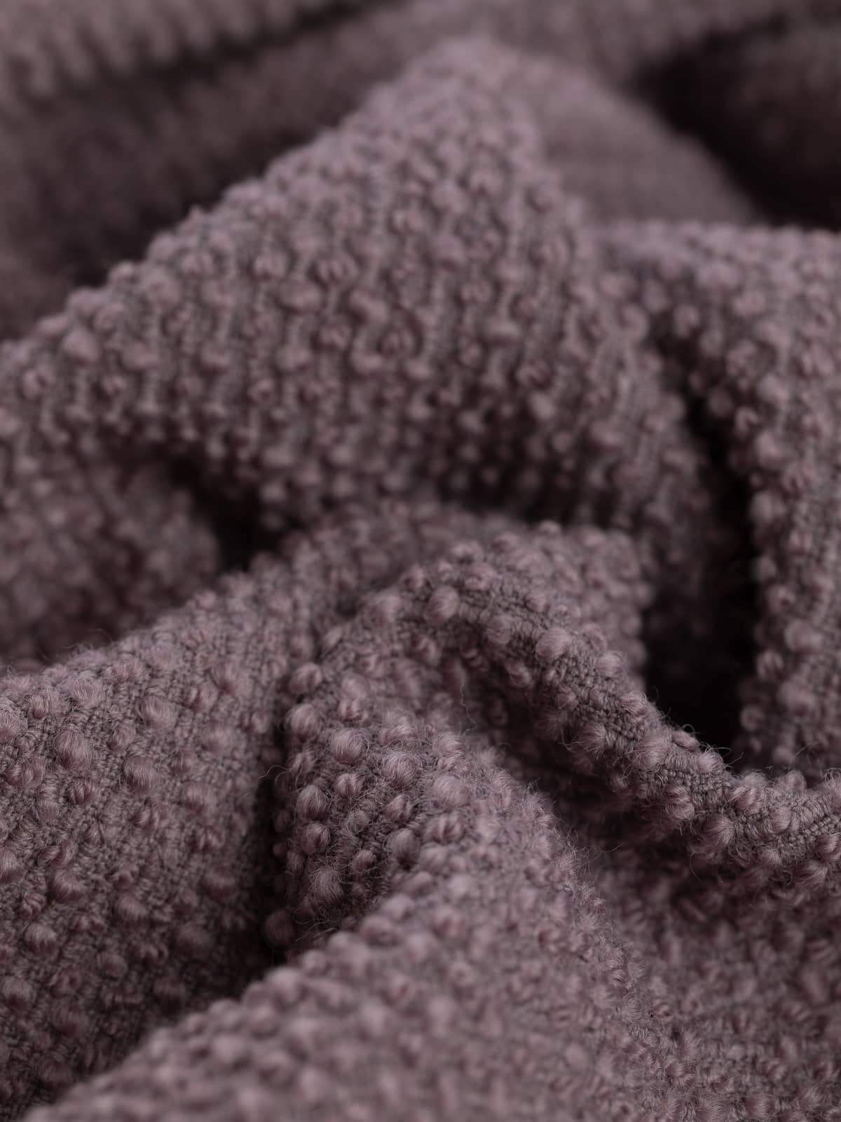 Texture: A richly textured wool and mohair blend offers a structured yet soft finish, characterised by rhythmic, raised bouclé detailing across the face. The reverse side is flatter, with a smoother hand. The reverse is less textured as the bouclé bobbles only show on the face side.