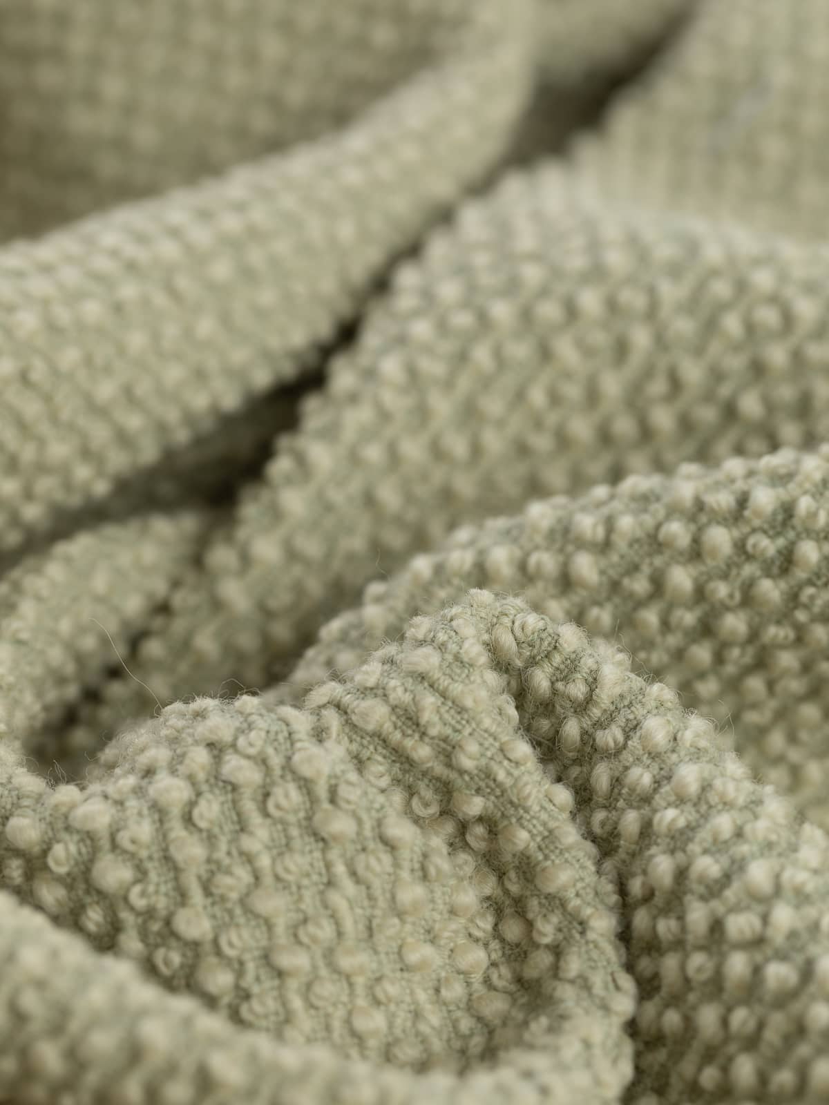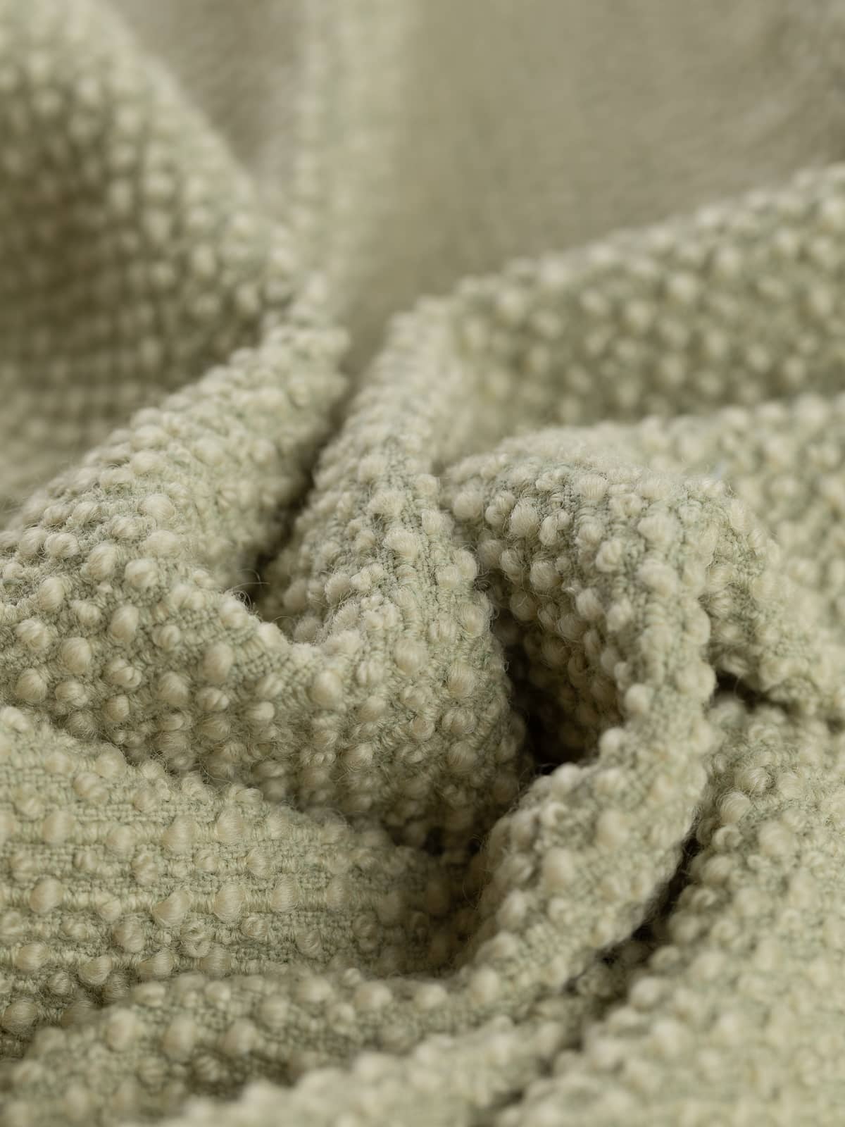 Texture: A richly textured wool and mohair blend offers a structured yet soft finish, characterised by rhythmic, raised bouclé detailing across the face. The reverse side is flatter, with a smoother hand. The reverse is less textured as the bouclé bobbles only show on the face side.