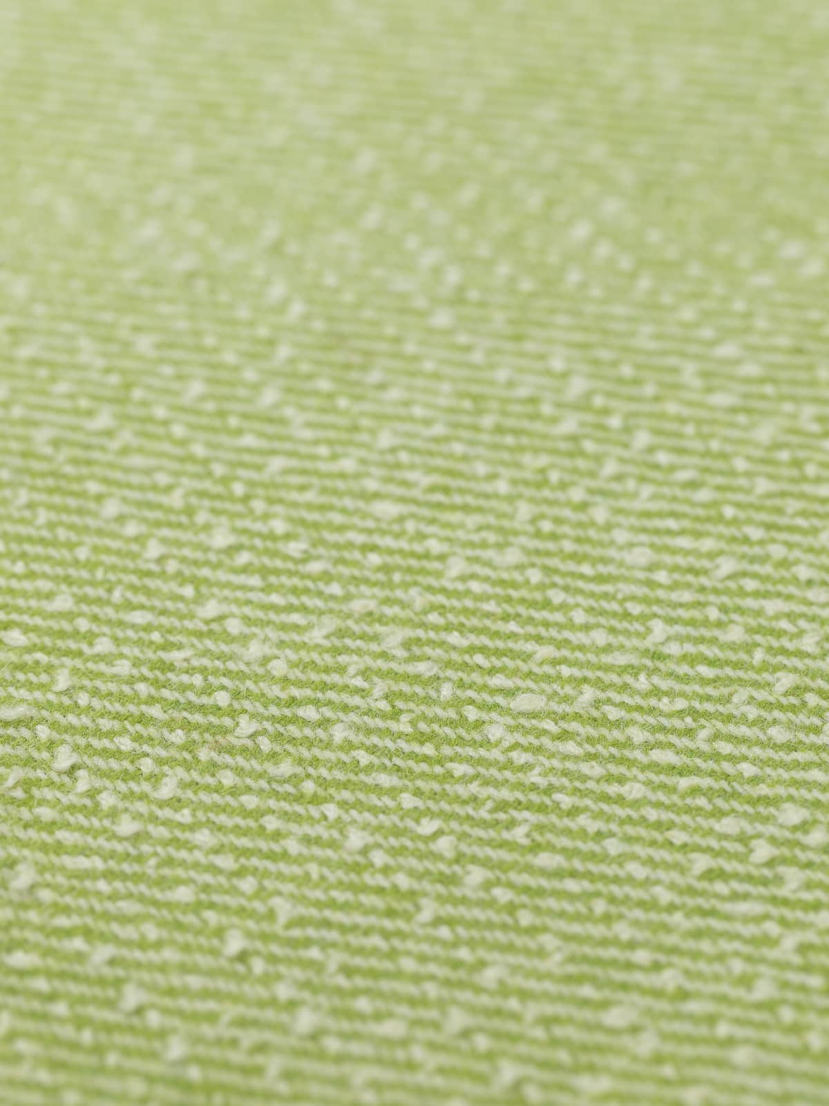 Design: Classic twill construction with cream warp and lime green weft forming a bold diagonal rhythm. The bouclé warp accentuates the twill geometry, introducing texture and animated surface movement while preserving a high-fashion tweed finish. The result is a confident, modern interpretation of heritage tweed, graphic, tactile, and couture-inspired.