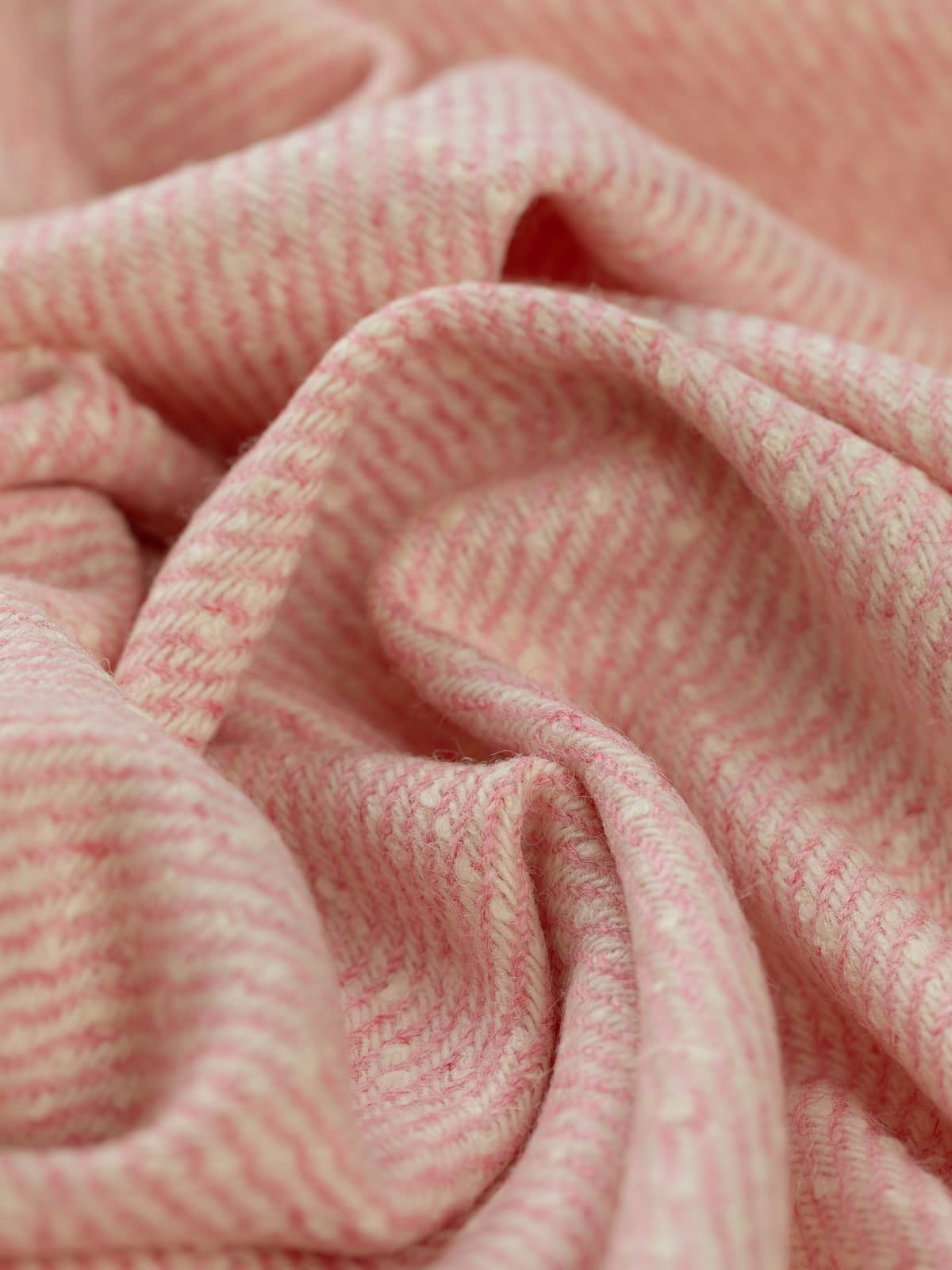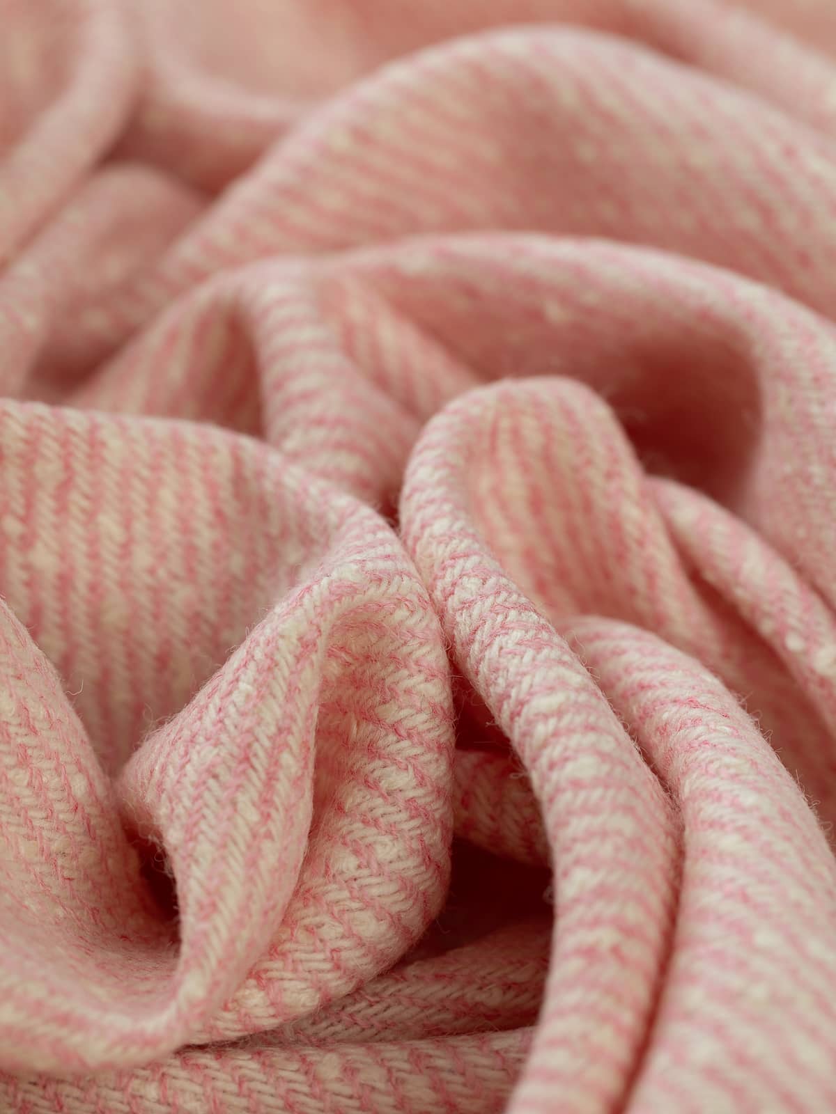 Shades: Alternating yarns in cream and strawberry pink create the characteristic twill diagonals, producing a candy-stripe effect, playful yet refined. The contrast is soft rather than graphic, maintaining elegance while introducing charm and lightness. Sweet sugar pink, redolent of pink sugar mice, with cream string tails. Full of stylish, almost vintage charm.