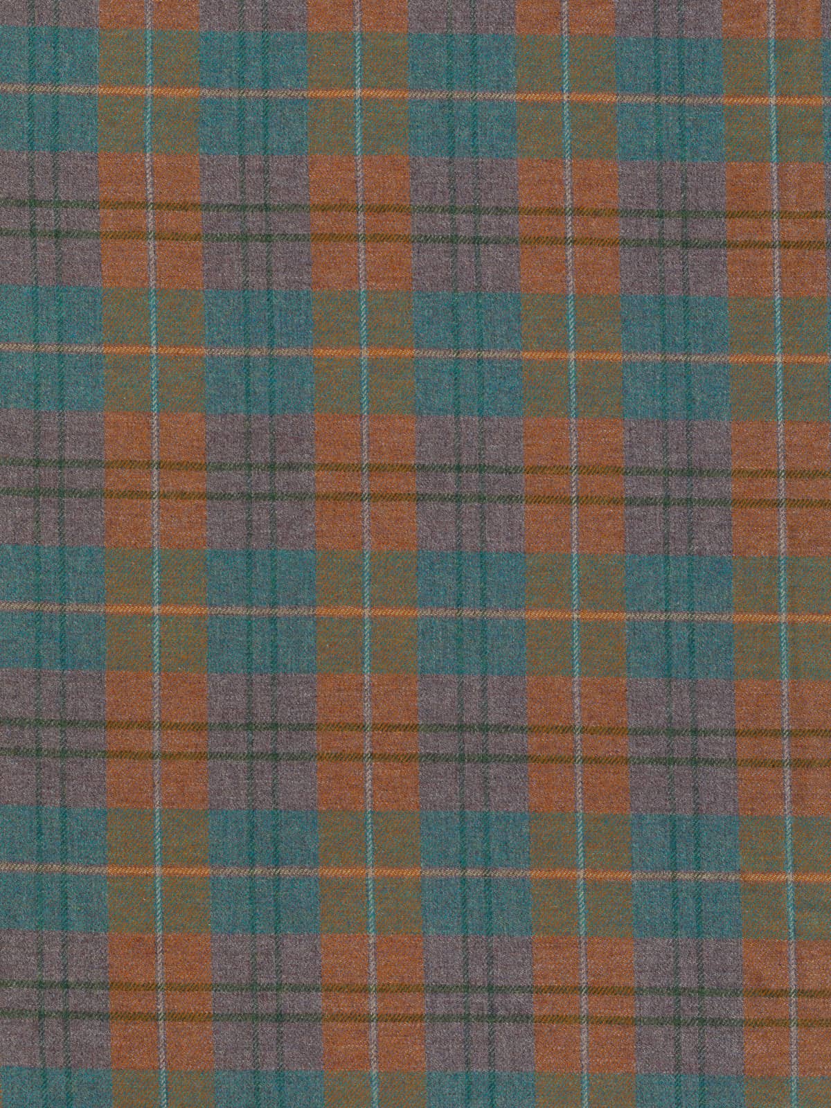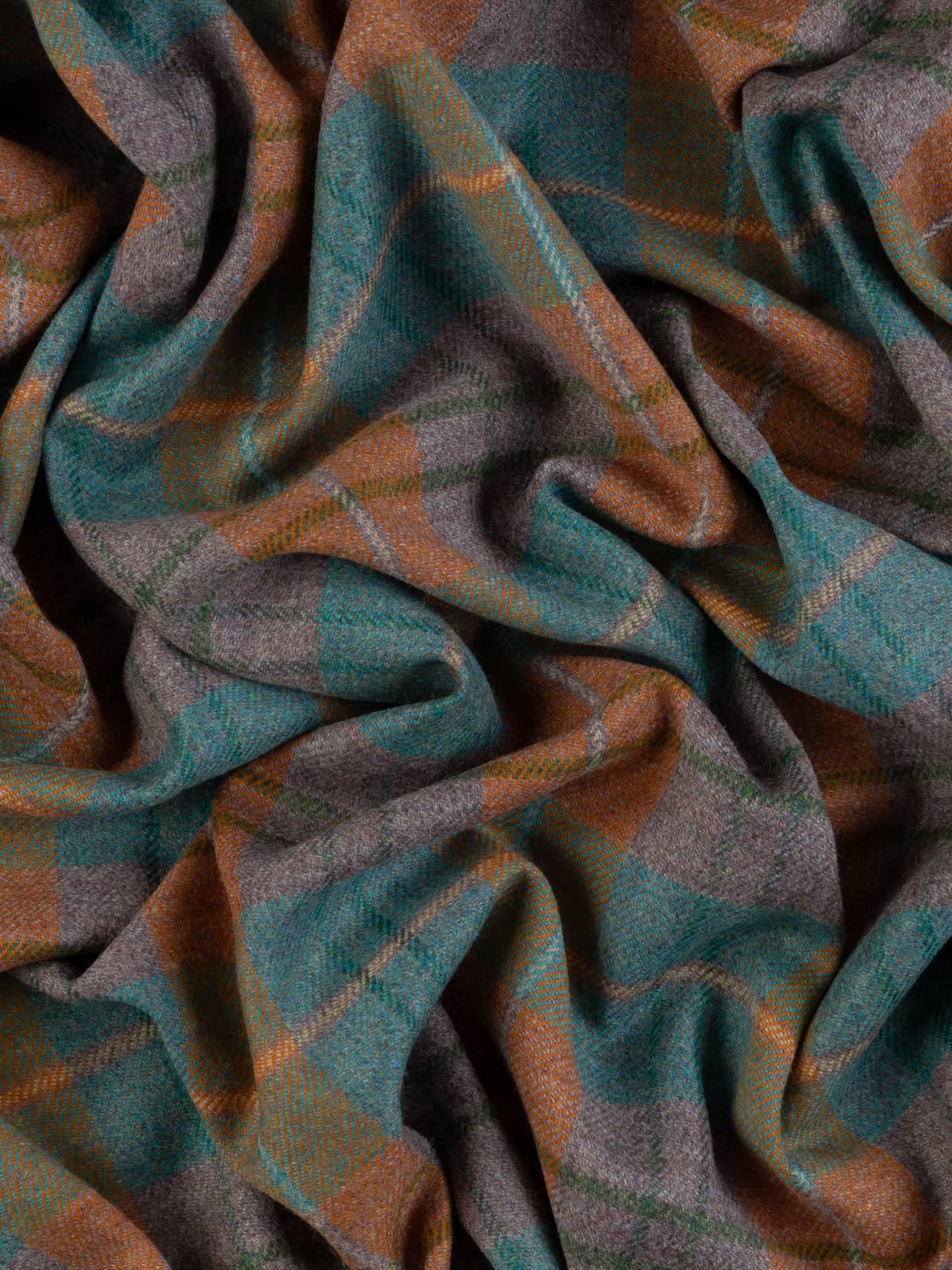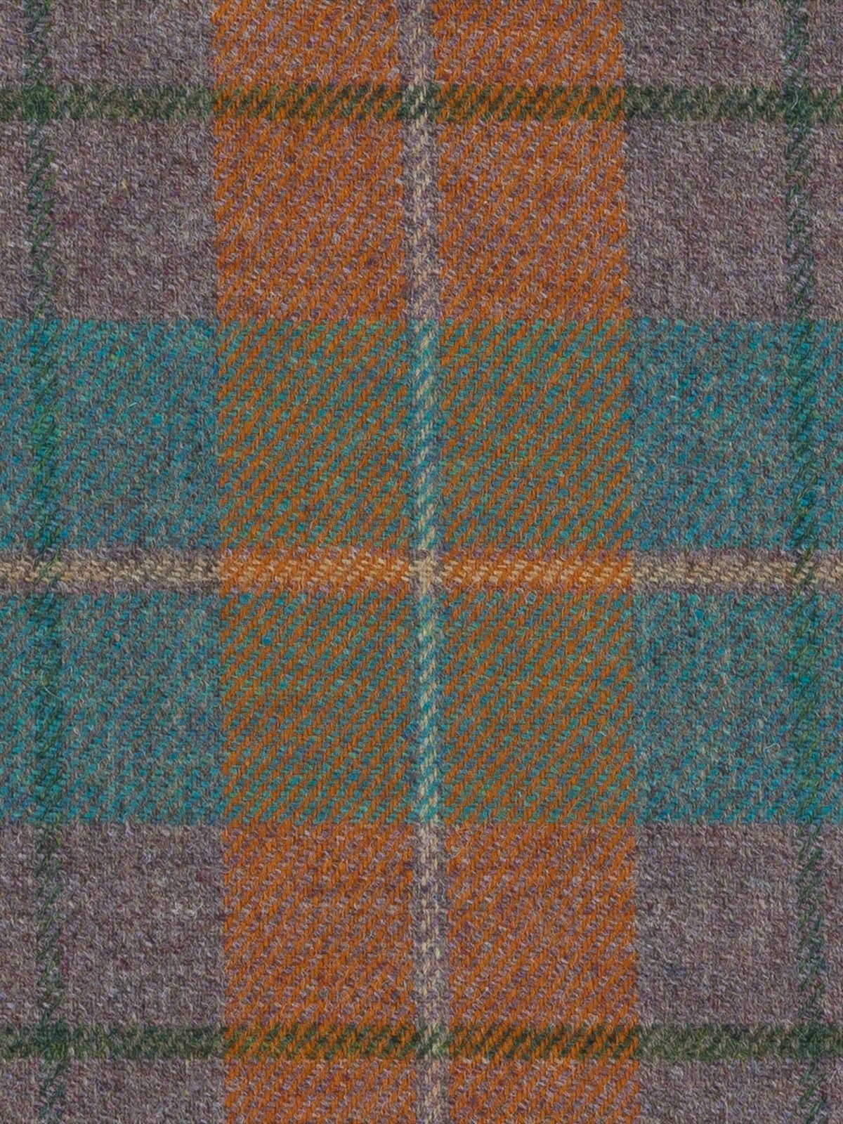 Shades: Woven in a heath-and-water-inspired palette, this plaid reflects the meeting of moorland earth and flowing stream. Rust-bracken and melanged heather-hued yarns form the foundational checks, grounding the fabric in warm, autumnal tones with softened grey undertones reminiscent of clouded skies over the moor.