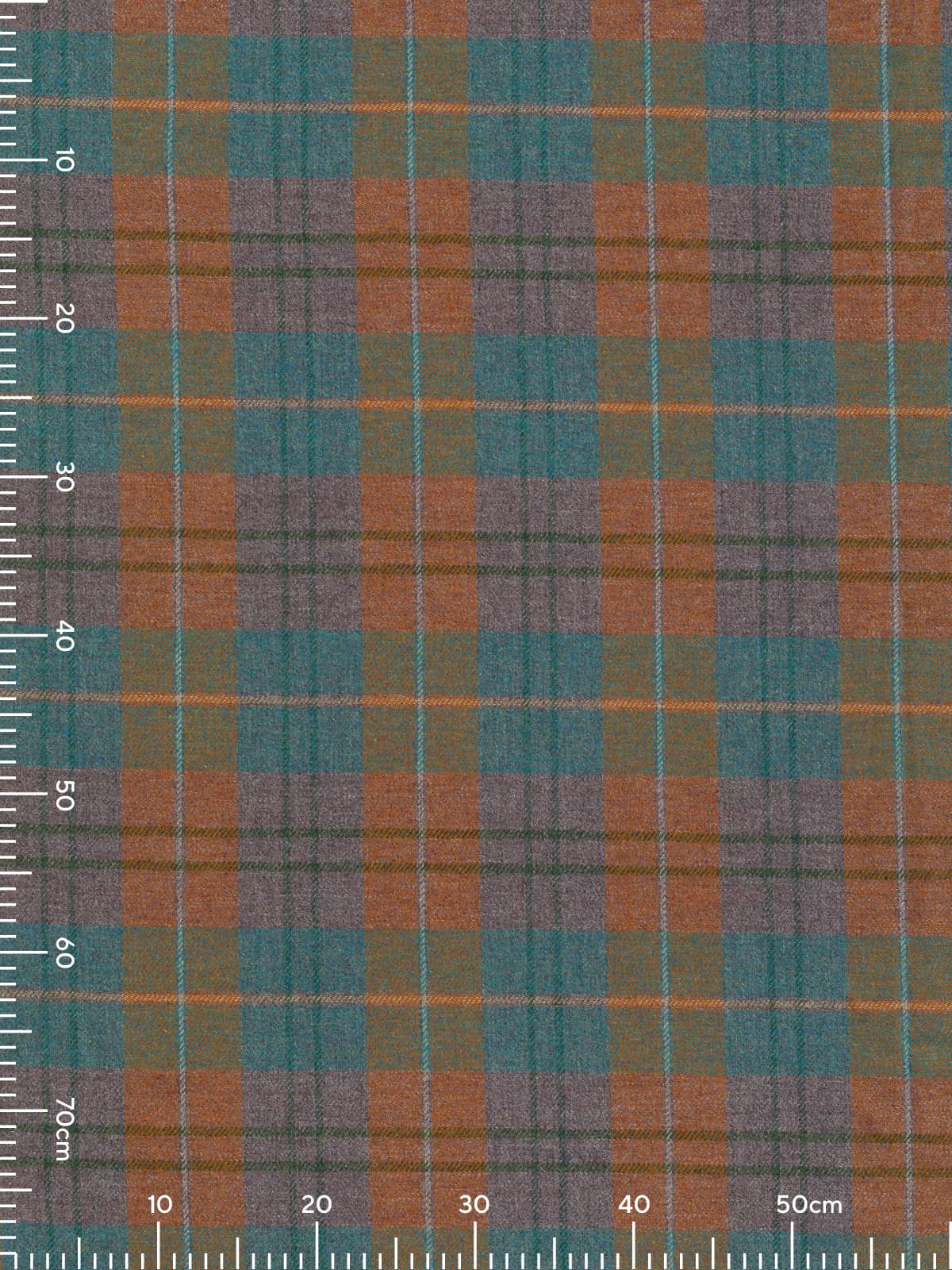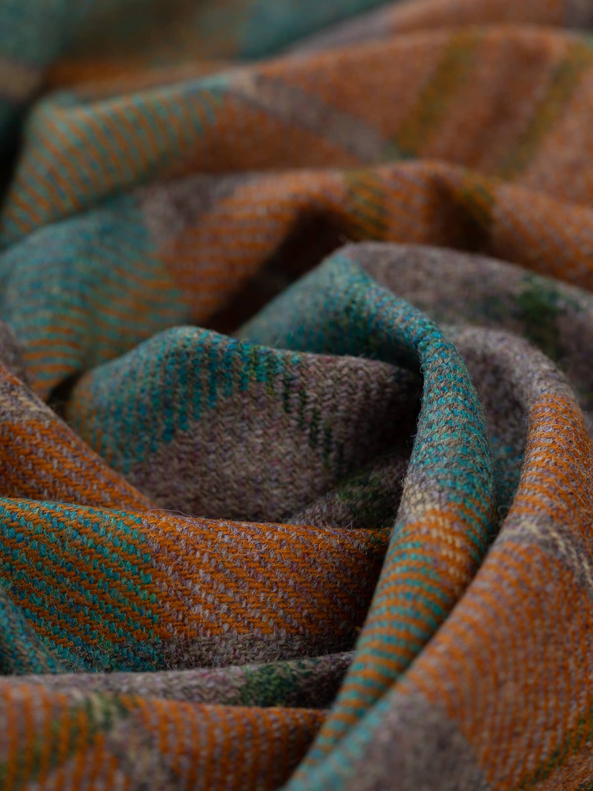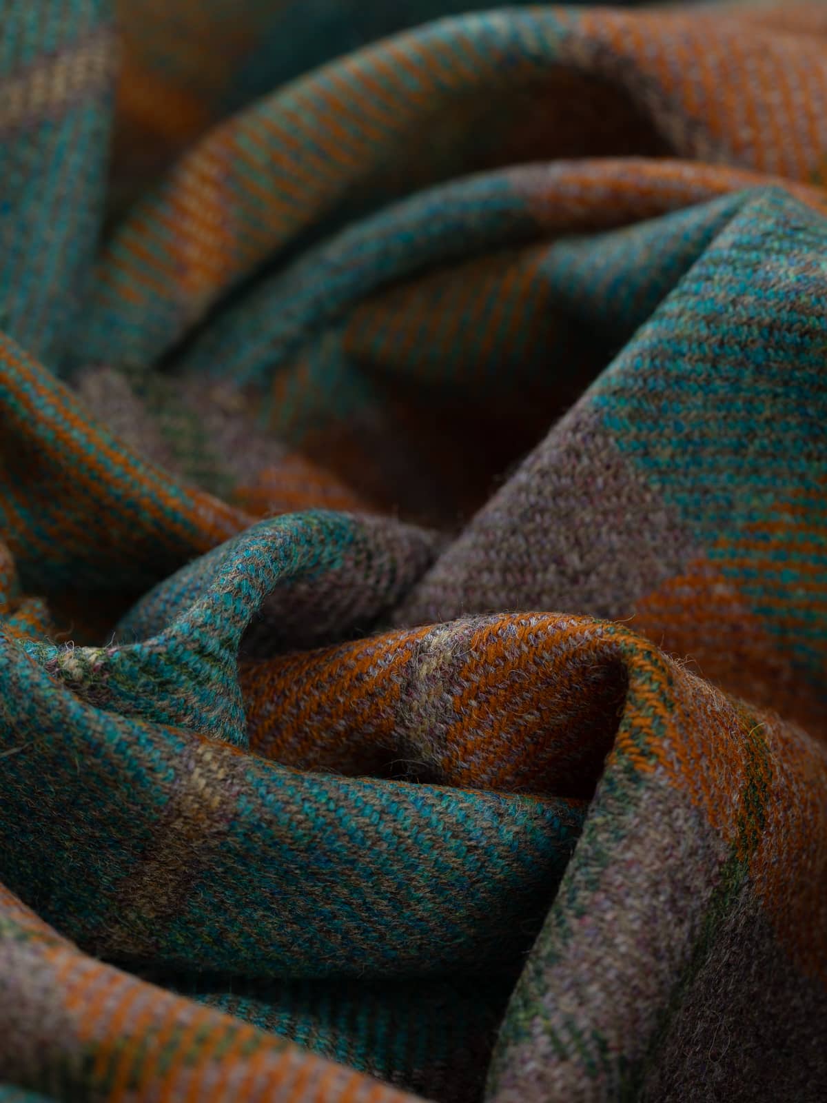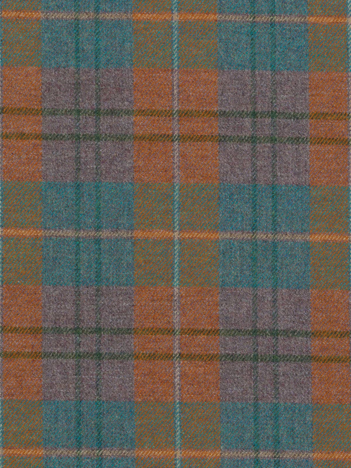 Shades: Woven in a heath-and-water-inspired palette, this plaid reflects the meeting of moorland earth and flowing stream. Rust-bracken and melanged heather-hued yarns form the foundational checks, grounding the fabric in warm, autumnal tones with softened grey undertones reminiscent of clouded skies over the moor.