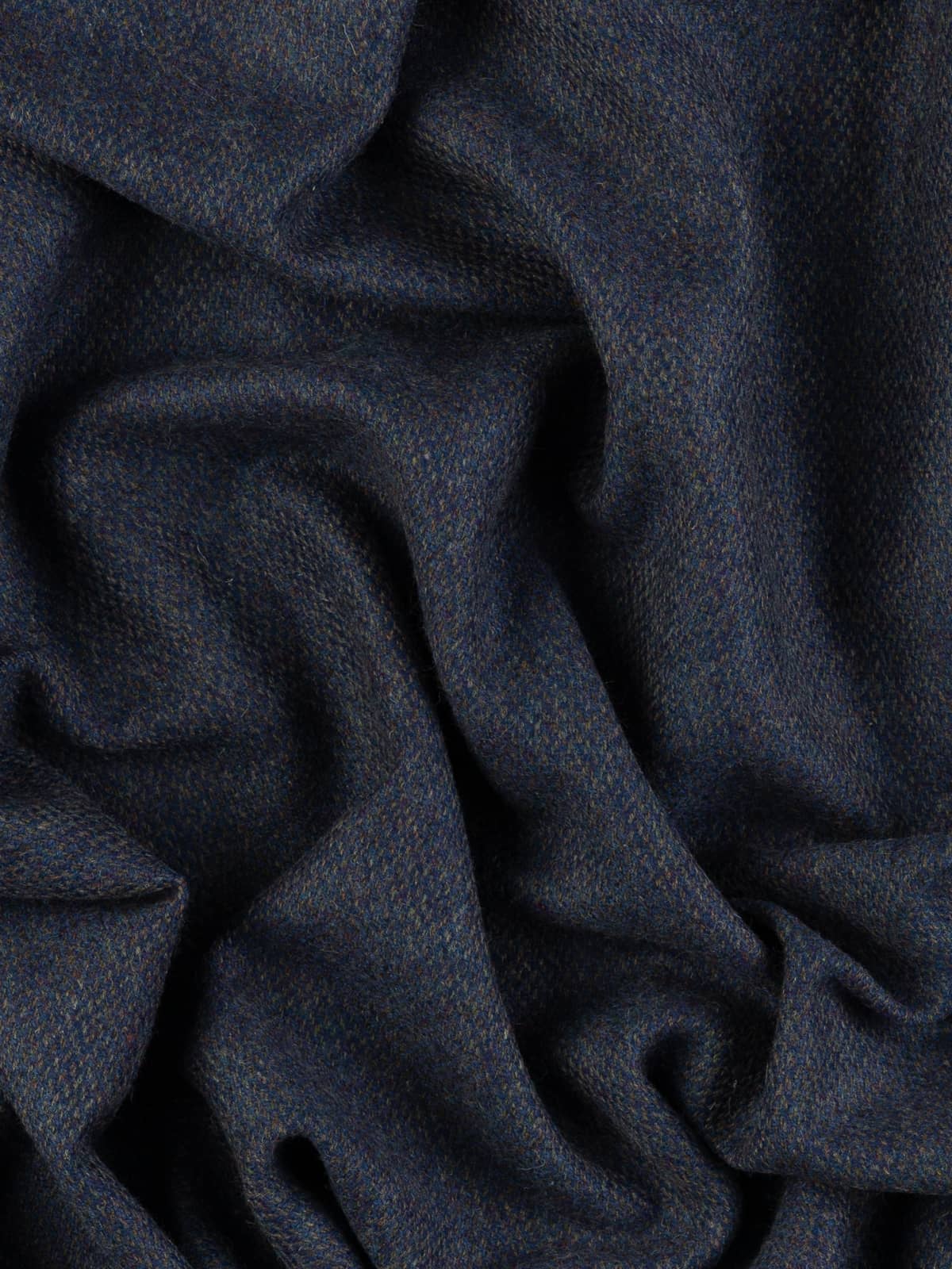 Shades: This superb Yorkshire Wool Tweed Barleycorn features a grounding grey-green melange warp, evoking weathered stone and mossy earth, while the accent weft introduces a rich blue with subtle purple undertones, reminiscent of spring bluebells carpeting the moorland valleys. Cool, calming and quietly expressive, this palette is perfect for versatile tailoring.