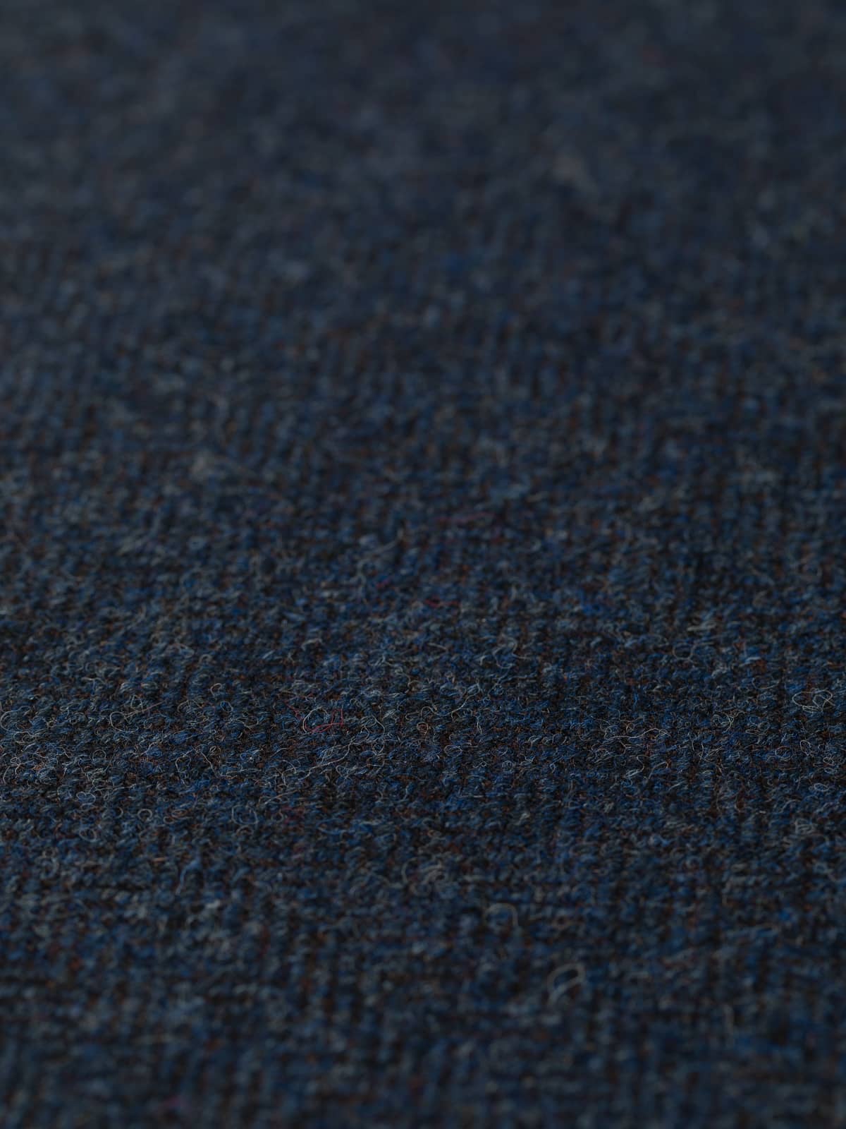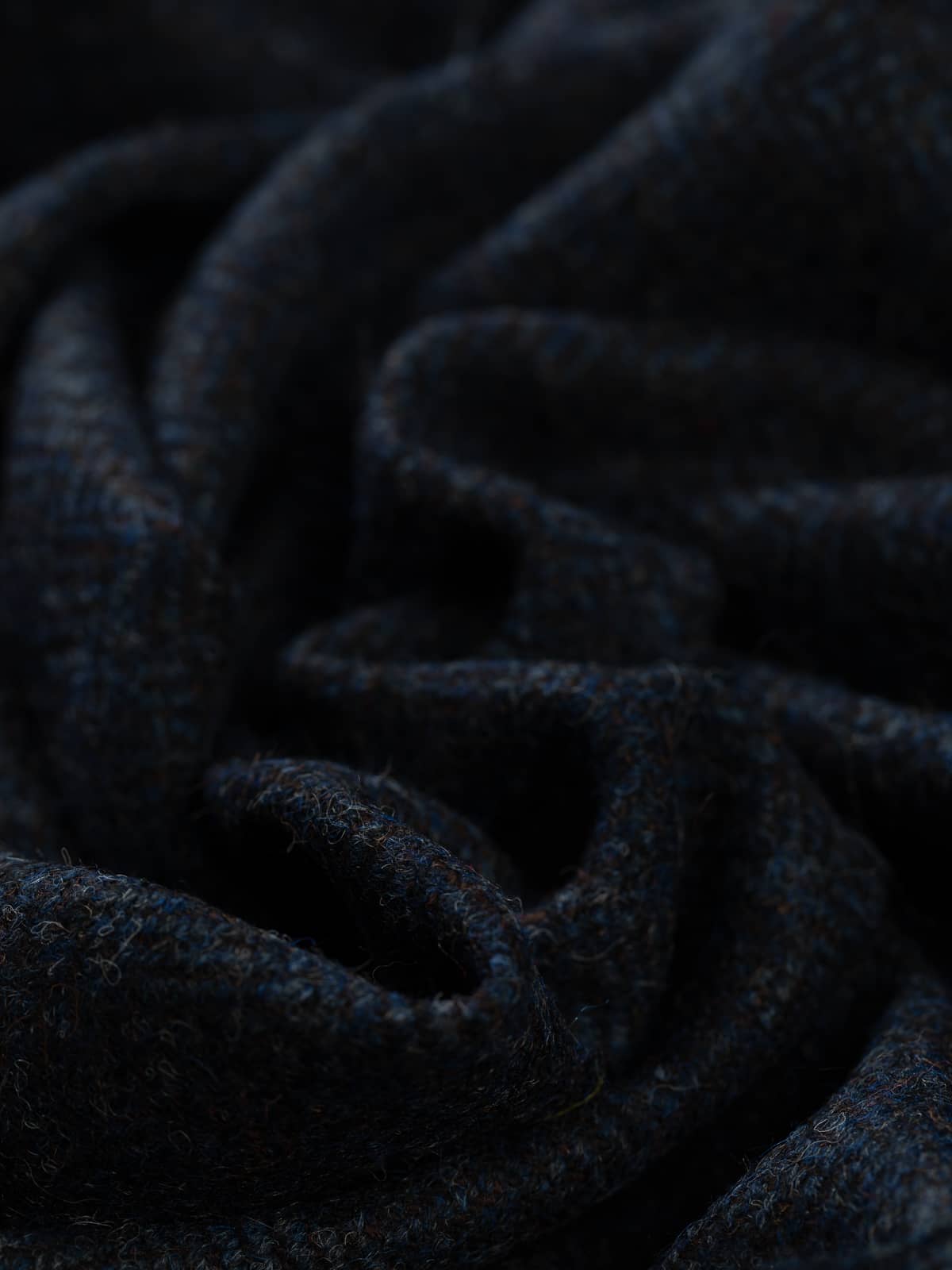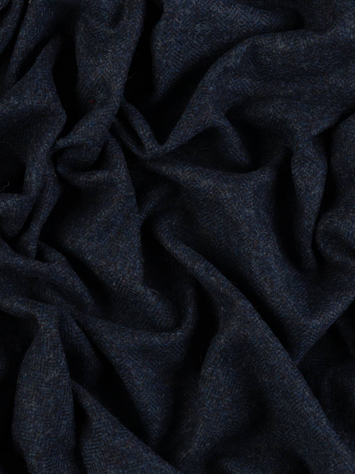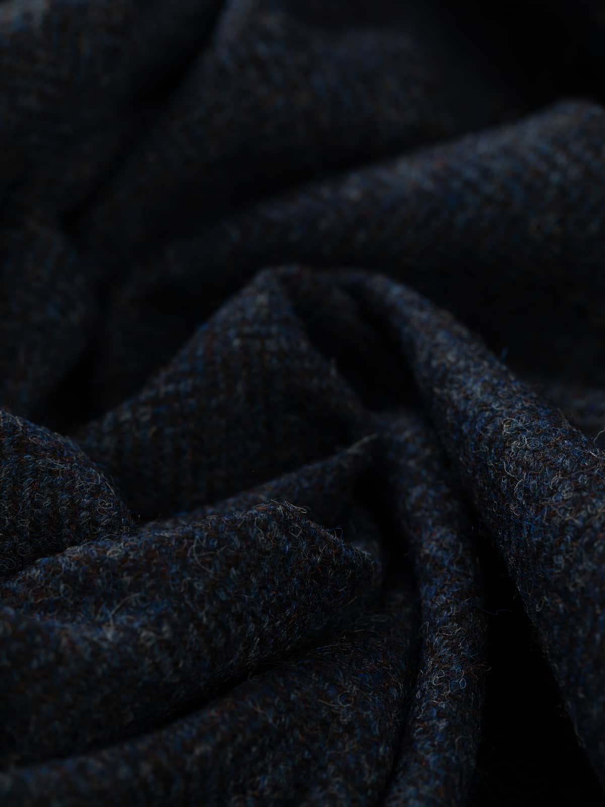 Shades: Bramblepond Tweed is a traditional medium-weight Yorkshire Wool Herringbone woven in an elemental, wilderness-inspired palette. The warp yarns form a dark, richly variegated base in tones of deep red, brown and glossy black, echoing ripening blackberries and elderberries tangled within bramble thickets. The weft yarns introduce the cool, reflective tones of still water, deep inky sapphire blended with shadowed black, which moves through the chevron weave. Fine, light, rustic wool fibres enhance the tweedy texture, giving natural depth and authenticity.
