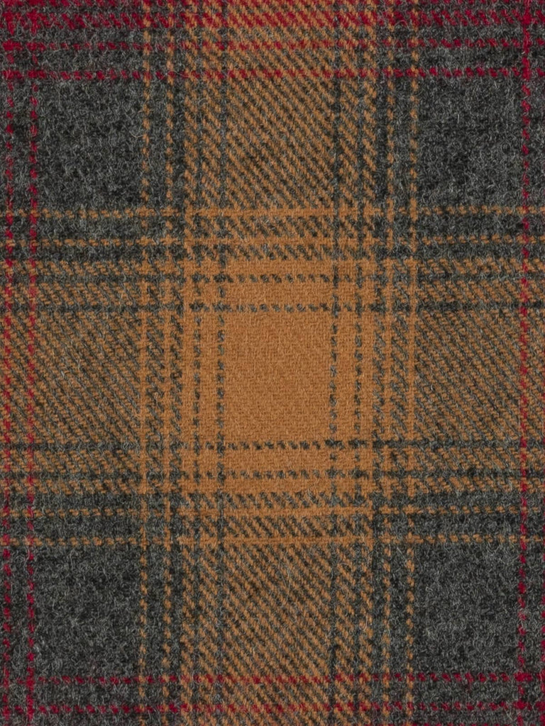 Shades: This sublime Yorkshire tweed check features a palette of fireside hues, glowing amongst the grey-green melange of a granite stone hearth. The warm glow of golden amber and burning ember red catches the eye with their diagonal twill lines echoing the spiralling tongues of a flaming fire.