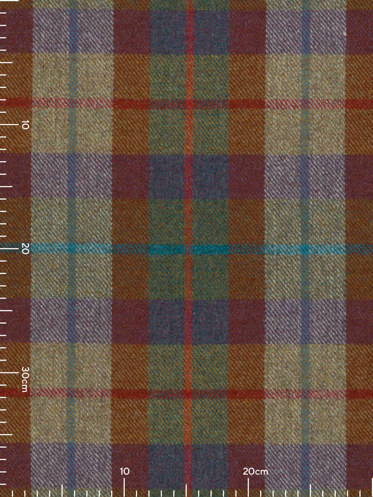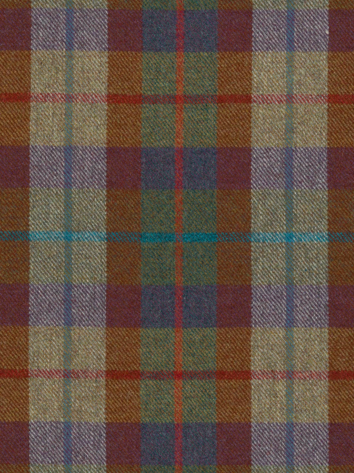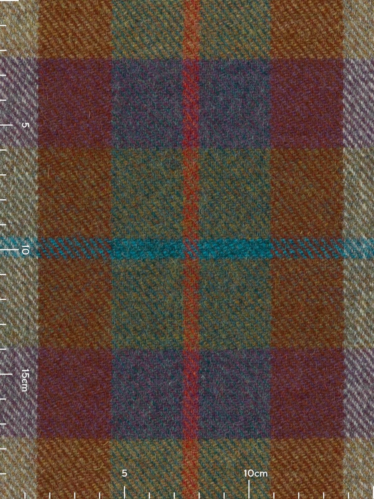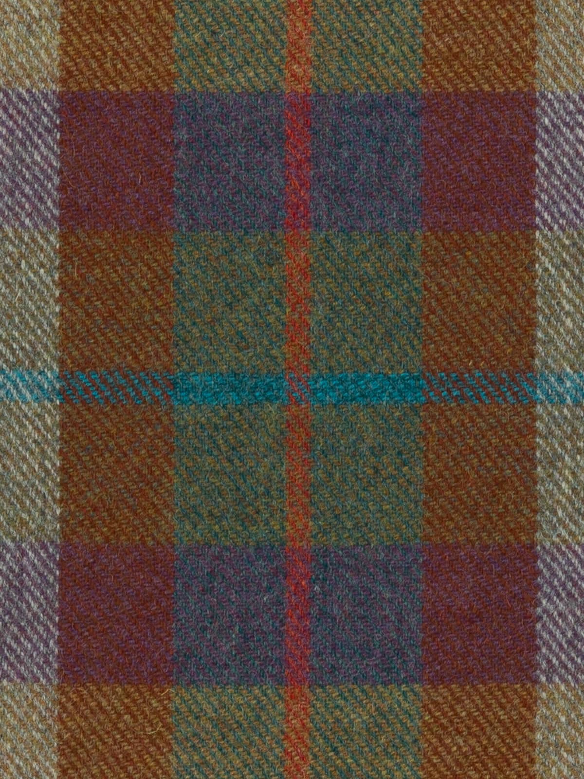 Shades: This classic Yorkshire Wool Tweed Plaid is woven in a thoughtfully layered palette of nature-inspired moorland hues. Loden green and warmer moss melange form an organic, softly varied base, infused with golden, sun-touched tones, while a hint of heather purple adds a distinctive Yorkshire character. A confident overplaid of bracken rust, fox red and mist grey is lifted with vivid flashes of kingfisher blue, creating depth, movement and contrast. The result is a beautifully balanced palette that feels authentic, timeless and quietly contemporary.