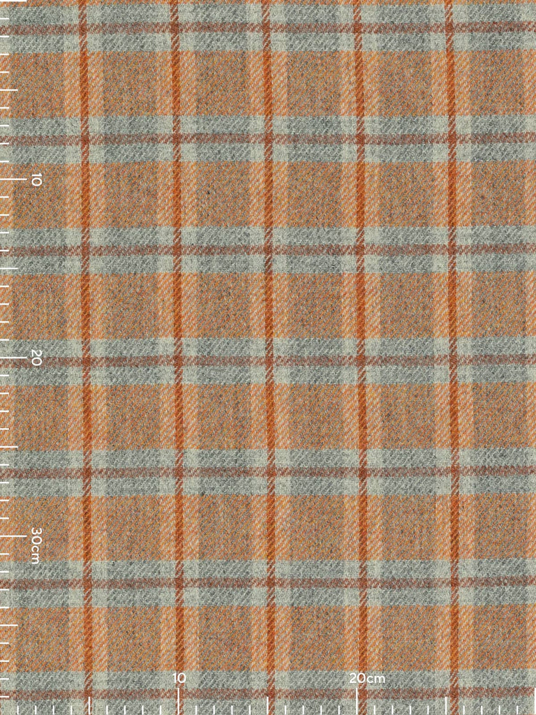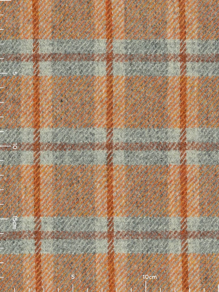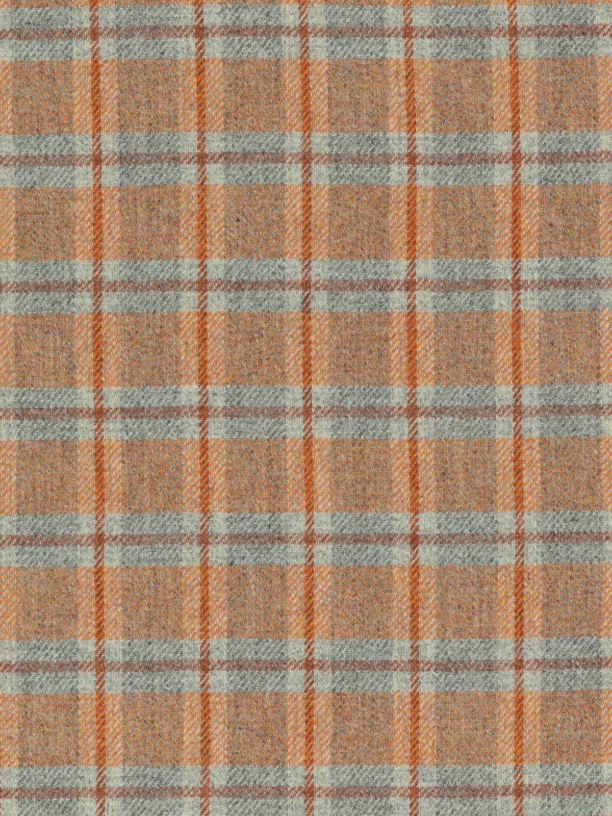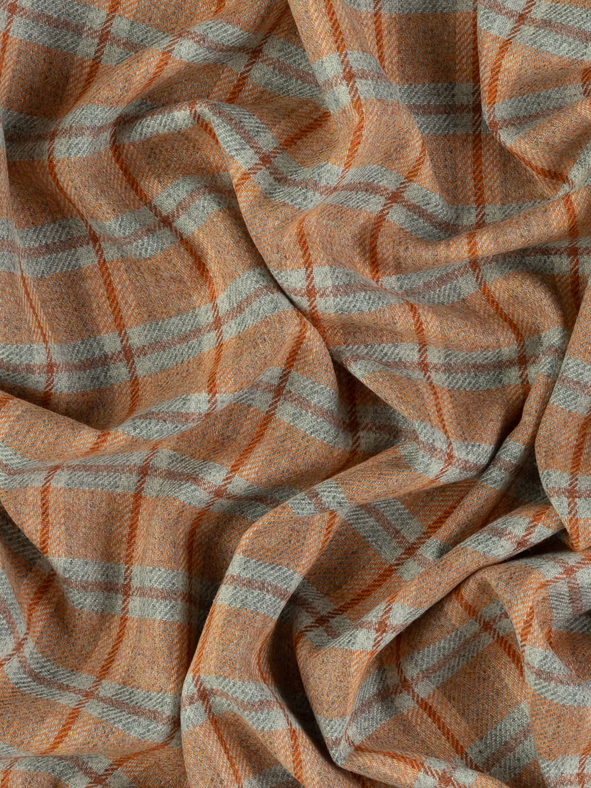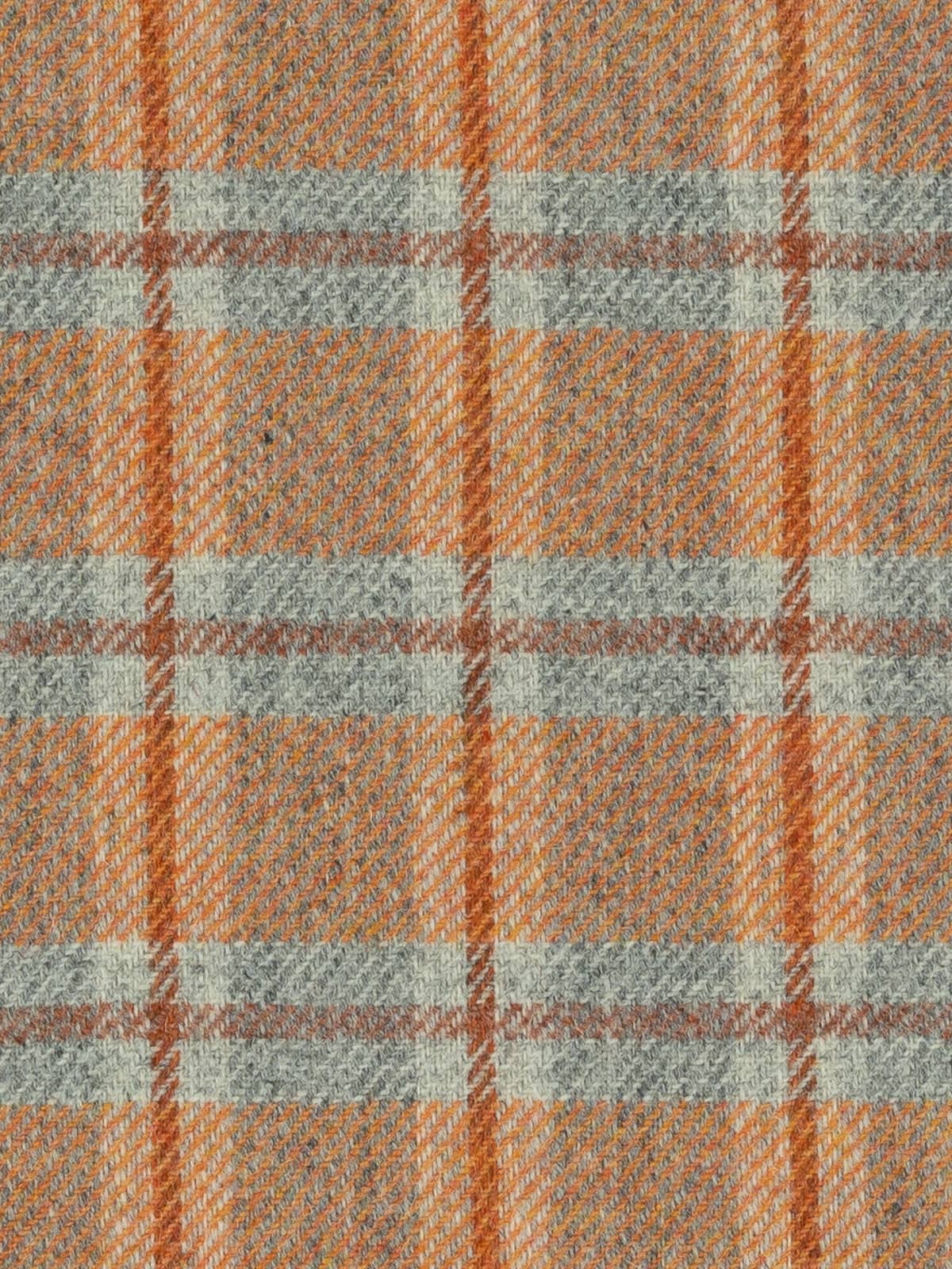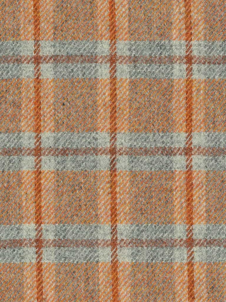 Shades: Ember View is a bold, heritage-inspired wool tweed that captures the warmth and drama of a glowing horizon. It evokes the moment when day fades into night, sunset blazing across grey valleys, hearth embers glowing in cedarwood beams, sunlight softening stone walls. Its marled grey base provides a grounded, stone-like foundation, while a mélange yarn of fiery sunset orange tones infuses the fabric with energy and vibrancy. A cedarwood-hued windowpane check overlays the design, adding structure and resonance, balancing rustic warmth with refined sophistication. Cool grey flanks the cedarwood accents of the windowpane overcheck and suggests the fogged windows of a homely retreat.