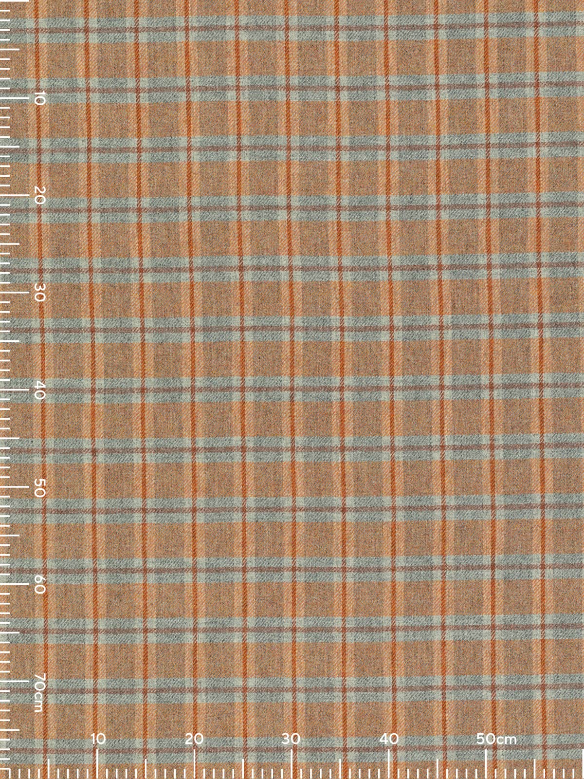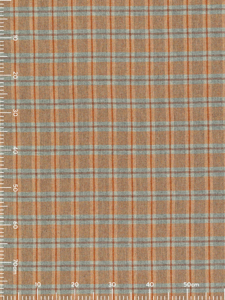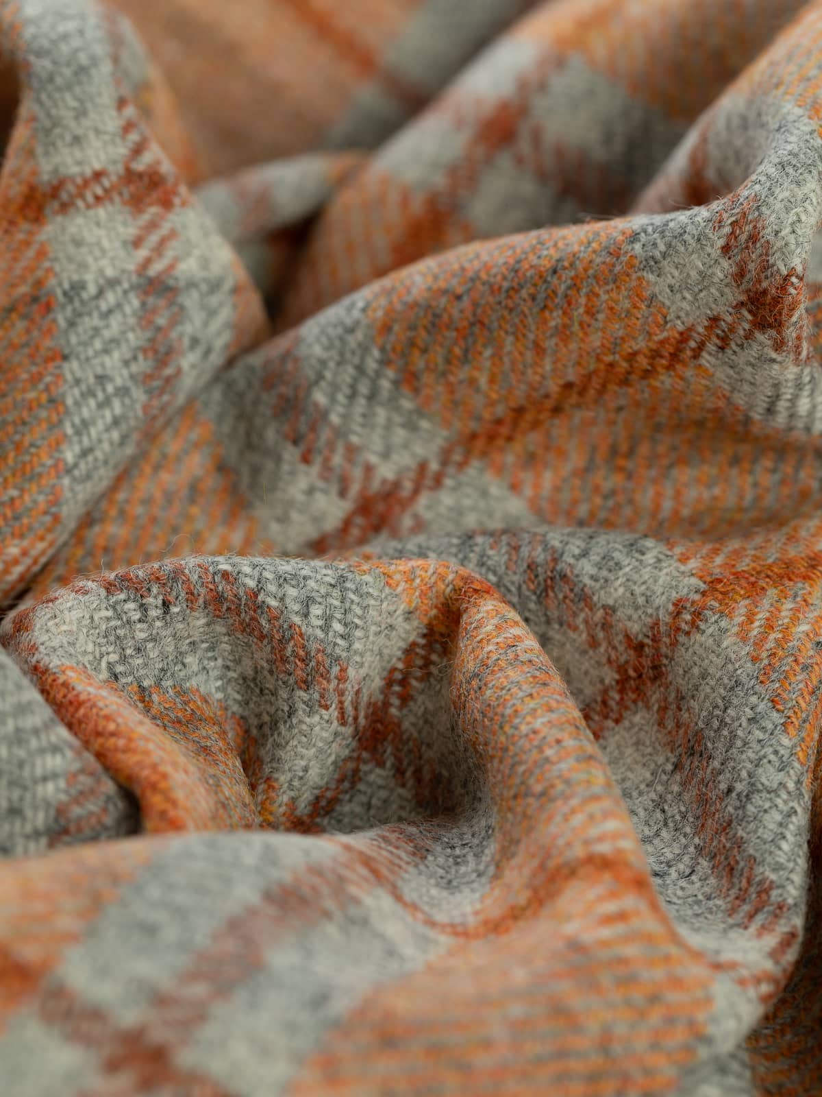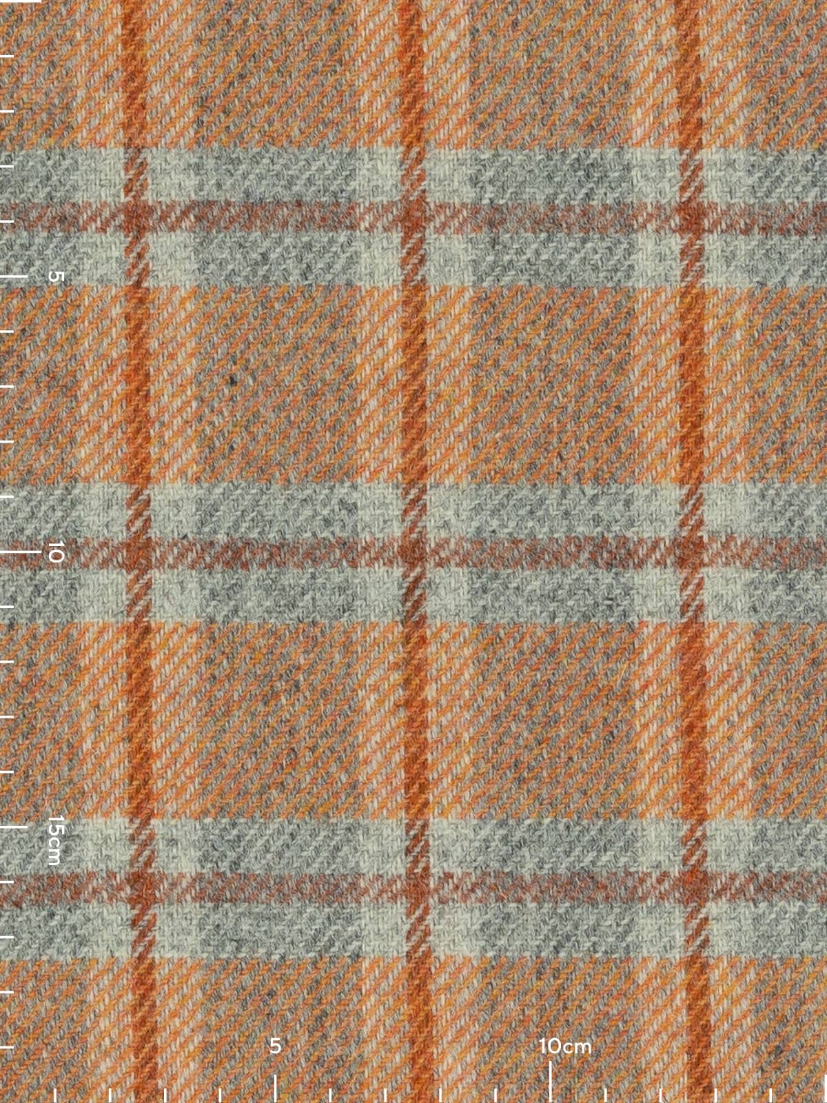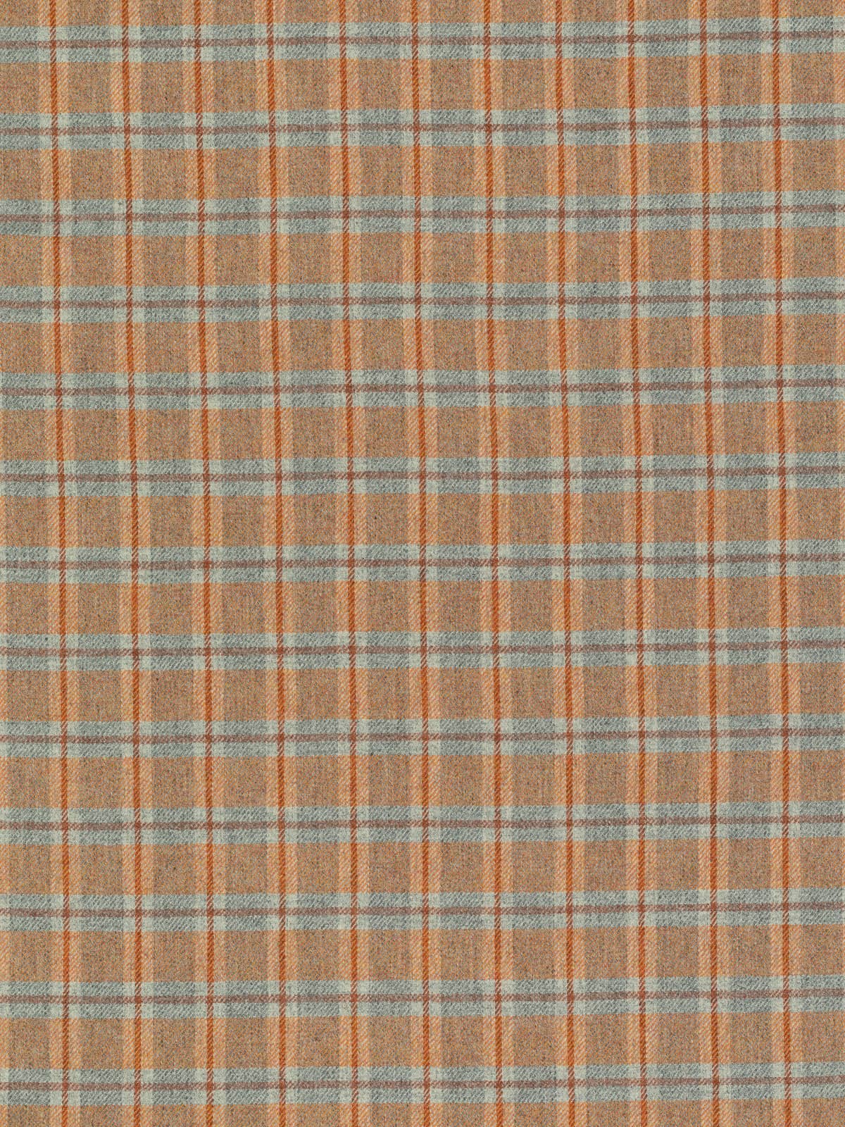 Shades: Ember View is a bold, heritage-inspired wool tweed that captures the warmth and drama of a glowing horizon. It evokes the moment when day fades into night, sunset blazing across grey valleys, hearth embers glowing in cedarwood beams, sunlight softening stone walls. Its marled grey base provides a grounded, stone-like foundation, while a mélange yarn of fiery sunset orange tones infuses the fabric with energy and vibrancy. A cedarwood-hued windowpane check overlays the design, adding structure and resonance, balancing rustic warmth with refined sophistication. Cool grey flanks the cedarwood accents of the windowpane overcheck and suggests the fogged windows of a homely retreat.